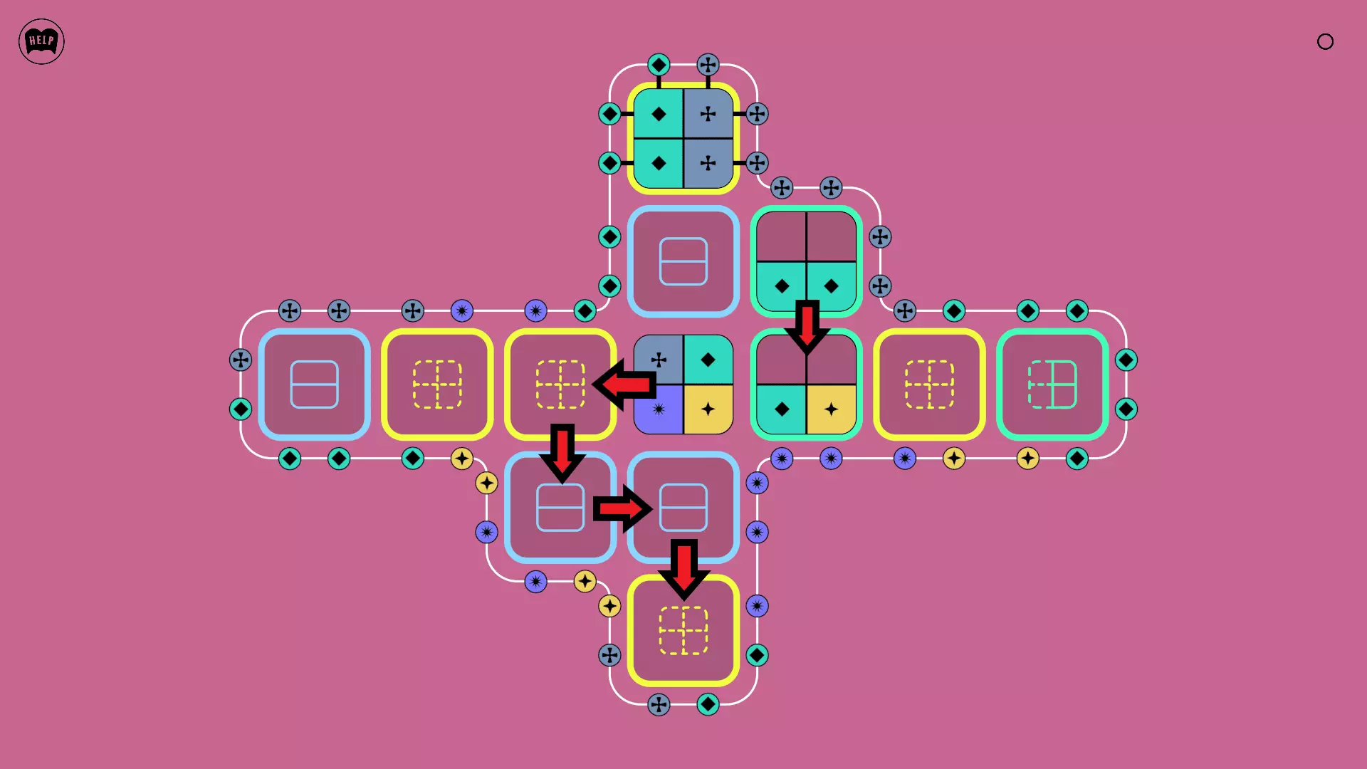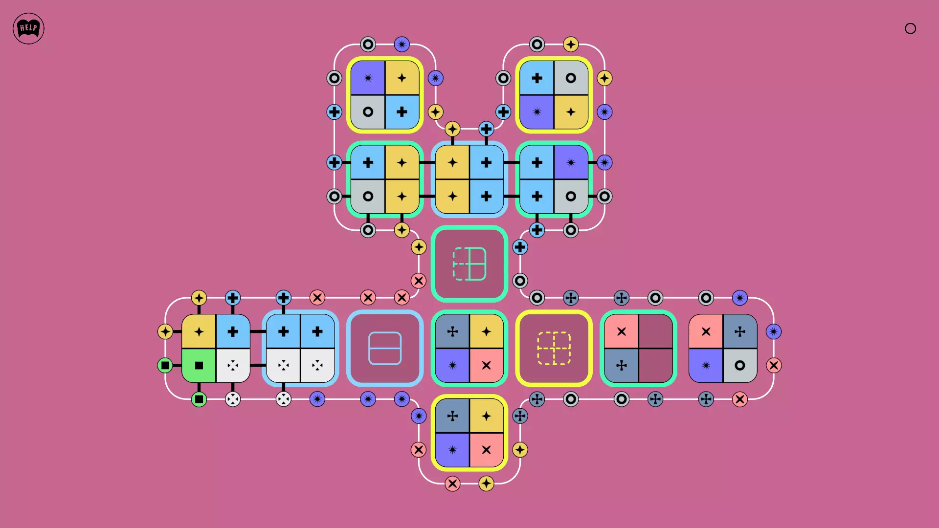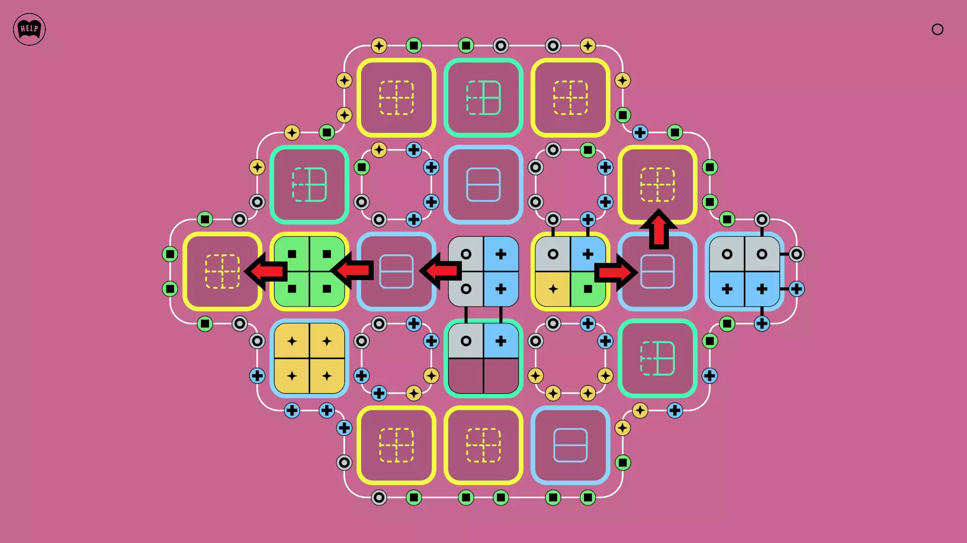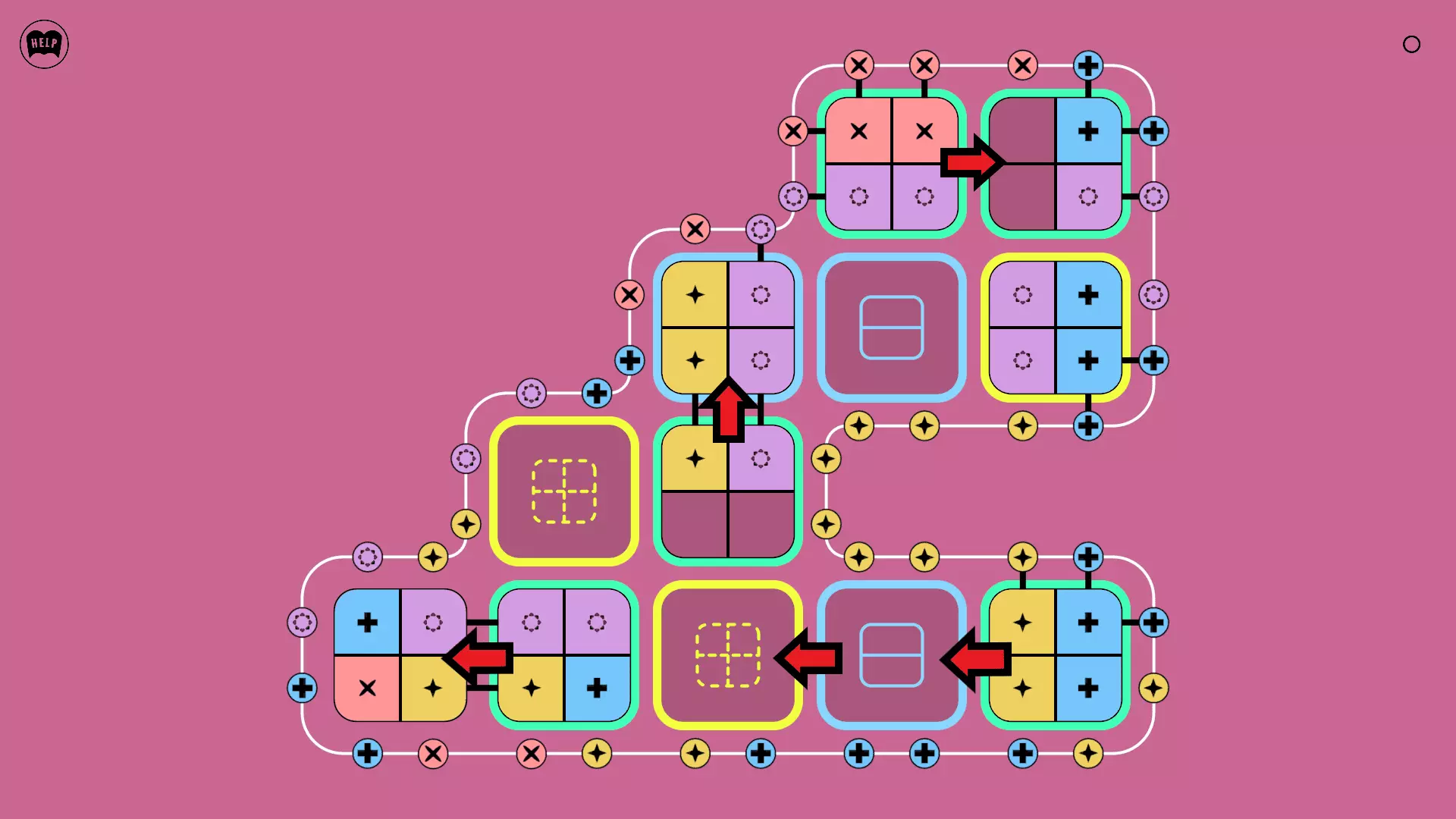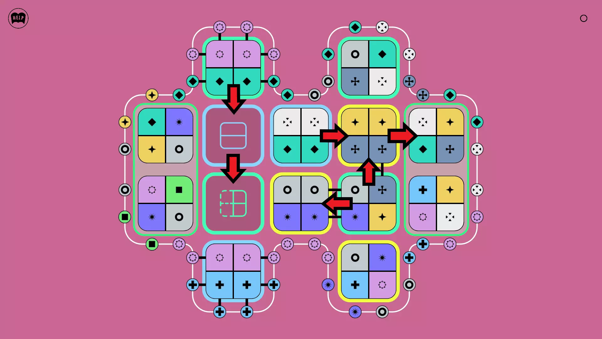 《Lines On Sides》关卡71-84图文攻略 简介 前18个关卡仅提供解决方案,因为解决这些关卡只需旋转或交换方块。 第19关及后续关卡包含步骤说明,解释如何分割、复制和转移方块。 由于Steam的限制,我不得不将本攻略分为两部分。 规则 旋转方块,直到方块上的图标与线条上或相邻方块上的符号匹配。当符号匹配时,它们之间会绘制一条线。 第7关引入了交换被绿线圈住的方块的功能。第14关新增了无法旋转或移动的方块,这类方块外有粗黑线环绕。 第19关新增了分裂平台,该平台外有蓝色线条环绕。此平台可将方块分裂为两个,或将两个方块合并为一个。