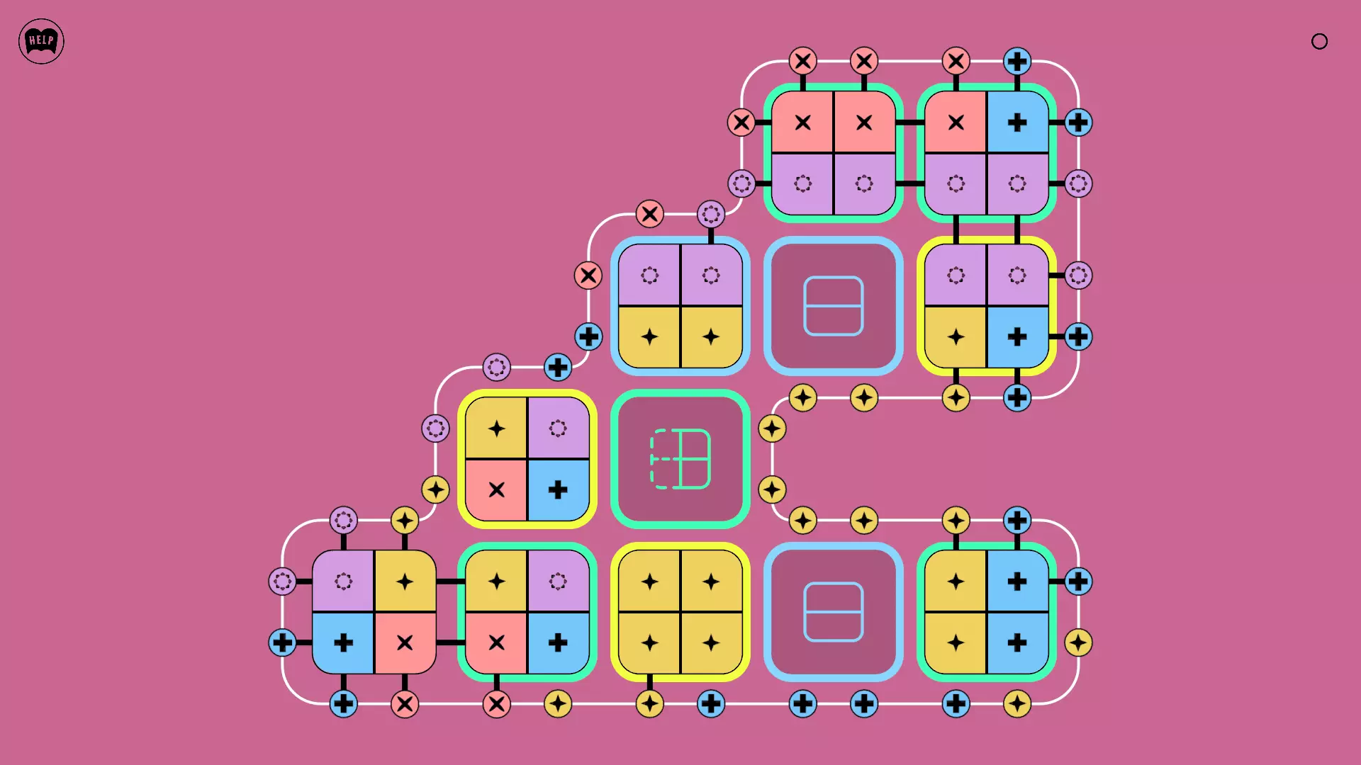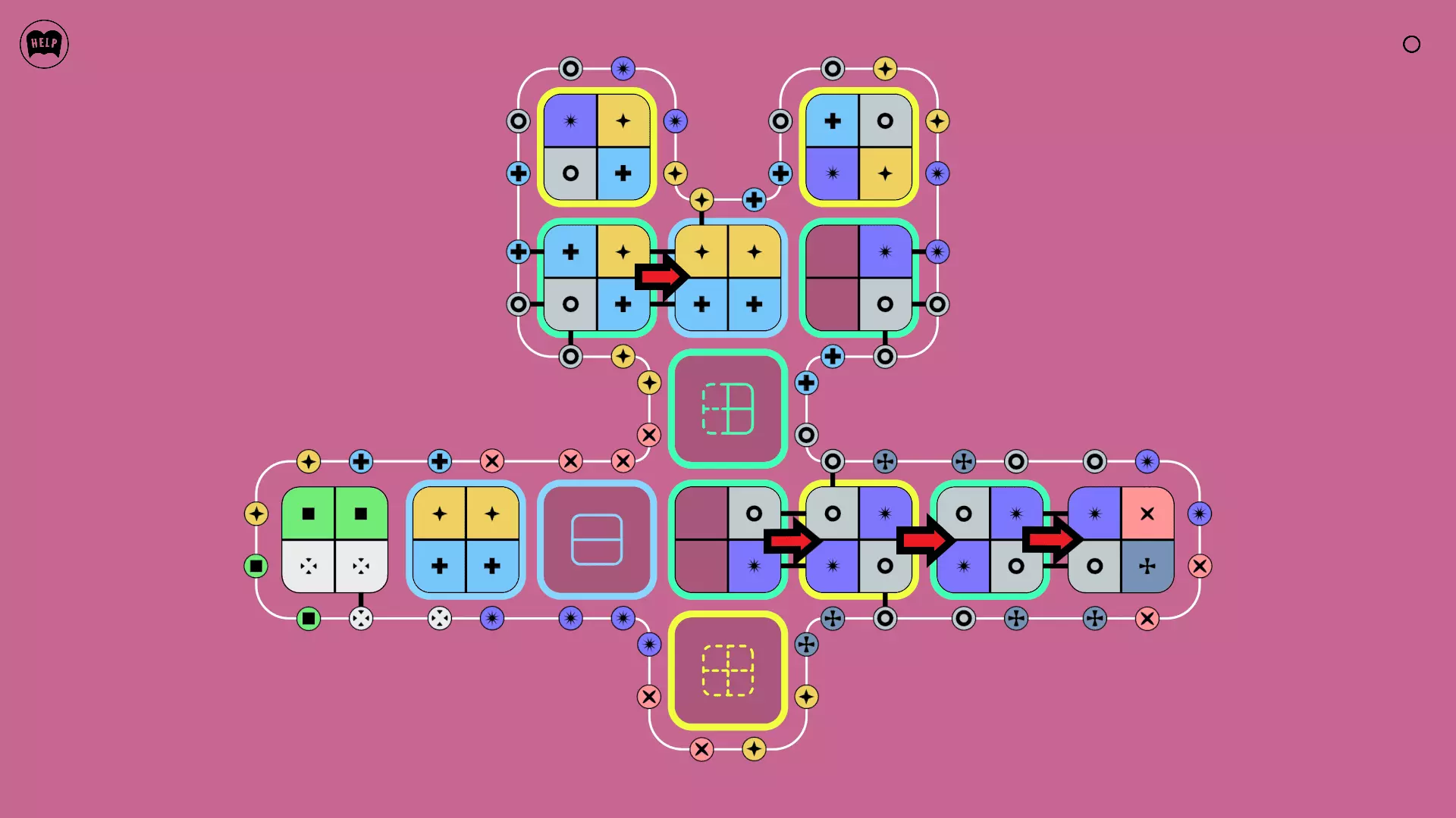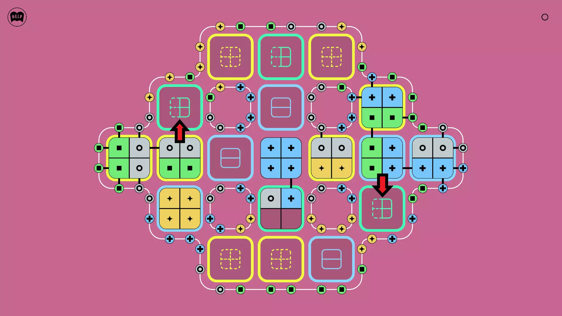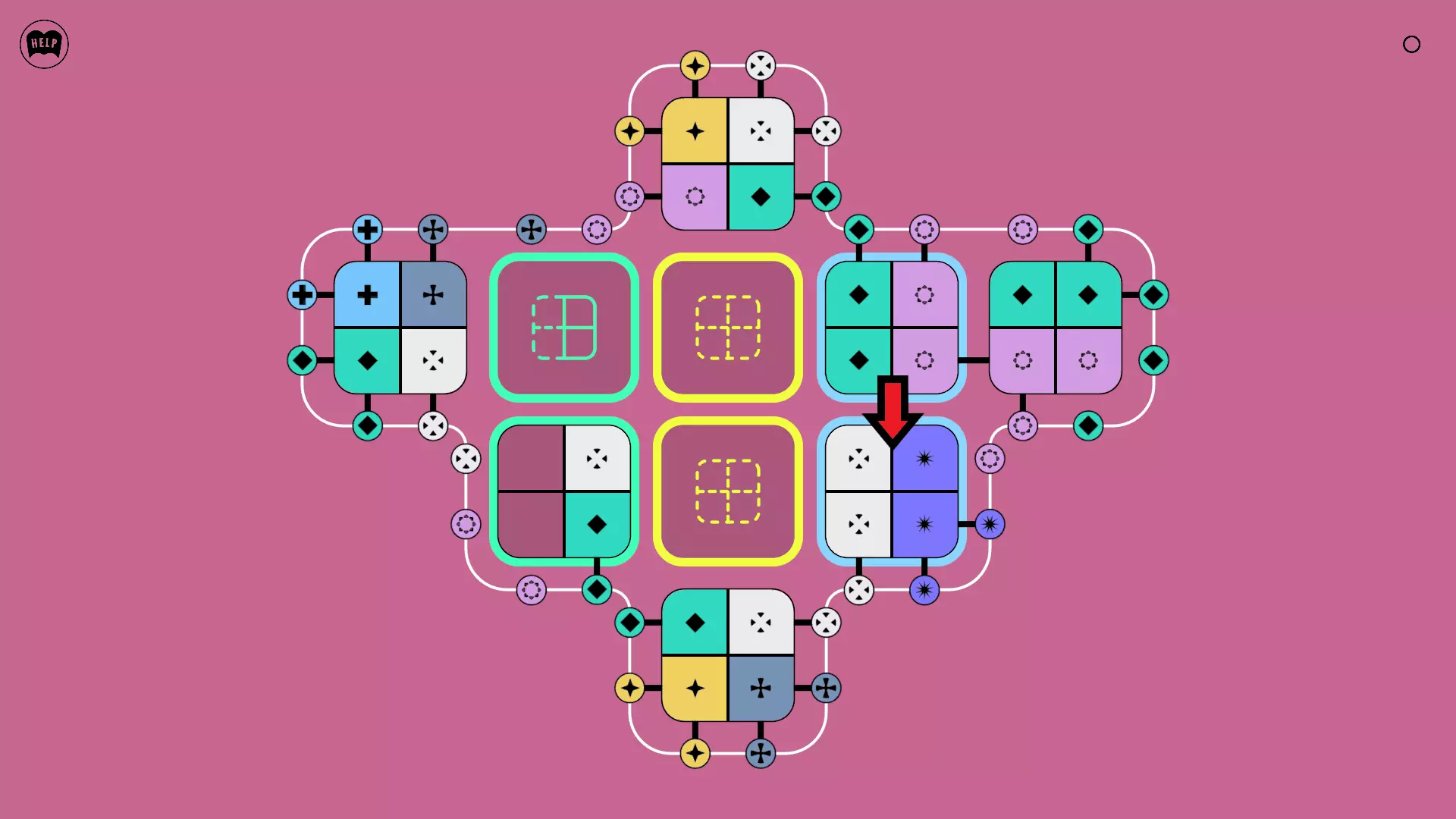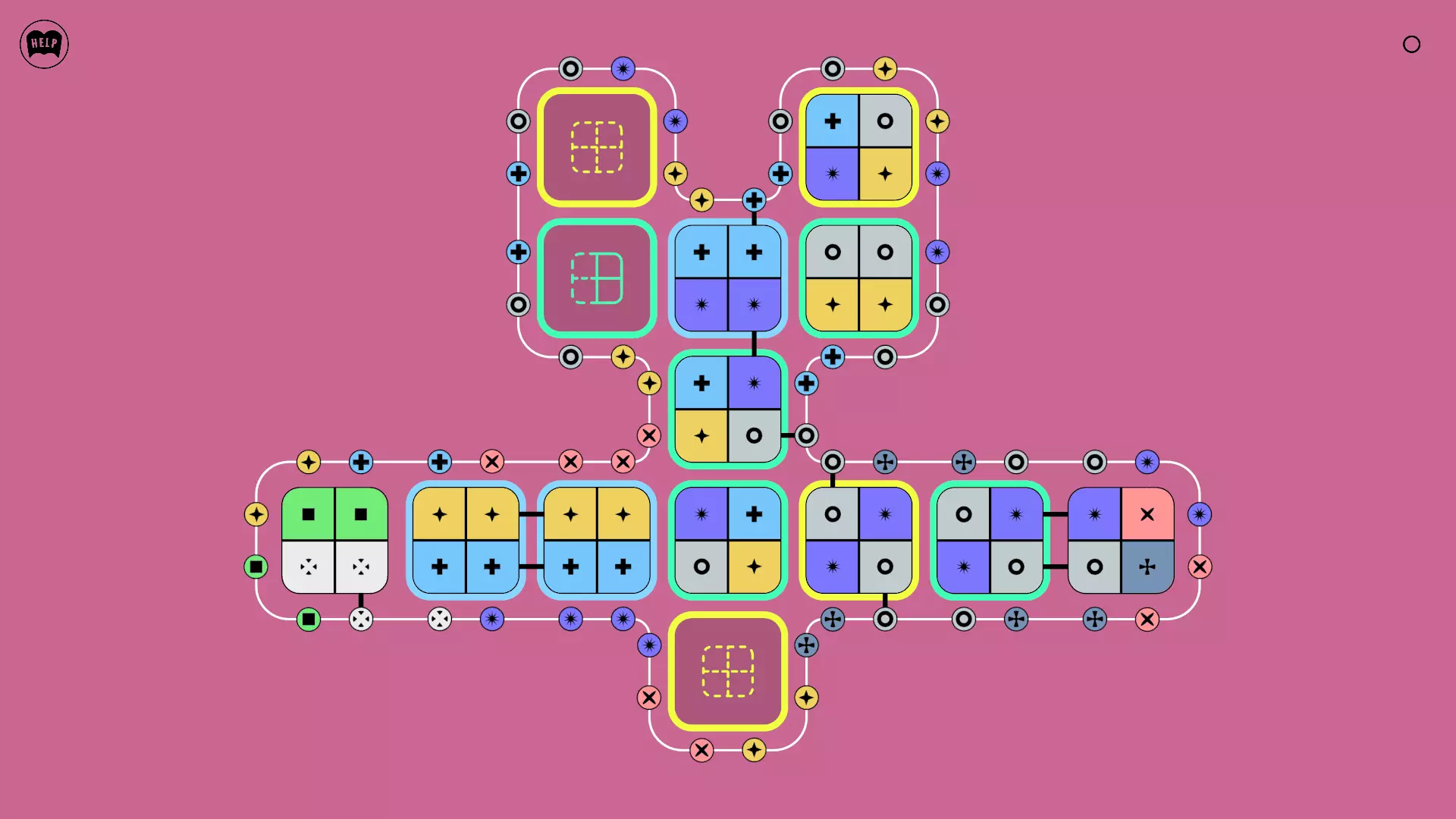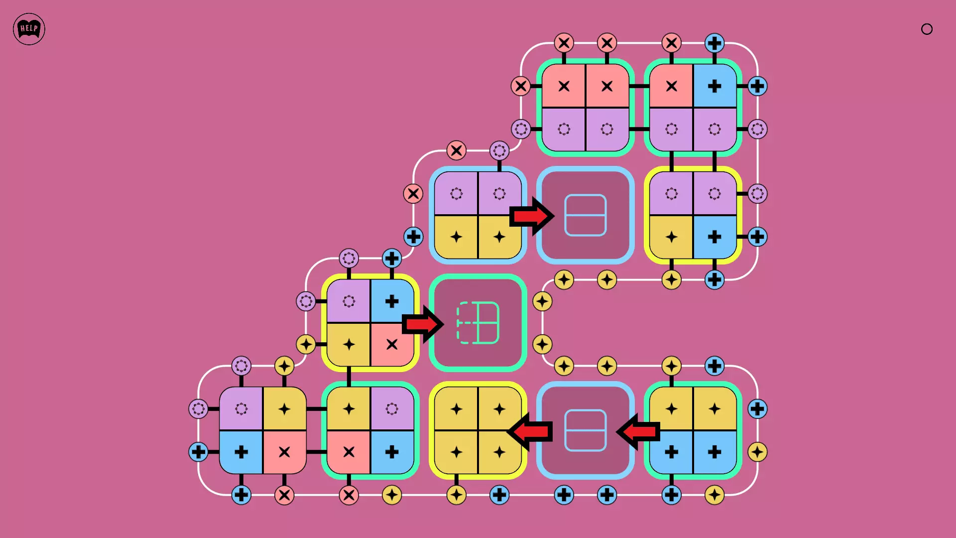 《Lines On Sides》关卡71-84图文攻略 简介 前18个关卡仅提供解决方案,因为解决这些关卡只需旋转或交换方块。 第19关及后续关卡包含步骤说明,解释如何分割、复制和转移方块。 由于Steam的限制,我不得不将本攻略分为两部分。 规则 旋转方块,直到方块上的图标与线条上或相邻方块上的符号匹配。当符号匹配时,它们之间会绘制一条线。 第7关引入了交换被绿线圈住的方块的功能。第14关新增了无法旋转或移动的方块,这类方块外有粗黑线环绕。 第19关新增了分裂平台,该平台外有蓝色线条环绕。此平台可将方块分裂为两个,或将两个方块合并为一个。