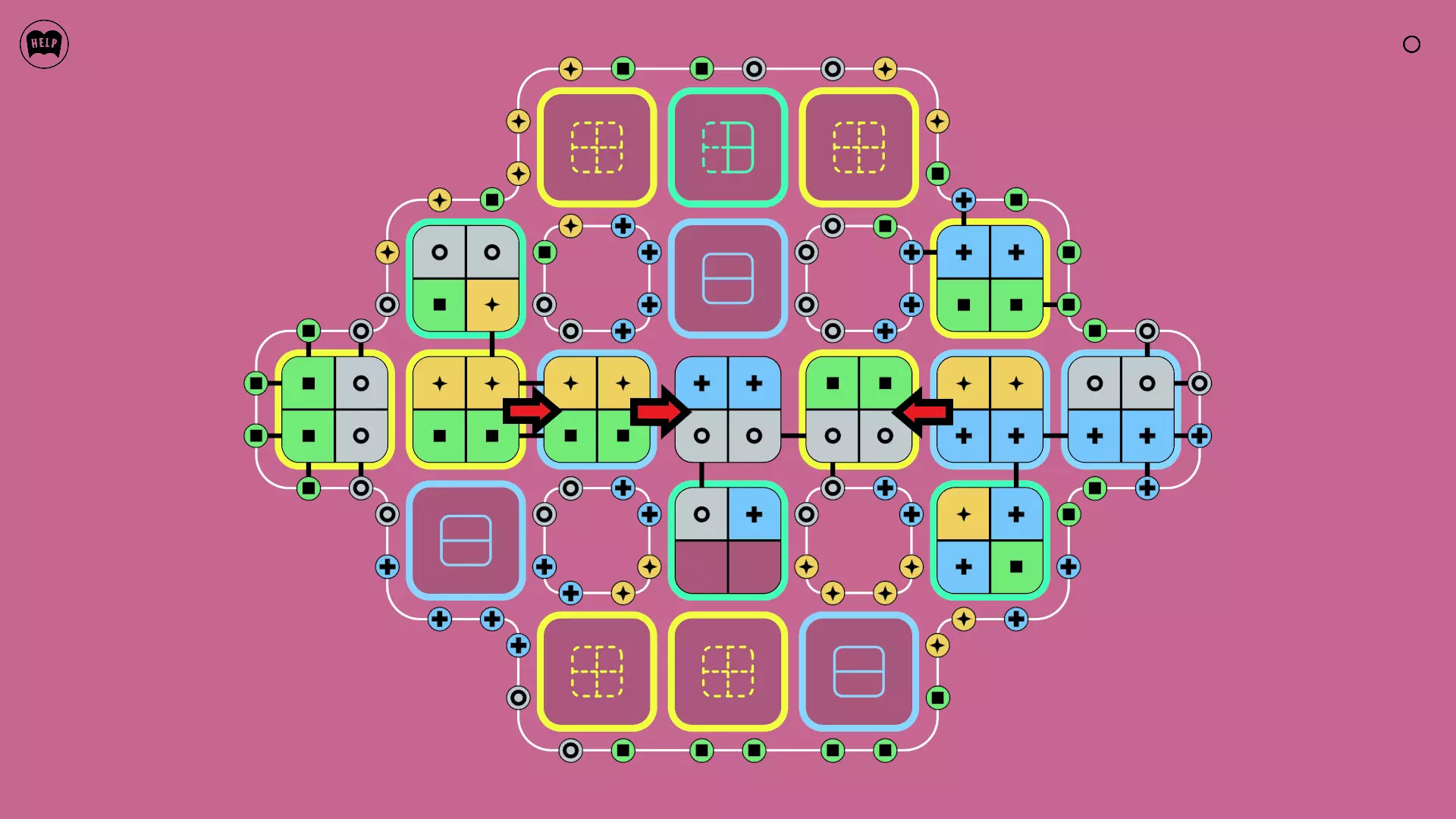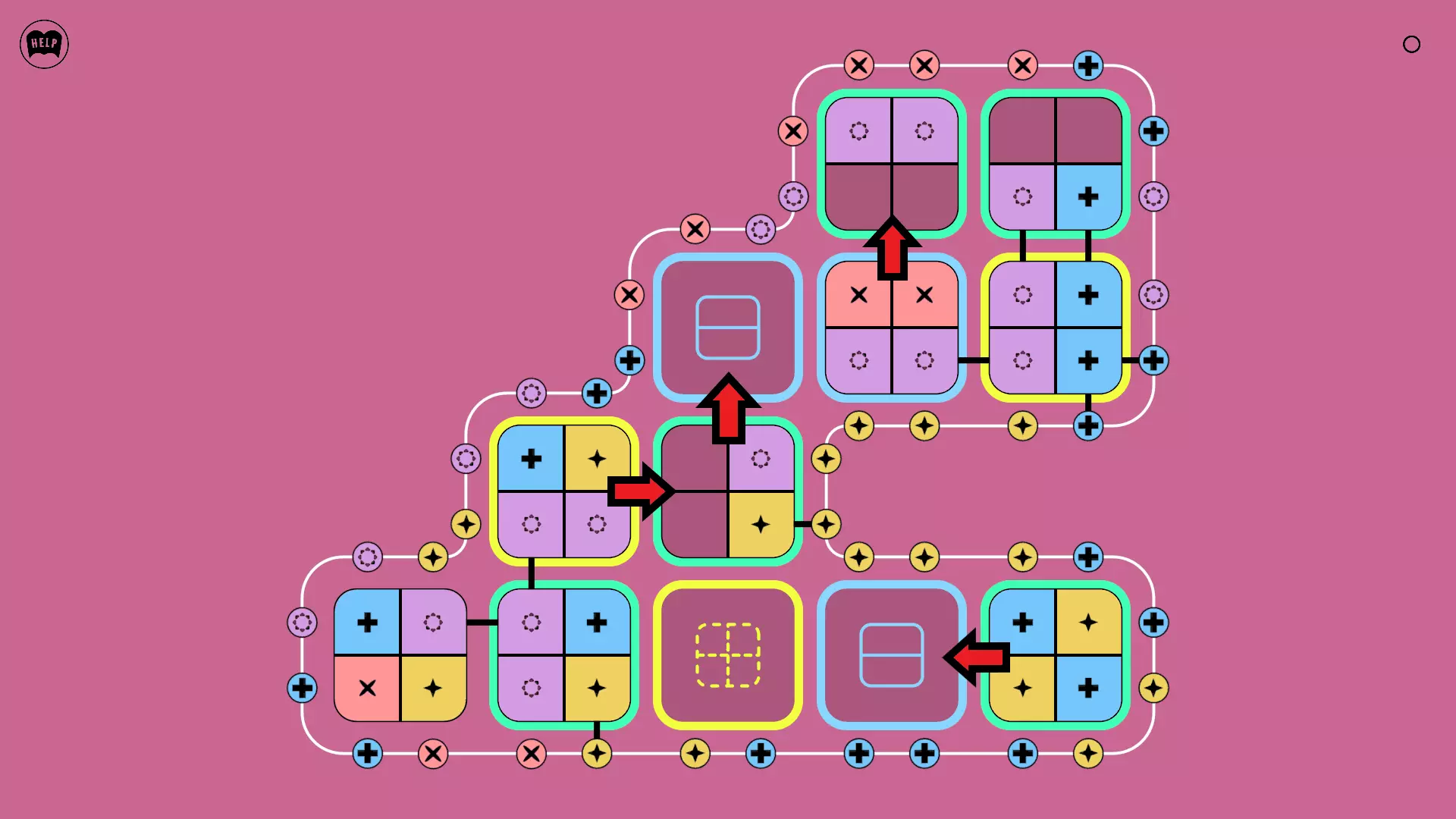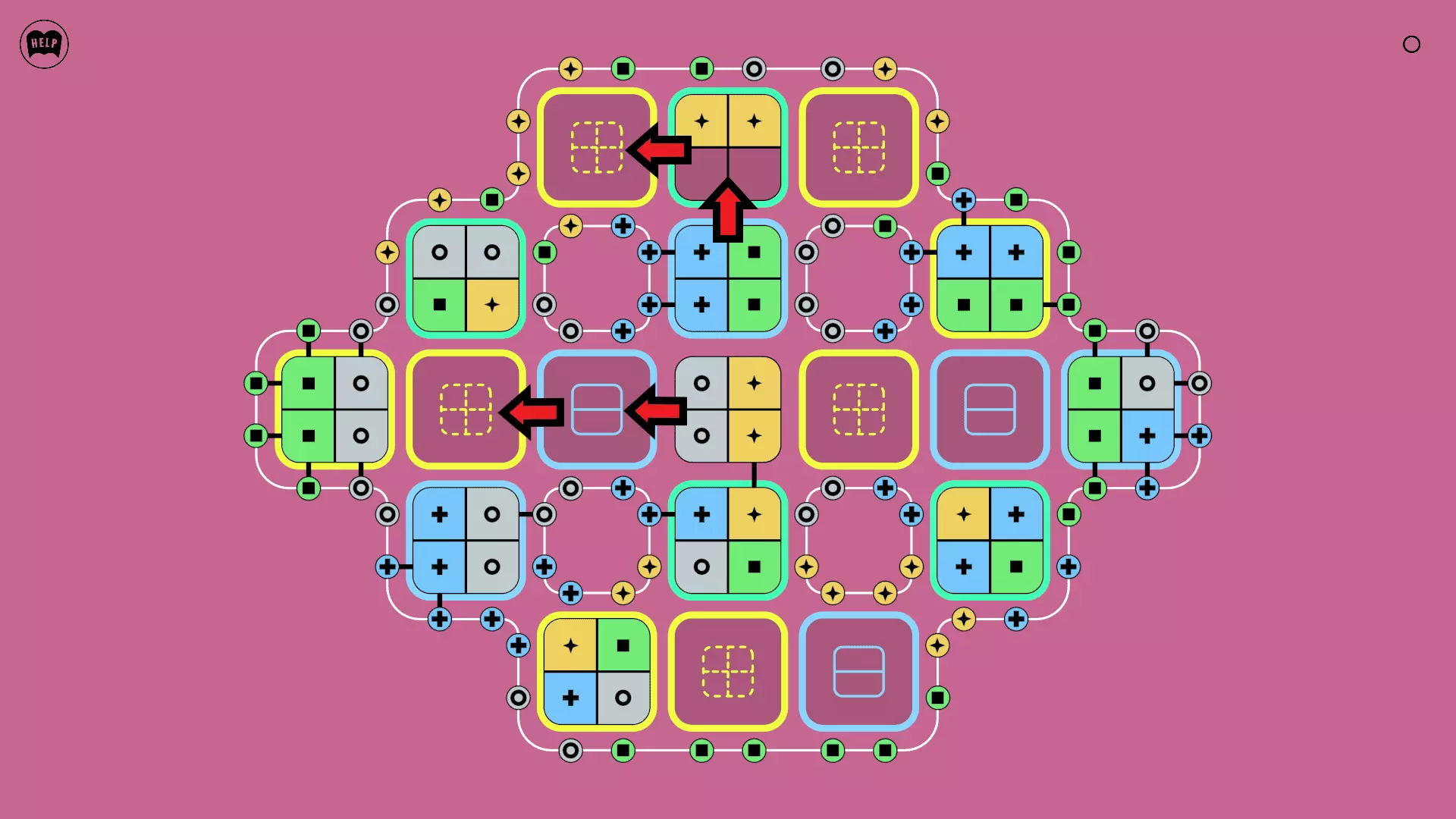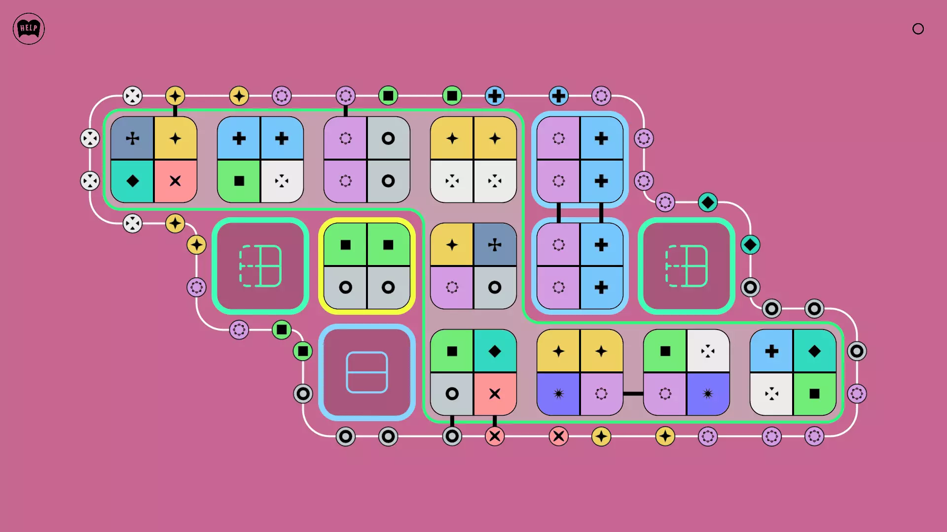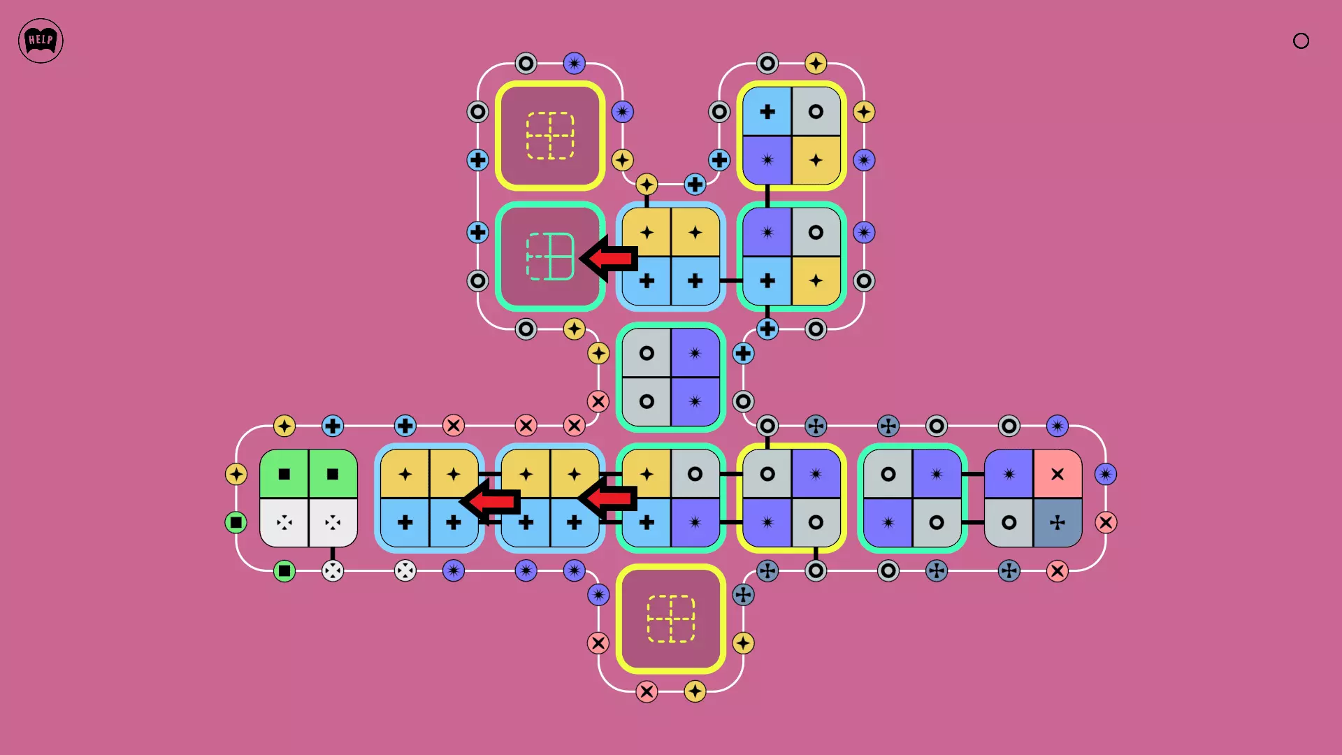 《Lines On Sides》关卡71-84图文攻略 简介 前18个关卡仅提供解决方案,因为解决这些关卡只需旋转或交换方块。 第19关及后续关卡包含步骤说明,解释如何分割、复制和转移方块。 由于Steam的限制,我不得不将本攻略分为两部分。 规则 旋转方块,直到方块上的图标与线条上或相邻方块上的符号匹配。当符号匹配时,它们之间会绘制一条线。 第7关引入了交换被绿线圈住的方块的功能。第14关新增了无法旋转或移动的方块,这类方块外有粗黑线环绕。 第19关新增了分裂平台,该平台外有蓝色线条环绕。此平台可将方块分裂为两个,或将两个方块合并为一个。