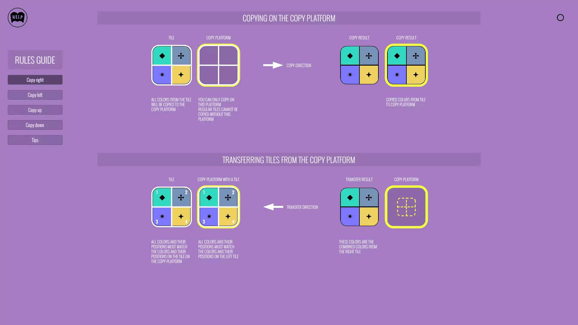 (点击屏幕左上角的【帮助】按钮可了解更多相关规则。) 第33关新增了复制平台——它被黄色圆圈标注。该平台可以创建一个方块的副本。