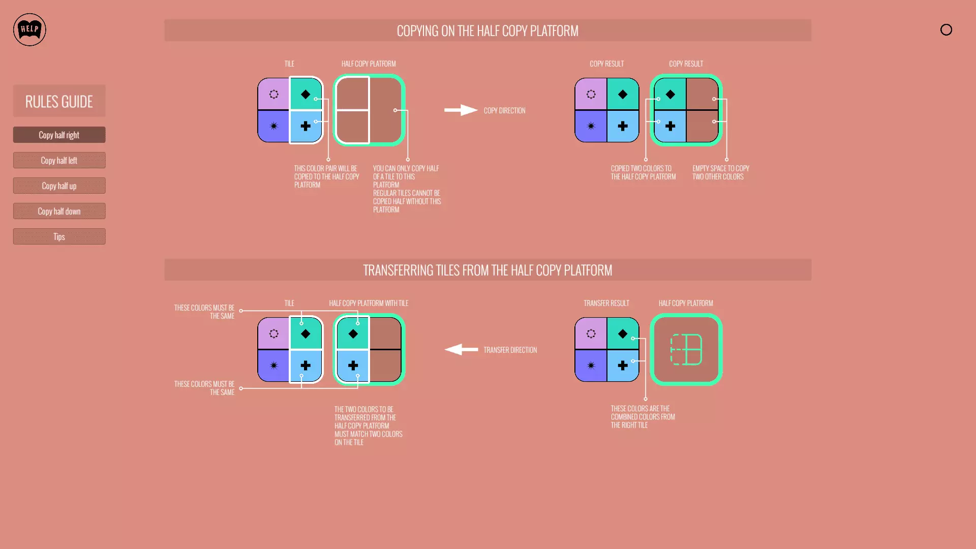 将瓷砖旋转至下方位置。对一个瓷砖进行半复制,对另一个瓷砖进行分割。 对第三个瓷砖进行两次转移。复制第四个瓷砖,对第五个瓷砖进行半复制。