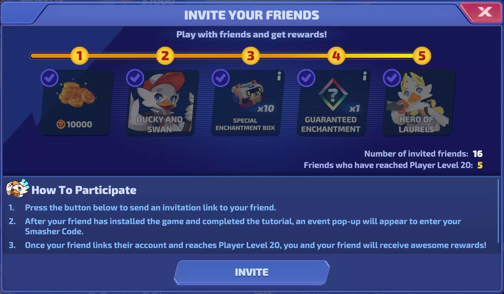 现在你可能会问,如何邀请好友以及这是如何运作的?别担心,我现在就来解释! 如何获取【Ducky】 下面我们将详细说明,请继续看: 1. 让一位好友下载游戏。这一点不言自明,但却是最复杂的部分(毕竟不是每个人都有朋友) 2. 让这位好友达到450杯。此时他们将解锁活动,活动会对他们显示,显示效果如下:
