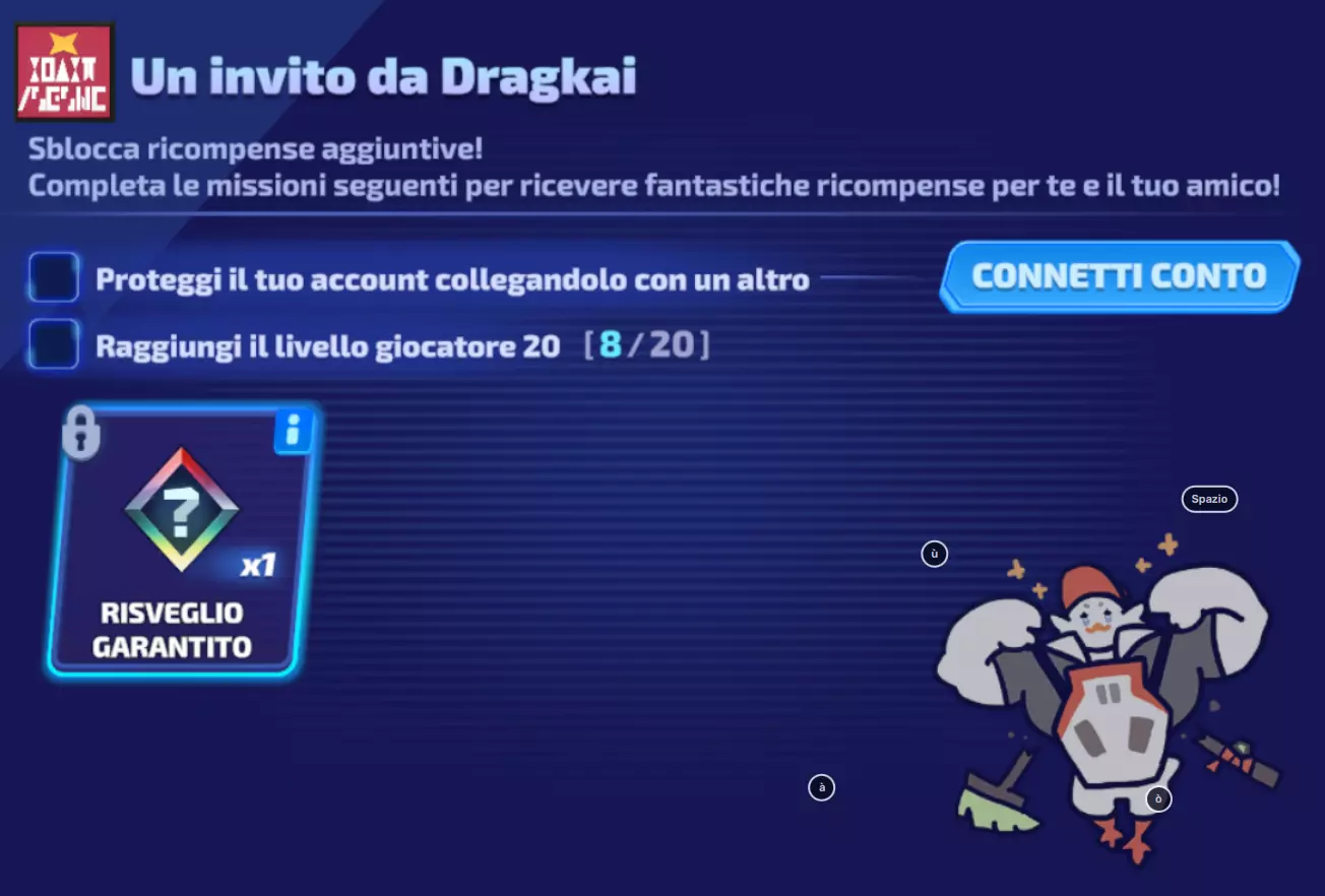 现在他们只需达到20级并将账号与任意平台关联。完成这些后,他们必须领取【保底附魔】,你才能获得奖励。奖励将通过邮箱发放。 后续:如果这是你首次完成此操作,将获得10000 Credits。再邀请另一位好友完成同样步骤,即可获得【Ducky】。 如何获得【Ducky】:无好友版 假设你没有可以下载游戏的好友,因此无法获得【Ducky the Duck】而感到难过。 幸运的是,我也有解决办法! 通过手机或手机模拟器下载游戏,创建新账号,然后按照前面所述的所有步骤操作。关于账号关联,建议使用一个未使用过的邮箱关联谷歌账号(不要与主账号使用同一个邮箱)。之后,当你的主账号获得奖励后,退出你刚使用的这个小号。这样一来,该邮箱的数据就会被取消,意味着你可以反复使用同一个邮箱来获取所有奖励。 我不对此负责,但如果不小心删除了主账号,我真的很抱歉,所以请务必先确认你要删除的是哪个账号。