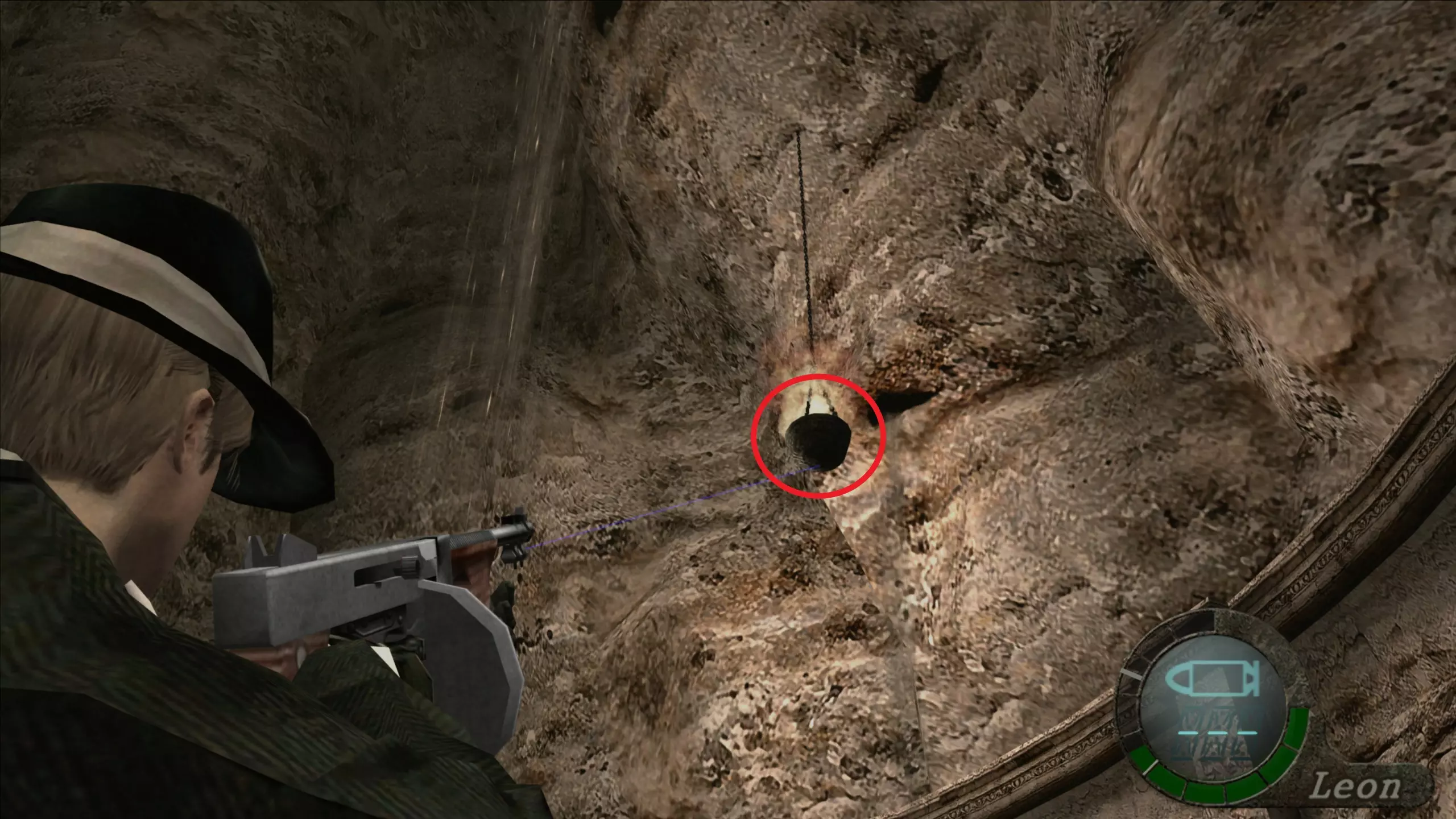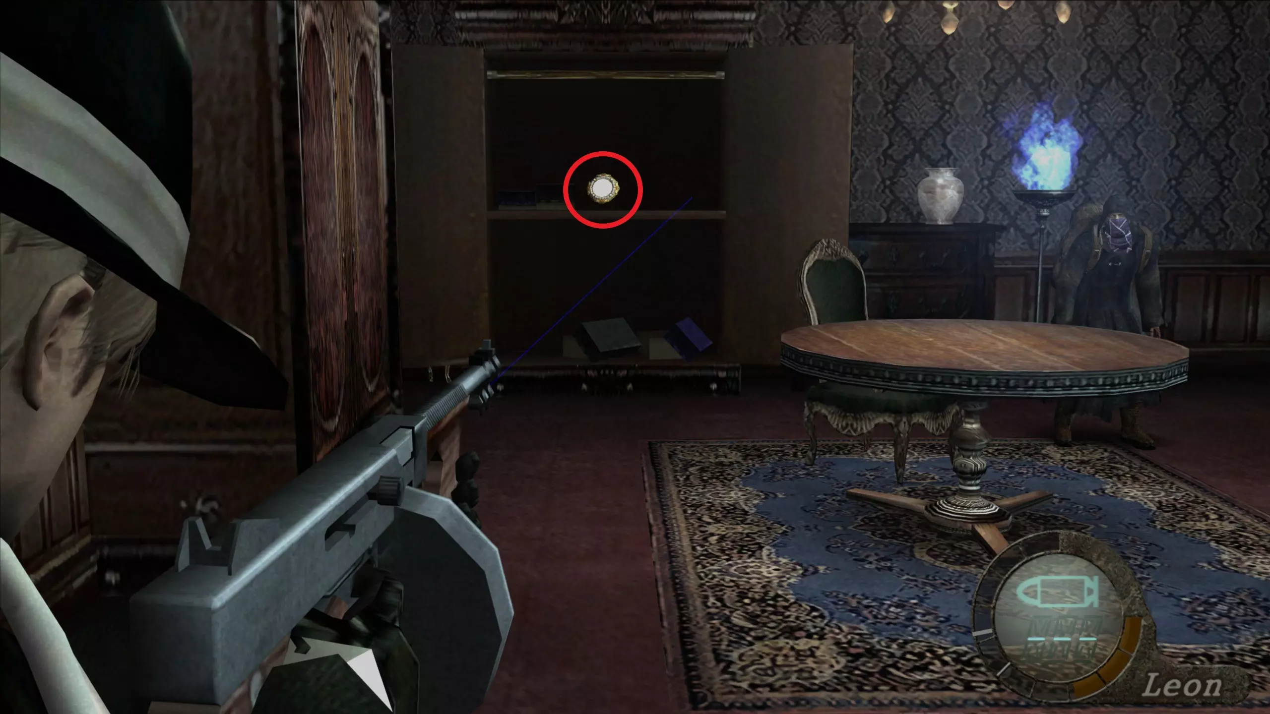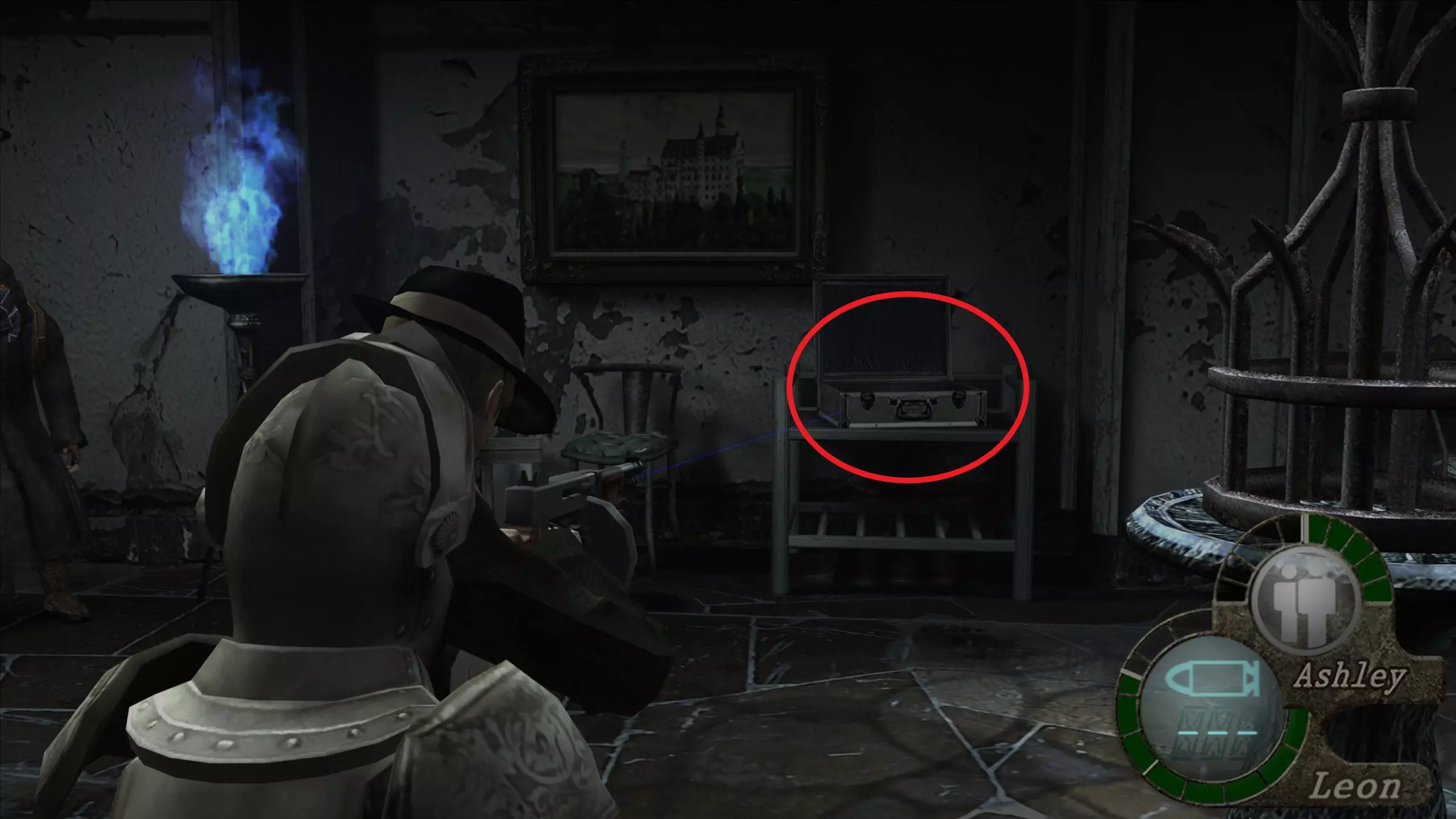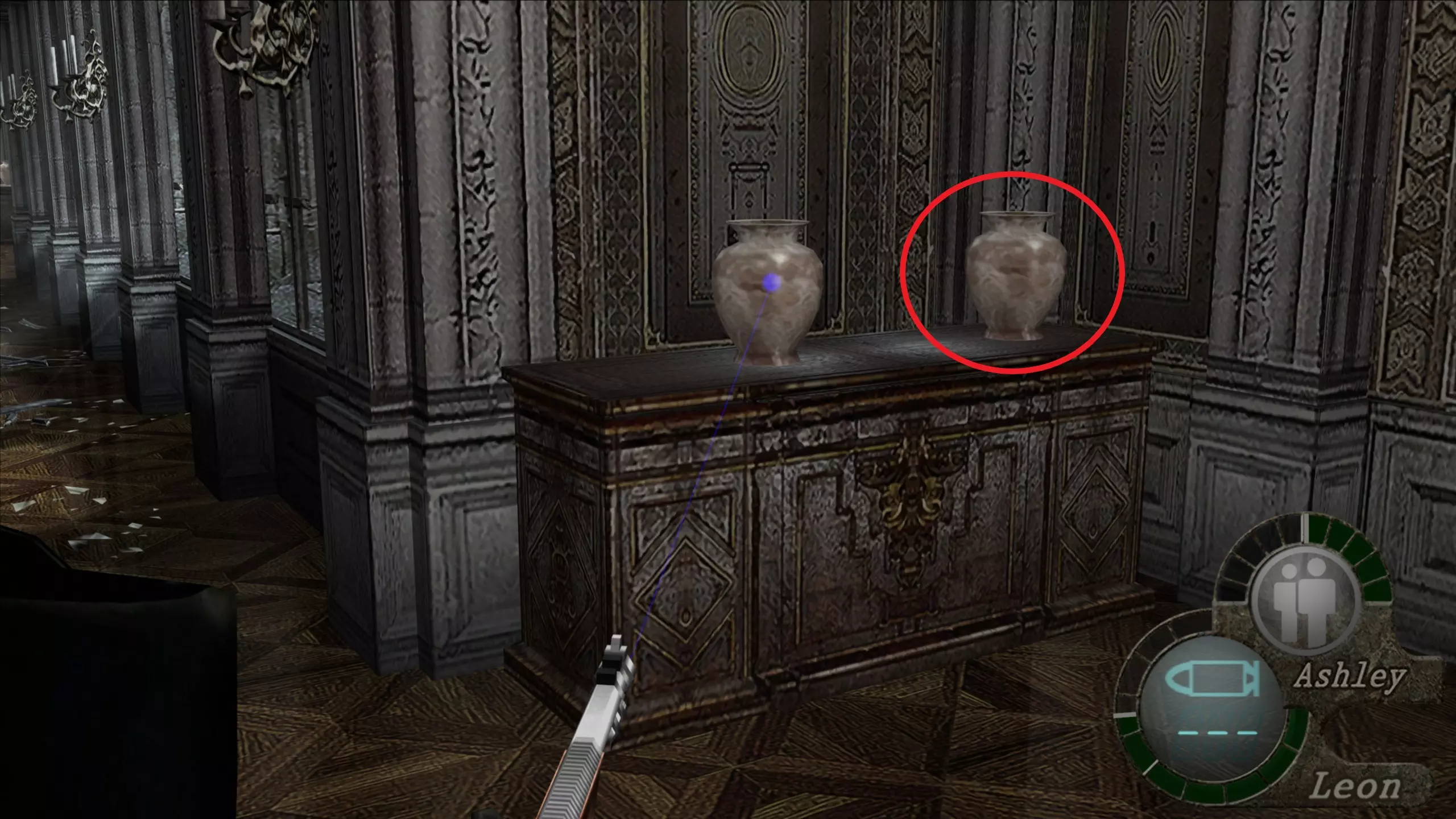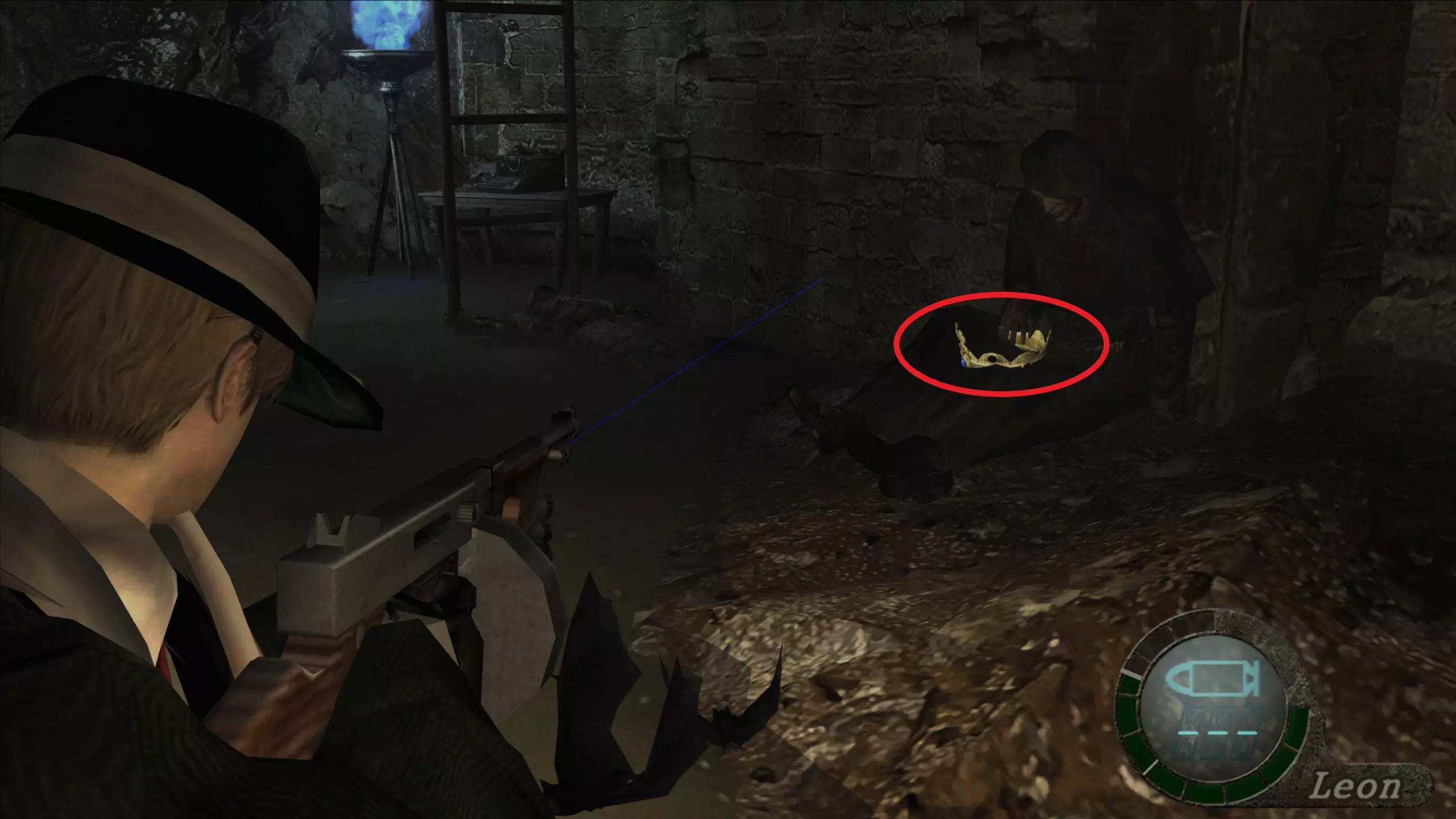 华丽梳妆台(1),匕首(11)(12) 在上一个场景的灯之后,我们下到一个洞穴,中间有另一盏相同的灯,我们必须向它射击,以显示一个华丽梳妆台和2把匕首的位置。