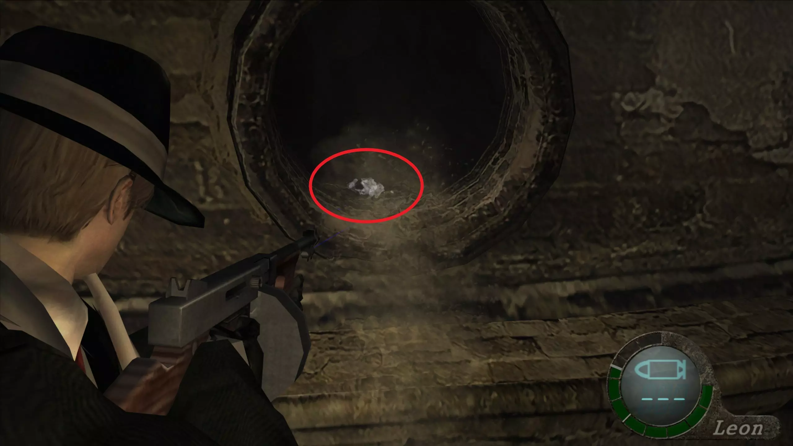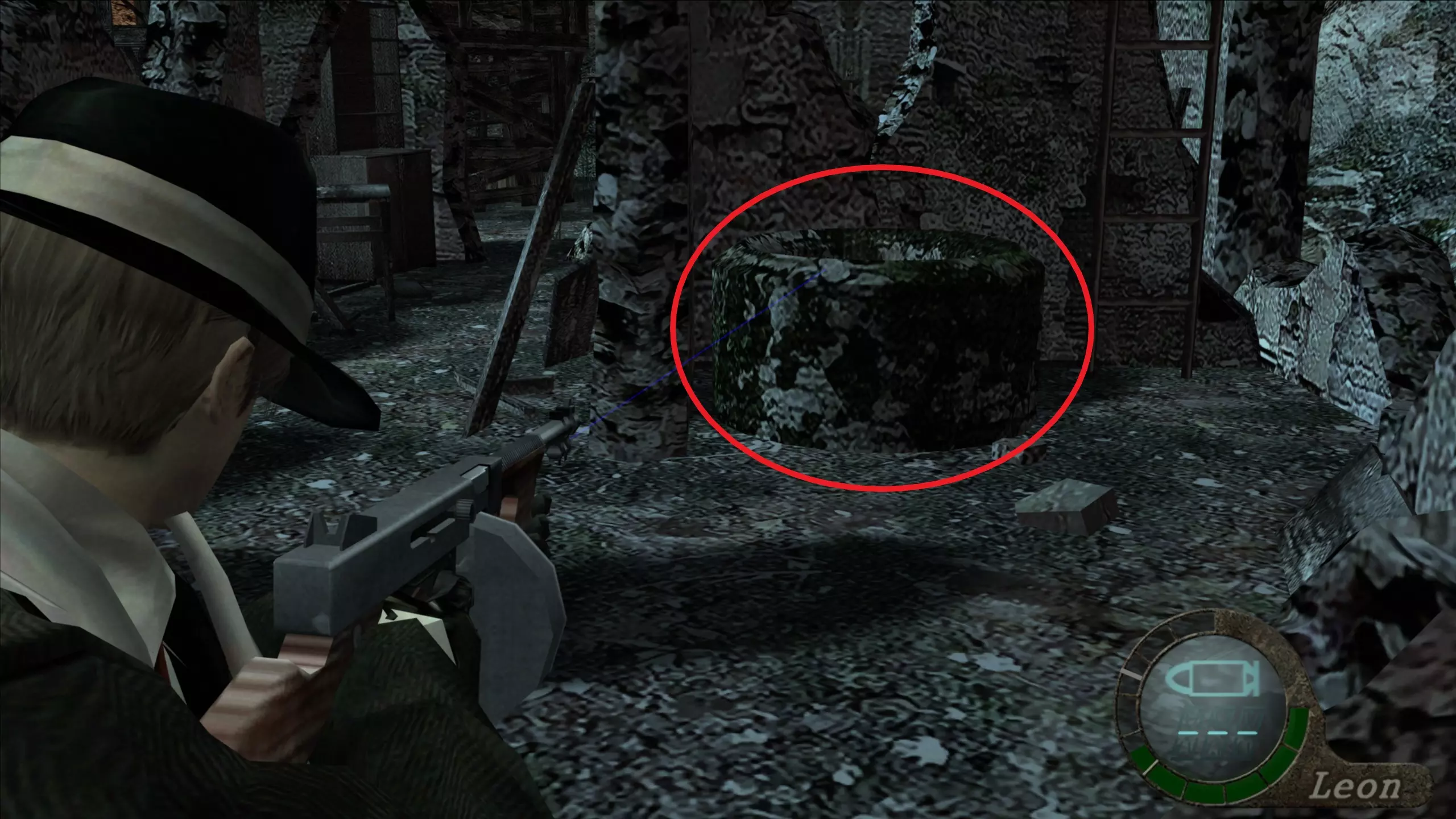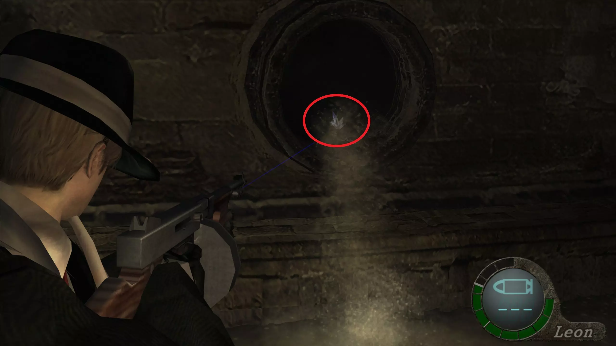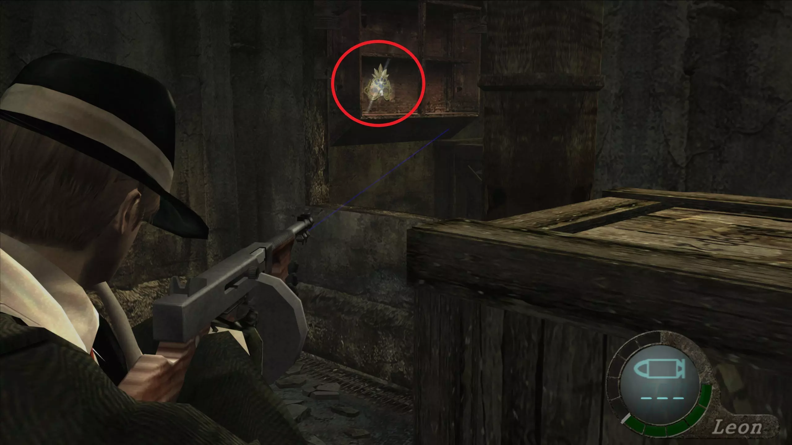 怀表(1) 爬上手动楼梯来到室外后,在我们的左手边可以看到它。 和1-1章节的挂坠一样,我们需要打破木板来封住井口,然后向怀表射击使其掉落,这样就能干净地获得它并卖个好价钱。