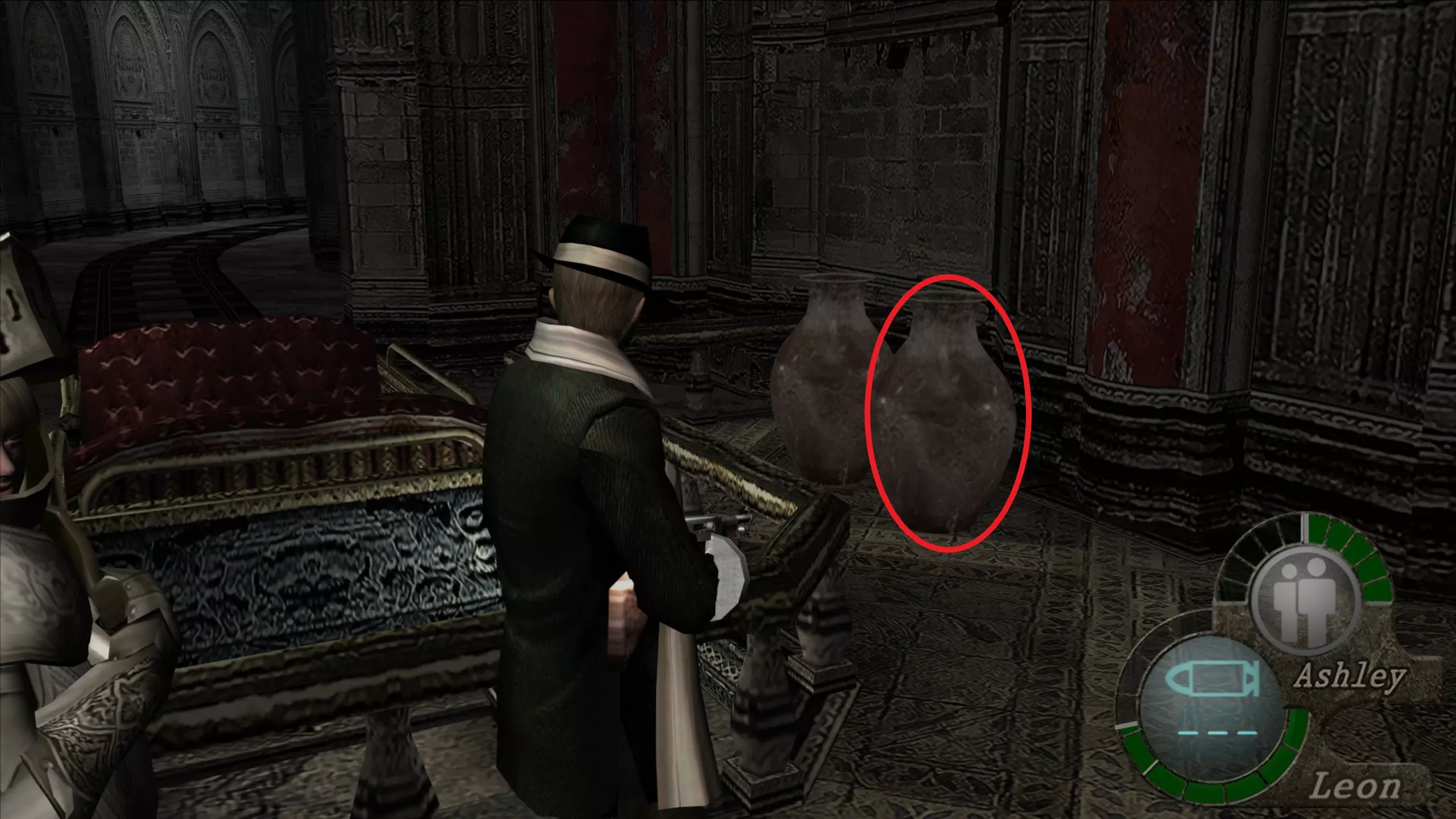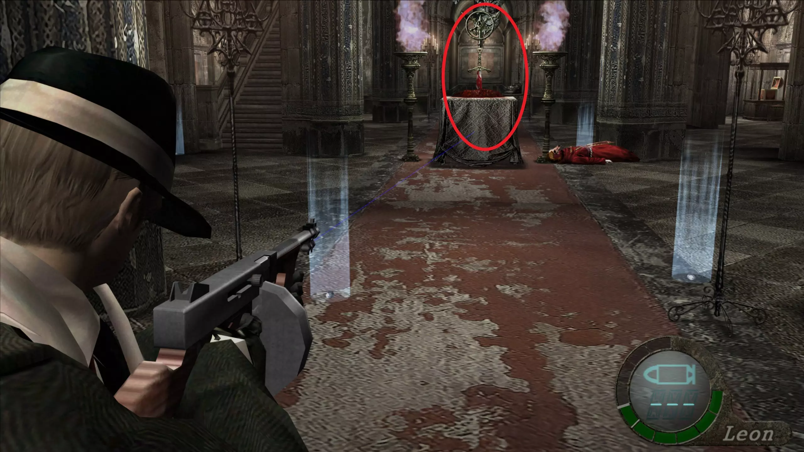 在献祭之室中,我们会遇到11名光明教成员(10个埃斯皮内拉【ESPINELA】,1个光明教挂坠【COLGANTE DE LOS ILUMINADOS】)。我们可以选择扔一颗手榴弹来消灭他们,或者下楼后跑向右门,让门关闭以防止他们逃跑。