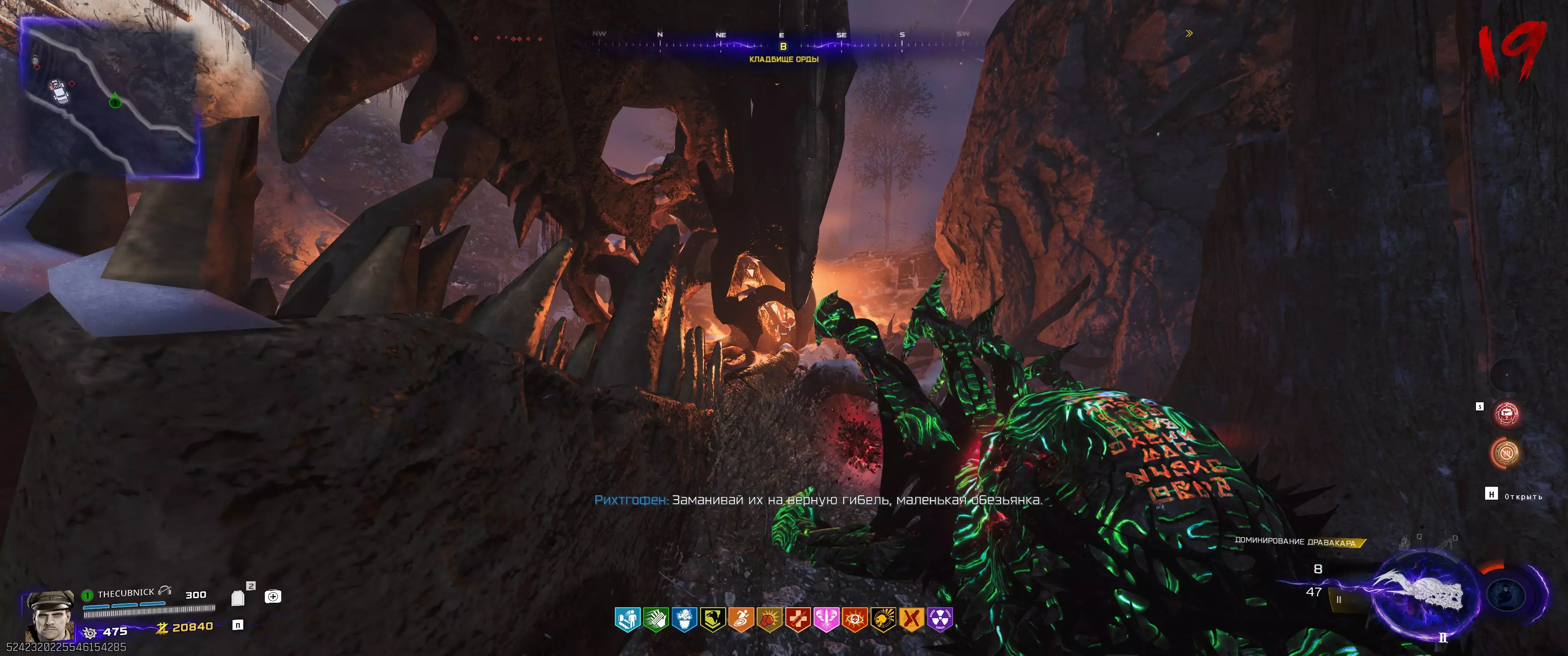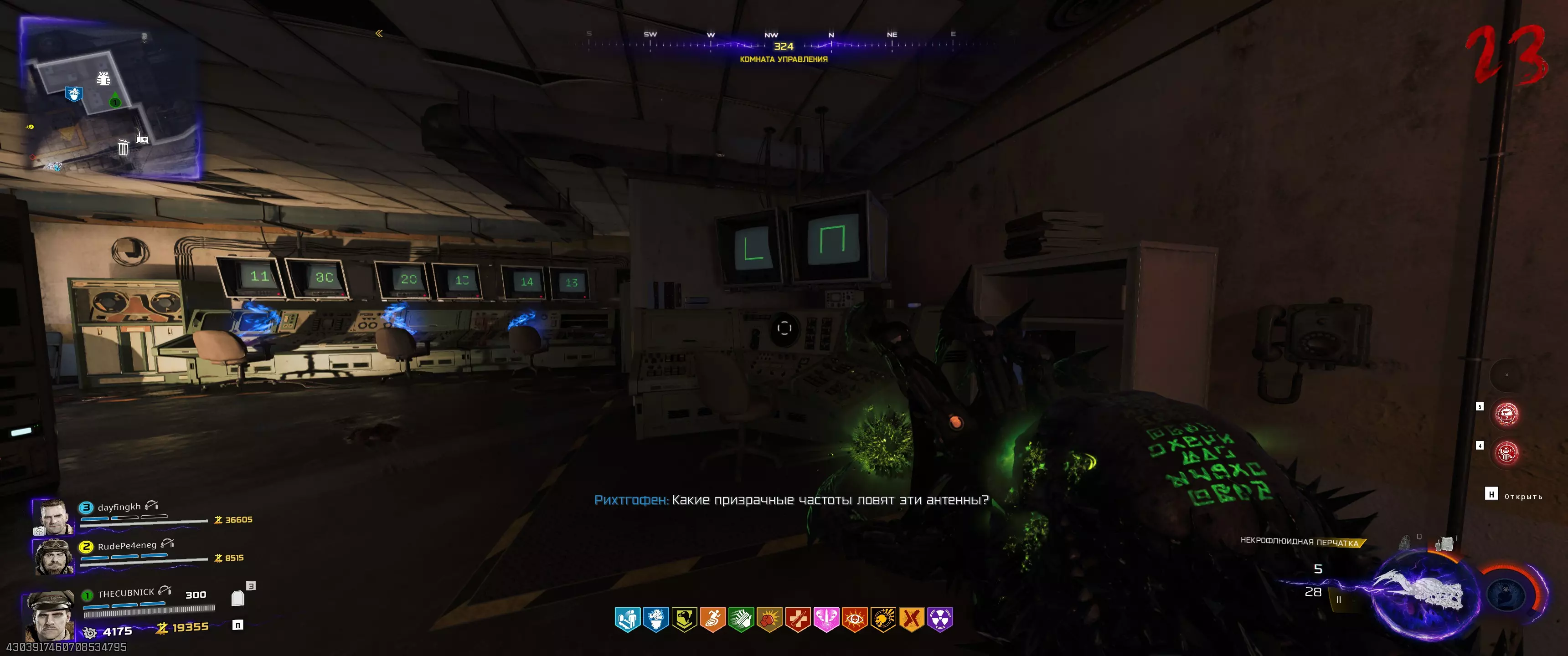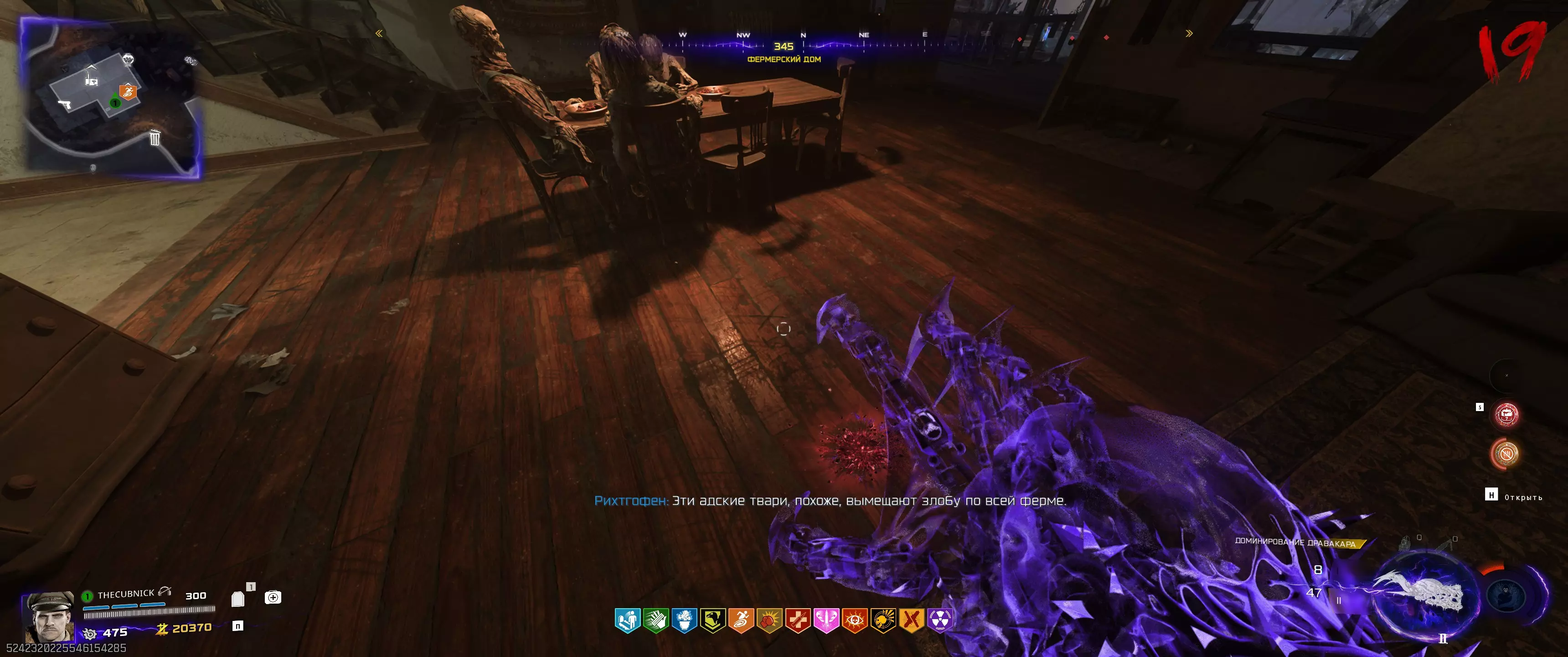 桌子周围画着罗马数字。我们要找到与时钟时针位置相对应的数字。如果站对了位置,家族首领的头就会转向你。等待它完全转过来,然后用充能的【死灵流体手套】射击。