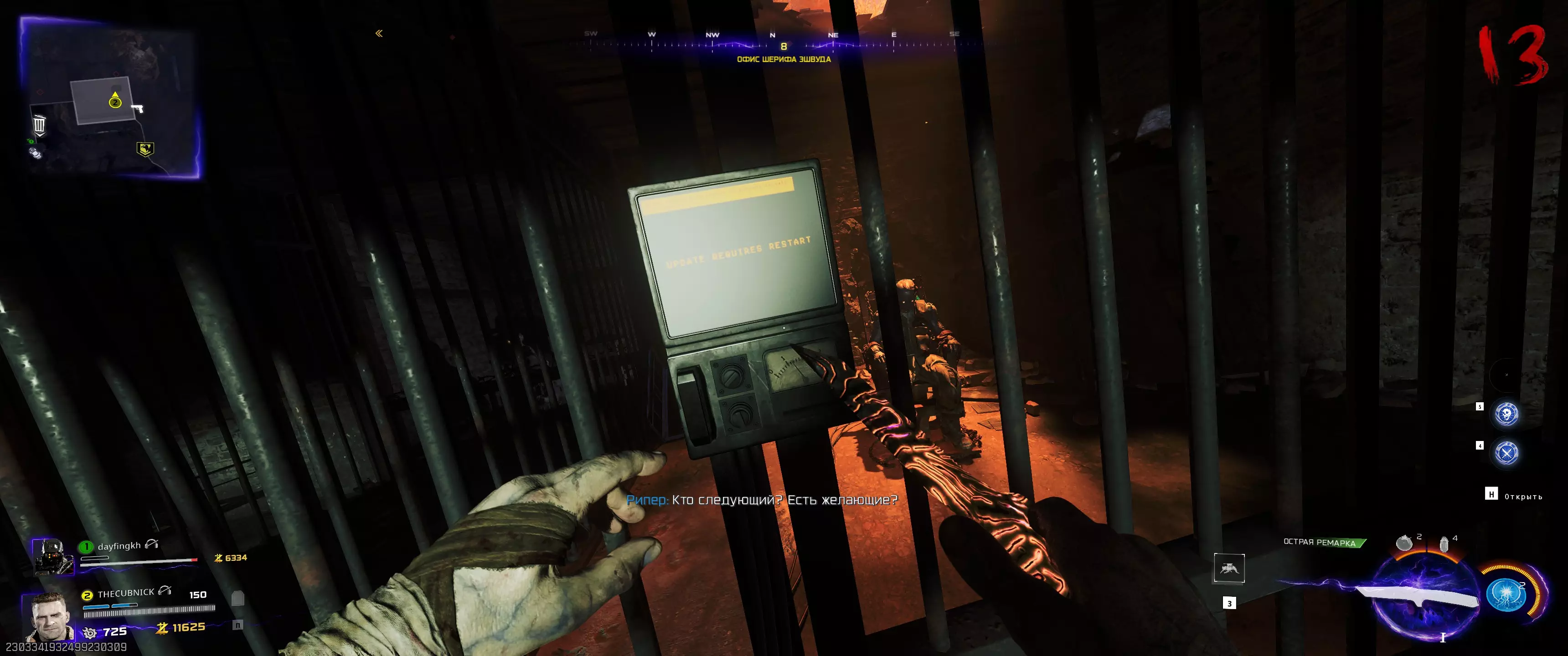 我们带着芯片前往埃什伍德的警长办公室,克劳斯就被关在那里的牢房里。将芯片安装在门上的终端机上。(这里有个游戏梗,因为需要重启来完成更新)