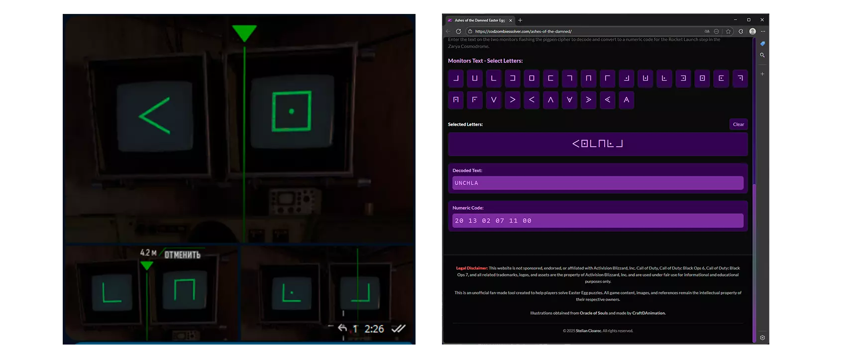 之后天线会减慢旋转速度。此时前往控制室,从右侧进入,会看到两台显示器,上面显示着我们熟悉的格栅密码(Pigpen)。记住出现的符号并在相关网站上输入。