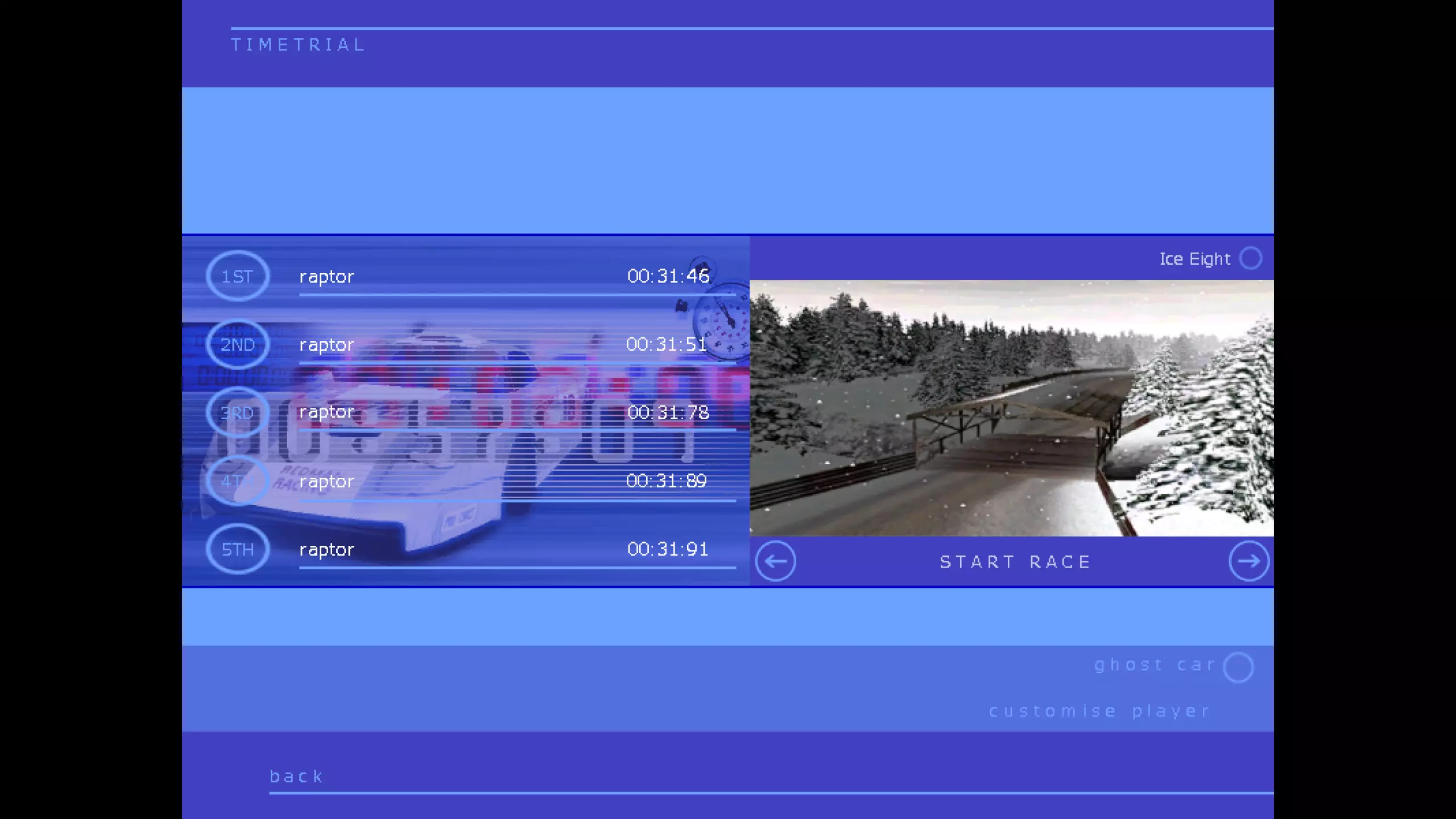 一条“8”字形的冰封赛道,是游戏中最简单但也最有趣的赛道之一。赛道中央的十字路口充满混乱,路面湿滑。尽管无法在锦标赛模式中使用,但它非常适合在街机模式中进行快速比赛,或者在计时赛中测试不同的赛车。