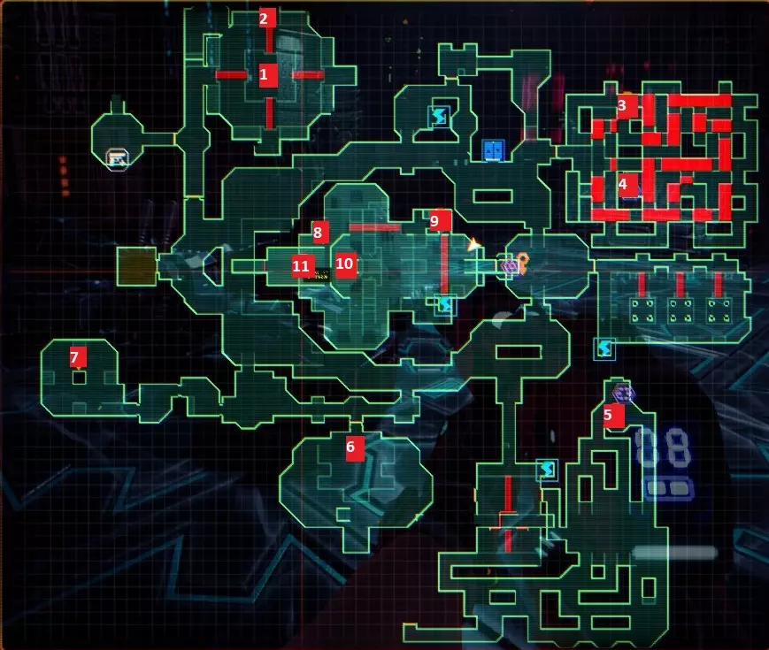 8 - 安全等级较低(75%)时门会打开,在赛博空间中关闭防护力场。