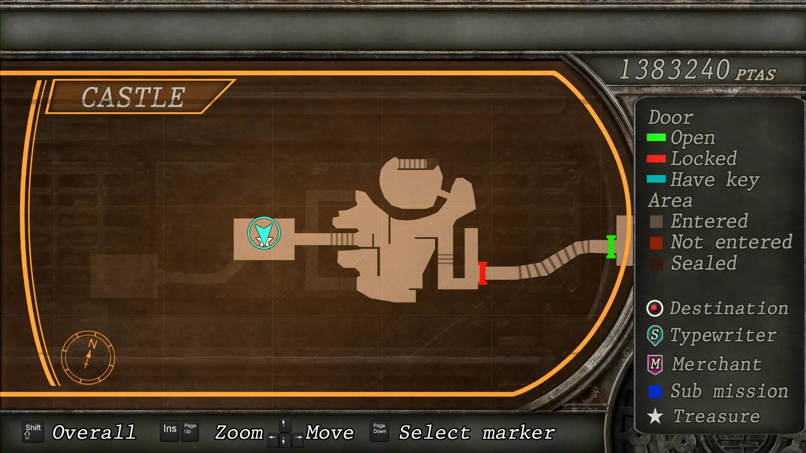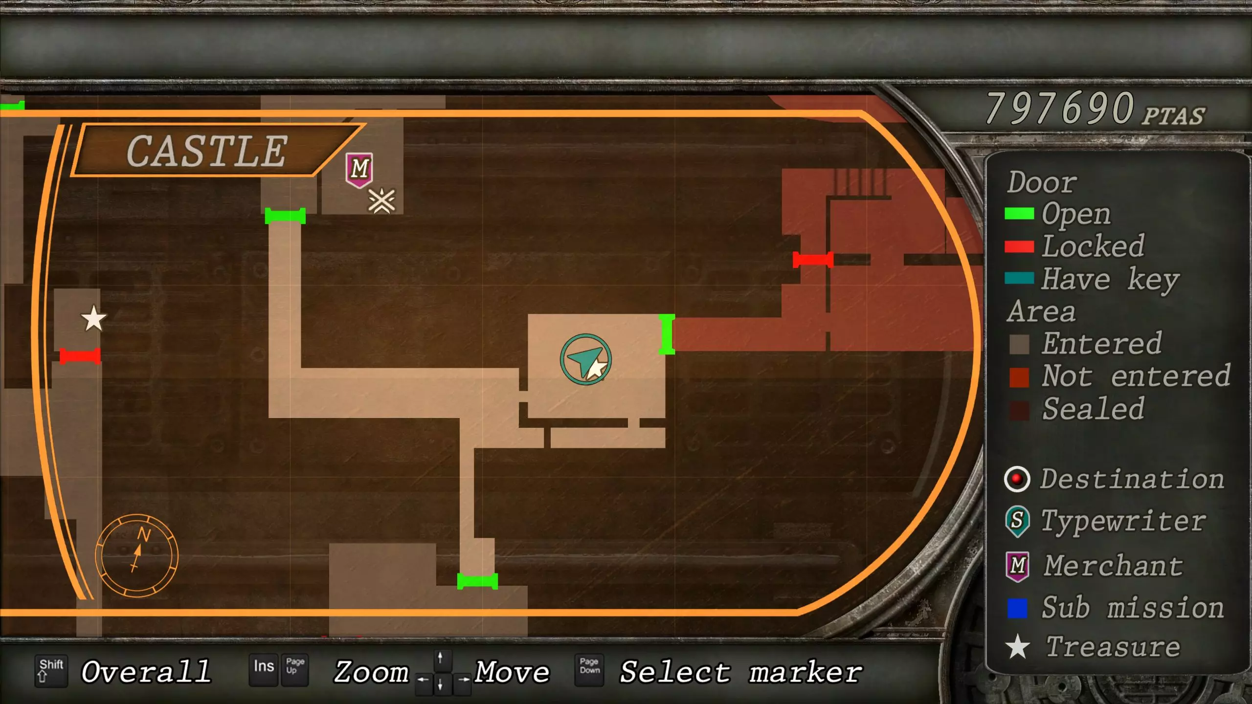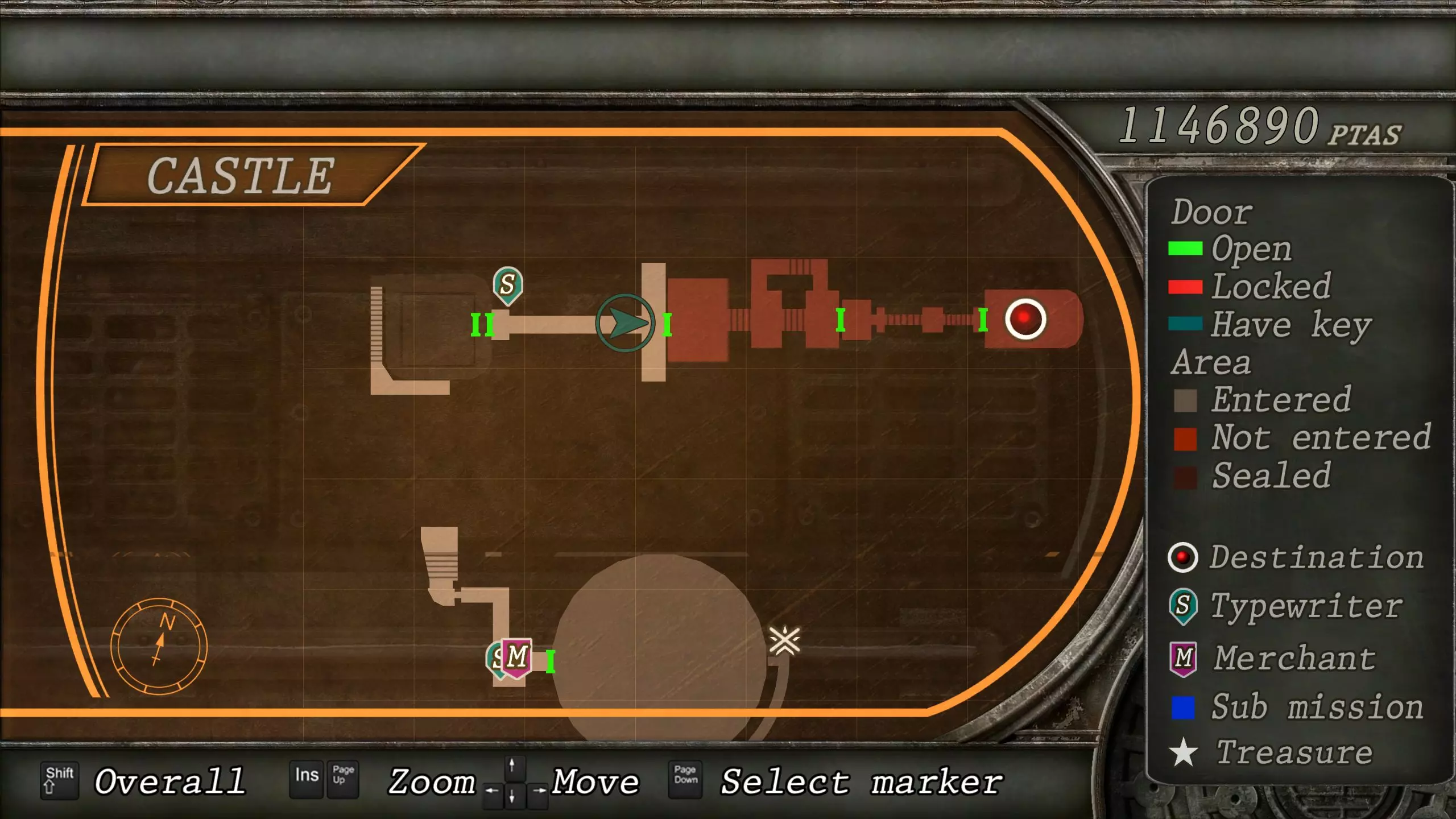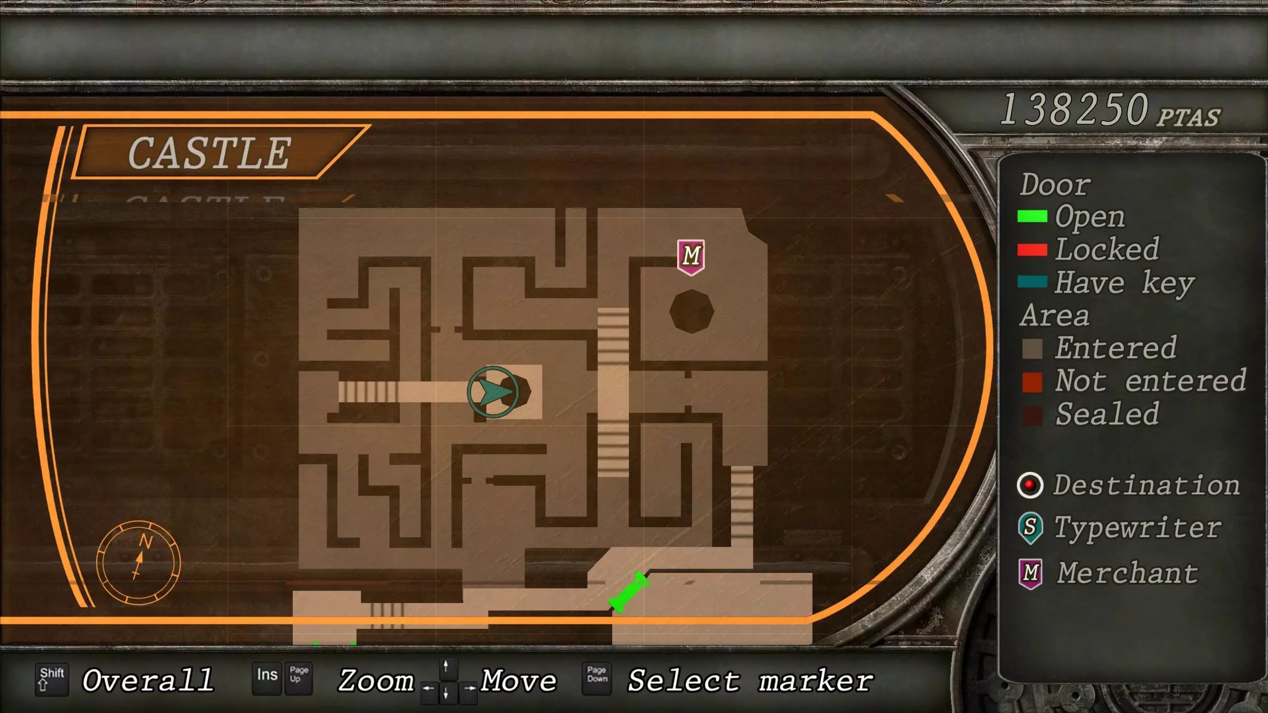 觐见大厅(重返) 在龙房间获得狮子纹章后,你将乘车返回觐见大厅,把三个纹章放入各自的插槽中。如果你在第三章第一节错过了紫宝石,这将是你获取它的另一个机会。 大厅 从大厅有许多不同的路线可走,包括商人开店的房间,以及通往他射击场的门。进入这个射击场将解锁【Game B】,这意味着你可以额外获得6个瓶盖和一些奖金! 注意,在简单难度下,东侧房间将无法进入,这意味着那里的黄草也无法获取。黄色药草 #13 进入大厅后立即看向你的右侧,你会看到下一株黄色药草放在桌子上。此药草在简单难度下无法获取。