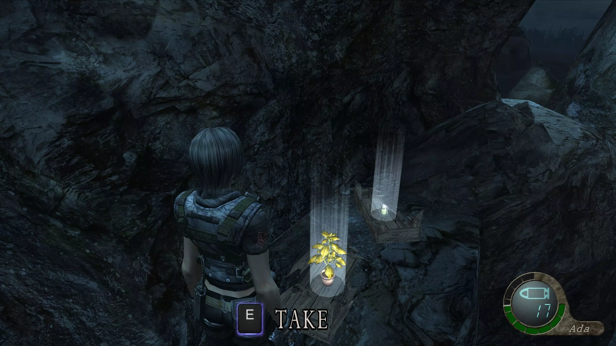 旧水道 A 黄色药草 #14 下到坑底后,检查地面可发现大量物品,其中包括另一株黄色药草。