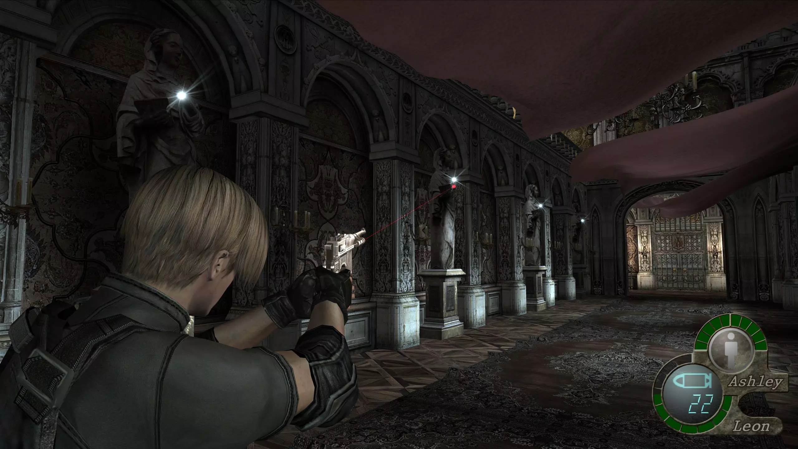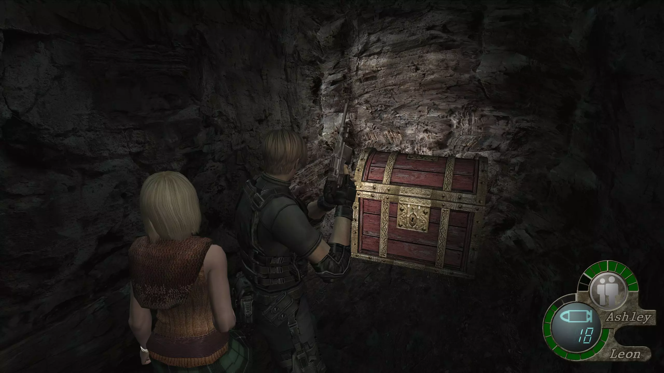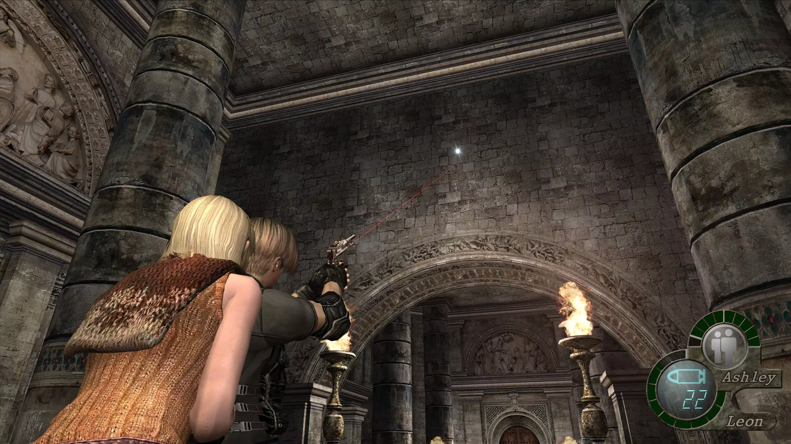 如果你不想使用【蝴蝶夫人】,可以将其以19000比塞塔的价格出售。 在将阿什莉托进房间后,要确保她跟随着你,因为在此之后她常常会被设置为“等待”模式。 这样,你就可以从上次中断的地方继续游戏了。 龙房间宝藏:光明教吊坠(12000比塞塔) 这个房间的左右两侧会有两座喷火的龙雕像在移动。 如果你能摧毁它们,就会获得奖励。摧毁第一座会出现一个内含5000比塞塔的宝箱,而摧毁第二座则会出现一个装有光明教吊坠的宝箱。摧毁它们最简单的方法是射击操控它们的邪教徒,不过也可以射击承载它们的链条上的粗大部件,但相比一击就能杀死的邪教徒,这些部件更难摧毁。