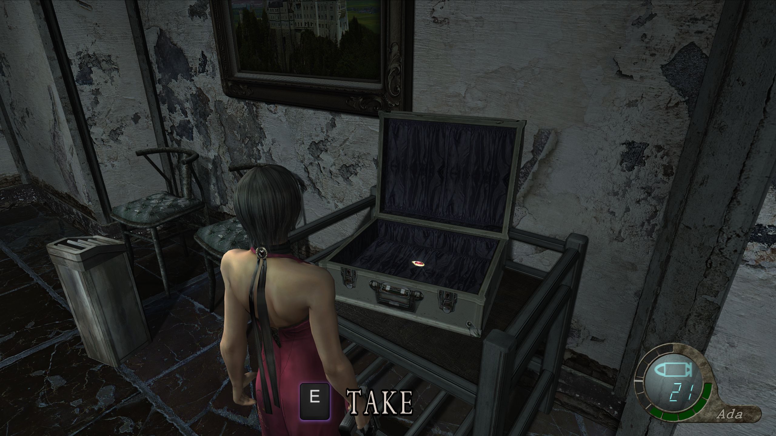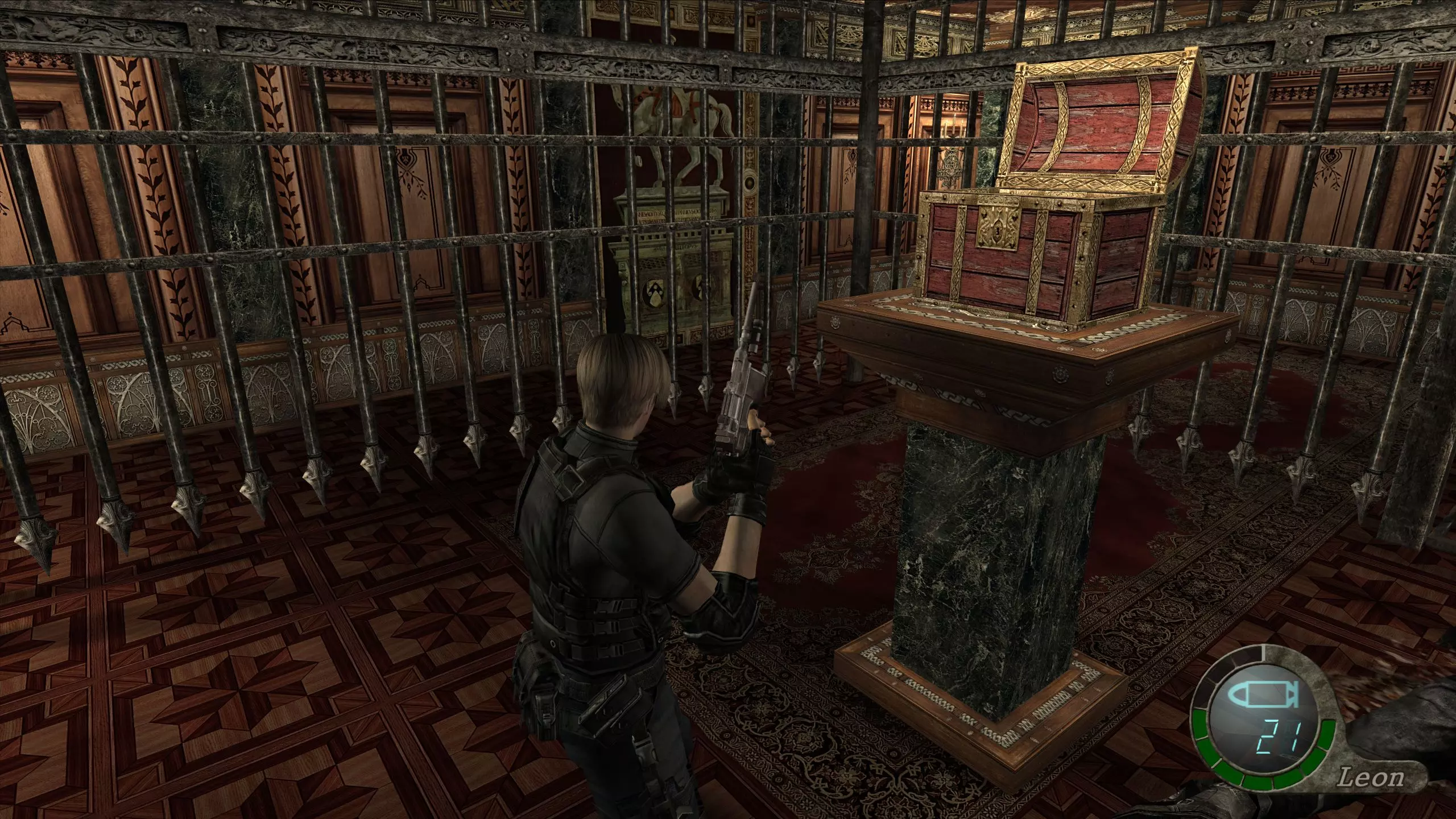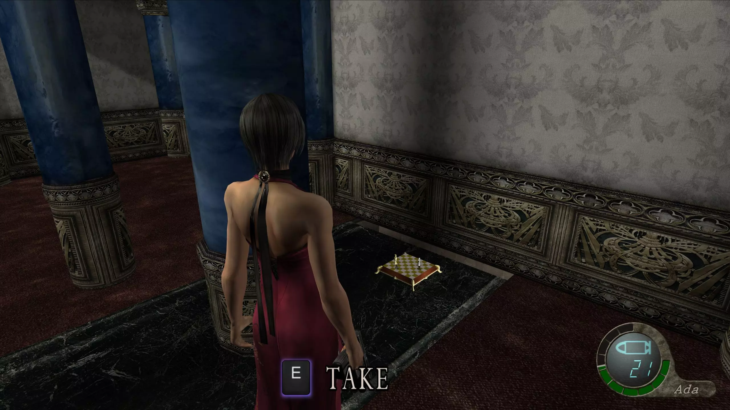 画廊宝藏:雅致棋盘(13,000比塞塔) 在主线游戏中曾有免费火箭筒的房间里看到里昂时,跳下去并查看东南方向最后一根柱子的后面,即可找到雅致棋盘。