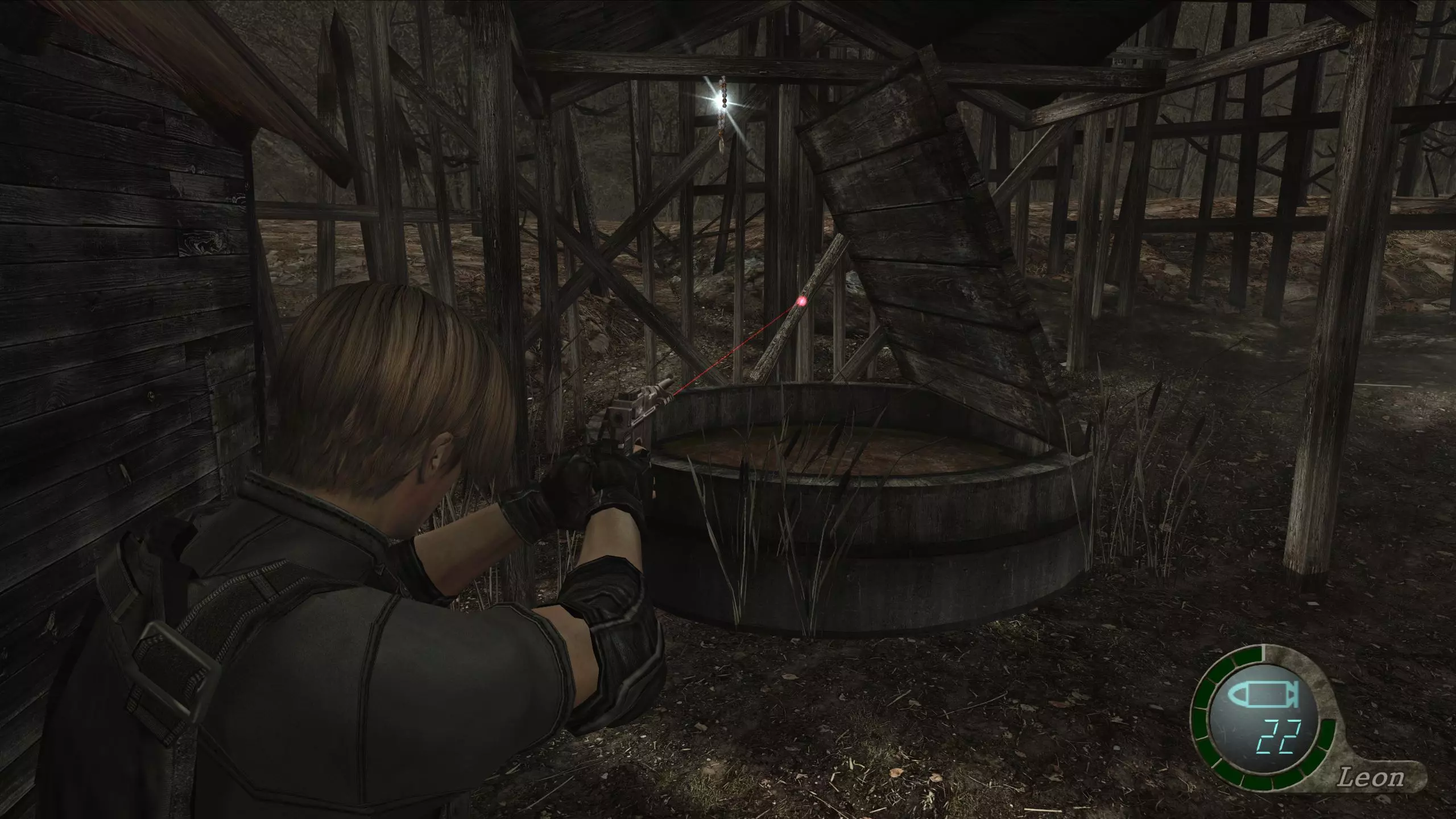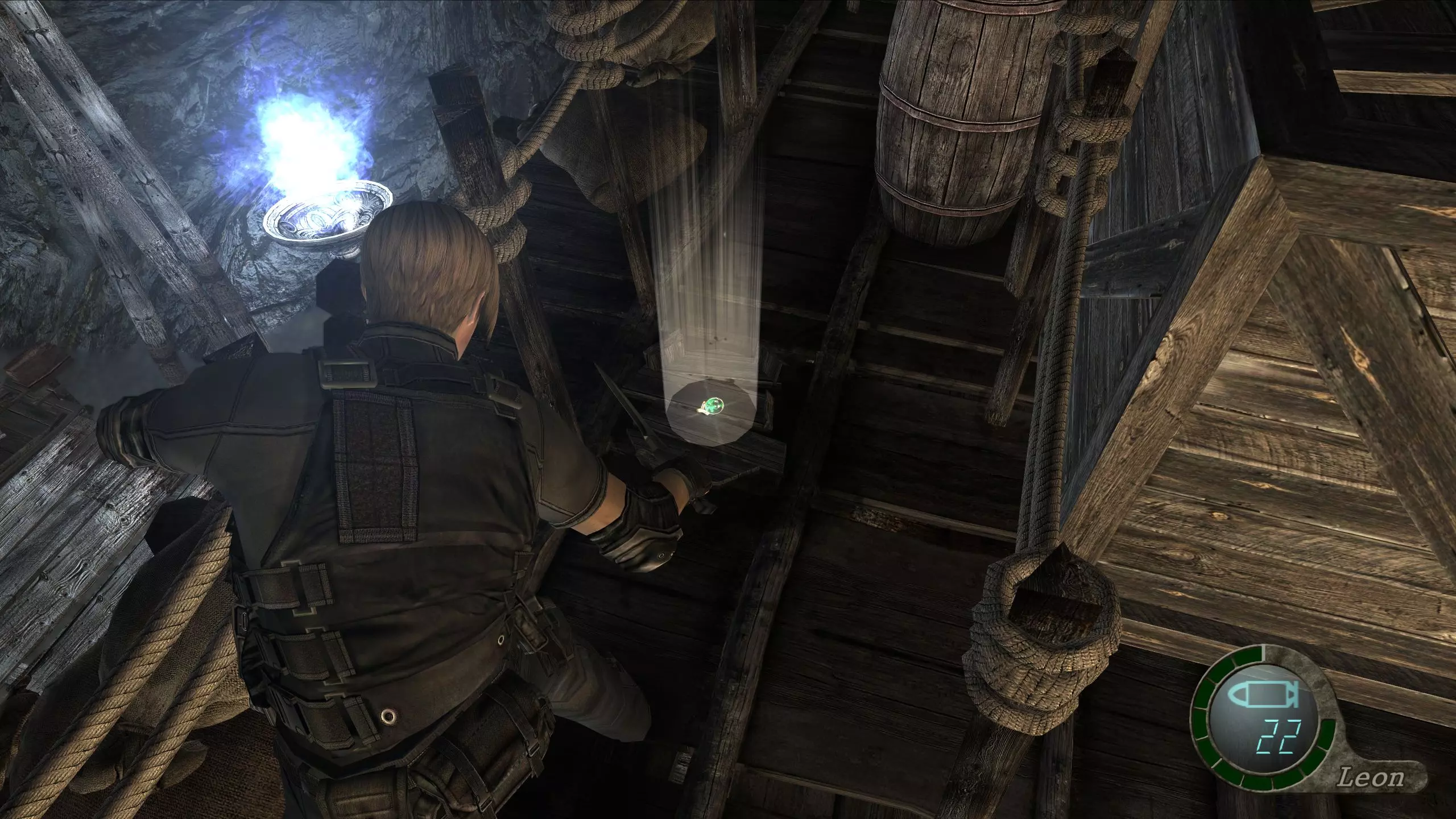 完成后,你可以回到建筑内,将目前找到的所有宝藏卖给商人。虽然不算是真正的宝藏,但在章节开始的建筑里,你可以在楼下的烤箱中找到一个黄金鸡蛋,它可以完全恢复你的生命值,或者以3000比塞塔的价格出售。你还可以杀死房子外面那个挥舞电锯的村民,获取一颗售价10000比塞塔的红宝石。 村庄广场这里没有新的宝藏,但有一堆木箱/木桶刷新了,这意味着你可以收集更多物品。 农场打字机旁边还有一个水盆。水盆上方挂着一块尖晶石。记得在收集它之前先射击木梁!宝藏:金手镯(8500比塞塔) 爬上白色大谷仓内的梯子,然后跳出窗户。正前方,你可以跳下到一个封闭区域,那里有一个可破坏的木箱,里面装着金手镯。