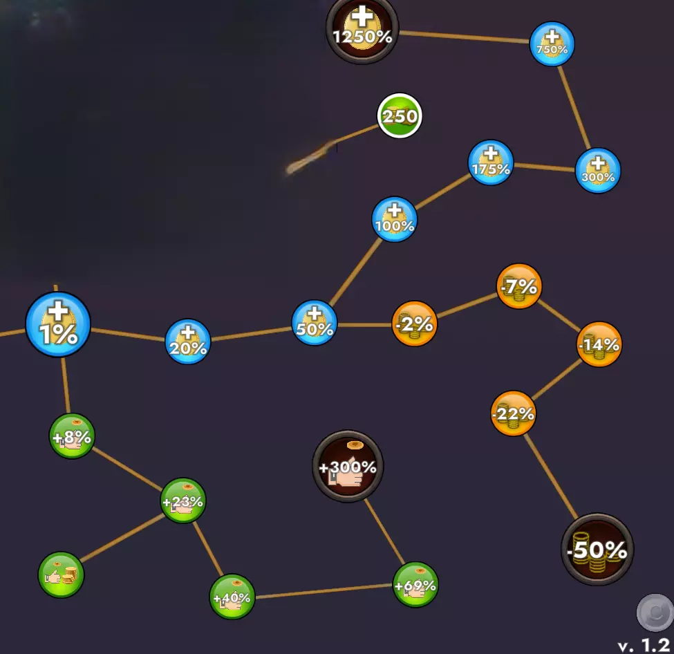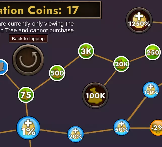 (南方绿色图标) 3枚通胀币——主动翻转器1(+8%):每次主动翻转硬币可多获得8%的硬币。主动翻转器适用于所有挑战 6枚通胀币——主动翻转器2(+23%):每次主动翻转硬币可多获得23%的硬币。 7枚通胀币——主动效果 - 更大的硬币堆(点赞与钱堆):每次主动翻转硬币时,有5%的几率将你当前正面/反面的硬币数量添加到硬币堆中 9枚通胀币——主动翻转器3(+40%):每次主动翻转硬币可多获得40%的硬币。 10枚通胀币——主动翻转器1(+69%):每次主动翻转硬币可多获得69%的硬币。23枚膨胀币——超级主动投掷者(+300%):主动投掷的每枚硬币将为你带来300%的额外硬币。幸运硬币可提供10倍收益(蓝色图标) 3枚膨胀币——财富2级(+20%):所有升级可多获得20%的硬币 9枚膨胀币——财富3级(+50%):所有升级可多获得50%的硬币 10枚膨胀币——财富4级(+100%):所有升级可多获得100%的硬币 12枚膨胀币——财富5级(+175%):所有升级可多获得175%的硬币 13枚膨胀币——财富6级(+300%):所有升级可多获得300%的硬币 23枚膨胀币——财富7级(+750%):所有升级可多获得750%的硬币 99枚膨胀币——终极财富(+1250%):所有升级可多获得1250%的硬币 (黄色分支) 5枚膨胀币——折扣1级(-2%):所有升级成本降低2%此升级分支不影响特殊升级。销售升级适用于所有挑战 8个通胀币——销售2(-7%):所有升级成本降低7%。 9个通胀币——销售3(-14%):所有升级成本降低14%。 11个通胀币——销售4(-22%):所有升级成本降低22%。 21个通胀币——Steam特卖(-50%):所有升级成本降低50%。