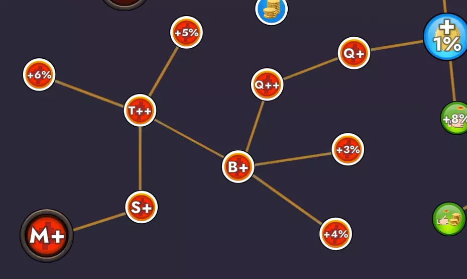 从蓝色卷轴开始: 5枚通胀币——特级升级1:赌博额外增加2次尝试机会。此分支中的每一项升级都将使所有特级升级的价格降低1%,且对所有挑战均有效。 7枚通胀币——特级升级2(第二个蓝色卷轴):赌博现在有51%的几率使你的硬币数量翻倍。【金币堆】生成的硬币更多。 10枚通胀币——更大的金币堆1:【金币堆】额外增加1个生成硬币的堆。金币堆为你提供更多硬币。 12枚通胀币——更大的金币堆2:【金币堆】额外增加1个生成硬币的堆。金币堆为你提供更多的硬币。 10枚通胀币——赌徒(赌博机):赌博额外增加1次尝试机会。每次进行【赌博】时,你的硬币翻倍几率会提升1% 10枚膨胀币——【特级强化3】(第三个蓝色卷轴):当你从硬币堆中取出硬币时,有5%的几率硬币会留在堆里。 10枚膨胀币——【提升运气】(四叶草):每当你获得幸运硬币时,有5%的几率该幸运硬币会变成【超级幸运硬币】,能为你带来50倍的硬币。 31枚膨胀币——【超特级强化】(大型卷轴):特殊强化的花费降低13%。额外增加2个生成硬币的硬币堆。升级后的掷硬币现在能为你带来3倍硬币,幸运硬币则能带来15倍硬币。 20枚膨胀币——【自动升级】(腰带内的齿轮):解锁特殊强化标签页内的自动升级功能 树的左下角