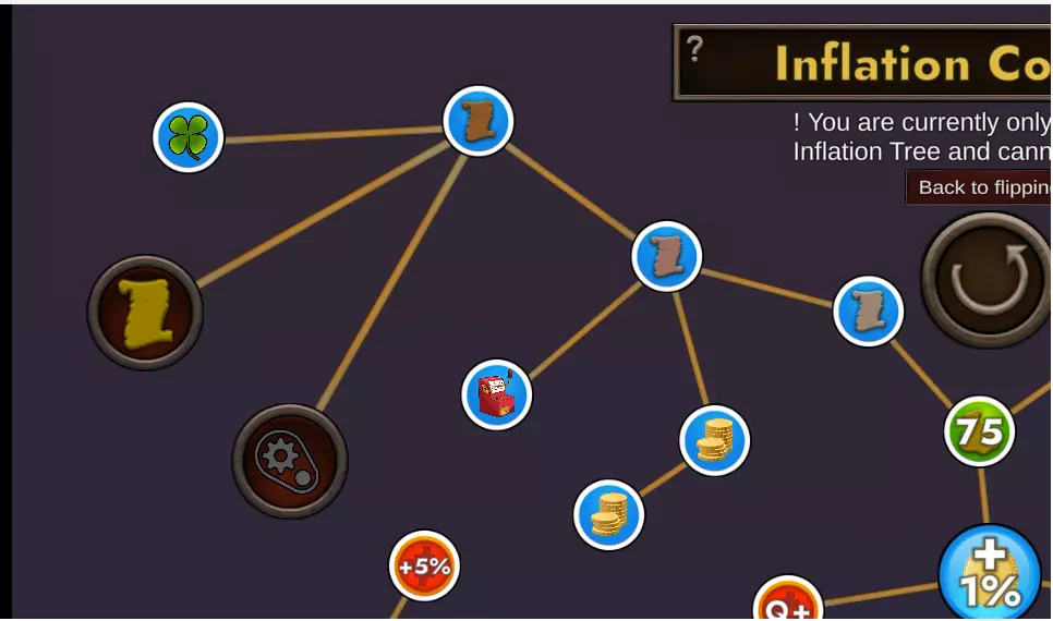 2枚膨胀币——【硬币袋1】(绿色钱袋,75):膨胀后开始游戏时你将拥有总计75枚硬币。硬币袋升级仅在【无自动翻转挑战】中生效 4枚膨胀币——【硬币袋2】(500):膨胀后开始游戏时你将拥有总计500枚硬币。 7枚膨胀币——【硬币袋3】(3k):膨胀后开始游戏时你将拥有总计3000枚硬币。 10枚膨胀币——【硬币袋4】(20k):膨胀后开始游戏时你将拥有总计20000枚硬币。 15枚膨胀币——【硬币袋5】(100k):膨胀后开始游戏时你将拥有总计100000枚硬币。8枚通胀硬币——钱袋堆(250):每次点击硬币堆,你在通胀后开始时拥有的硬币数量将增加250枚。技能树左下角
