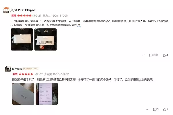 一位手机店主透露,一天之内他就卖出了十多台魅族22。而在魅族京东自营店内,也有大量忠实用户在看到公告后火速下单。一位老用户在评价区深情留言,表示购买魅族22是为了纪念自己逝去的青春,也算是留点念想,祝愿魅族转型后越来越好。