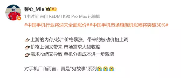 快科技2月26日消息,对于2026年中国手机行业将正式迎来全面涨价潮的消息,小米高管(REDMI产品经理)馨心_Mia在社交媒体上回应了。 这位高管表示,上游的内存/芯片价格暴涨,带来的被动价格上调,而价格上调又带来市场需求大幅收缩。 “需求收缩又导致,单机分摊成本进一步激增,所以对手机厂商而言,真是"鬼故事"系列。” 虽然发言比较简短,但她已经基本上交代了存储暴涨对手机行业的伤害,而厂商提价被逼无奈,这势必会在一定程度上丢失消费者。 在早前我们的报道中提到,供应链人士、行业分析机构及多家手机品牌内部人士表示,3月起,手机涨价将进入加速阶段,新品涨幅最低可达1000元以上。 此外,OPPO、一加、vivo、iQOO、小米、荣耀等主流品牌或将陆续上调老款机型售价,叠加内存成本的频繁波动,2026年中国手机市场或将面临历史上首次一年内多次上调价格的局面。 相关人士表示,这轮涨价不是个别品牌的选择,而是全行业的必然趋势。”目前国内主流手机品牌均已完成涨价方案的敲定,部分品牌已向线下经销商、线上渠道商下发了调价通知。 “从目前确定的方案来看,3月是涨价的关键节点,此前上市的机型调价幅度相对温和,但3月之后发布的新品,涨价幅度将明显扩大,最低涨幅不会低于1000元,中高端旗舰机型涨幅可能达到2000-3000元。”上述人士说道。