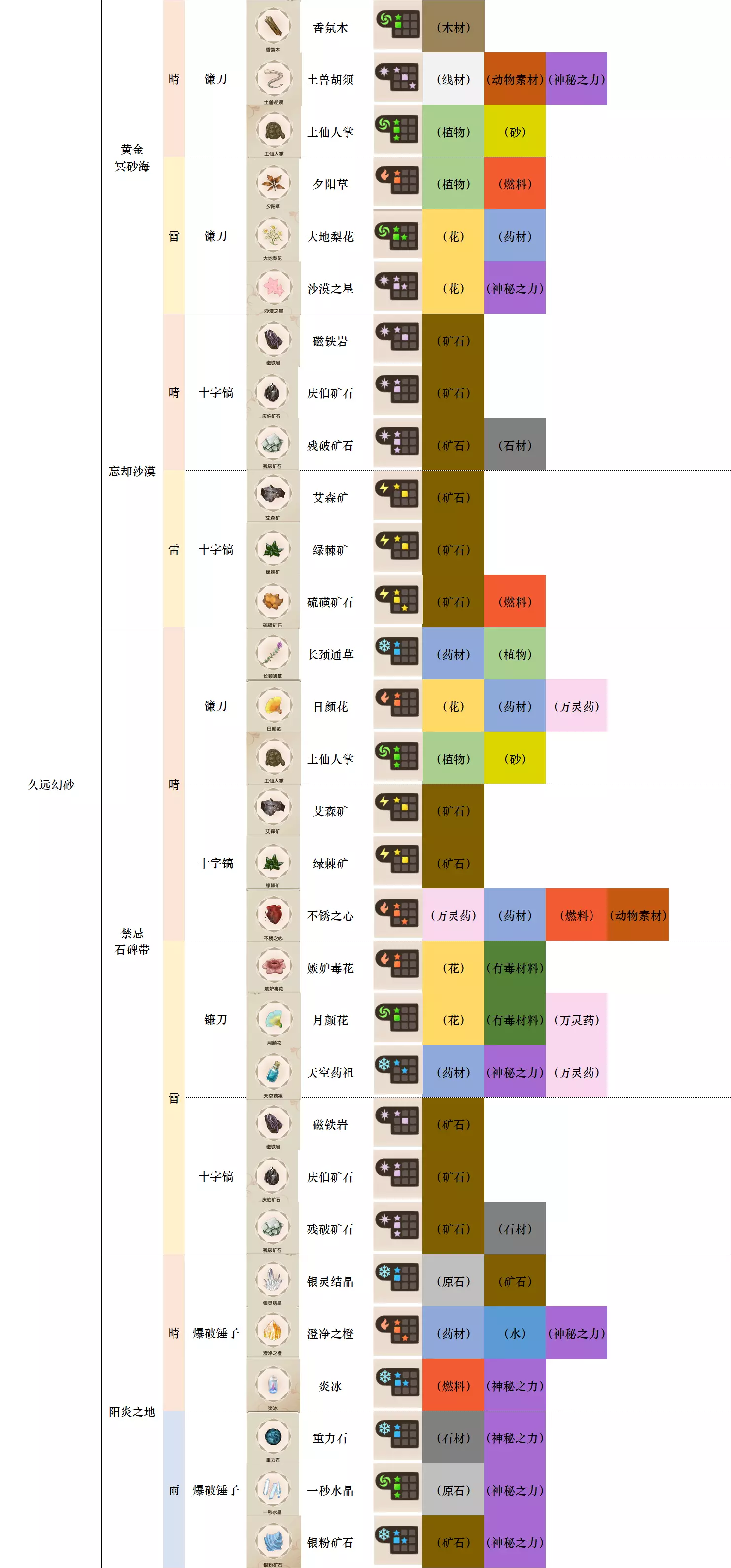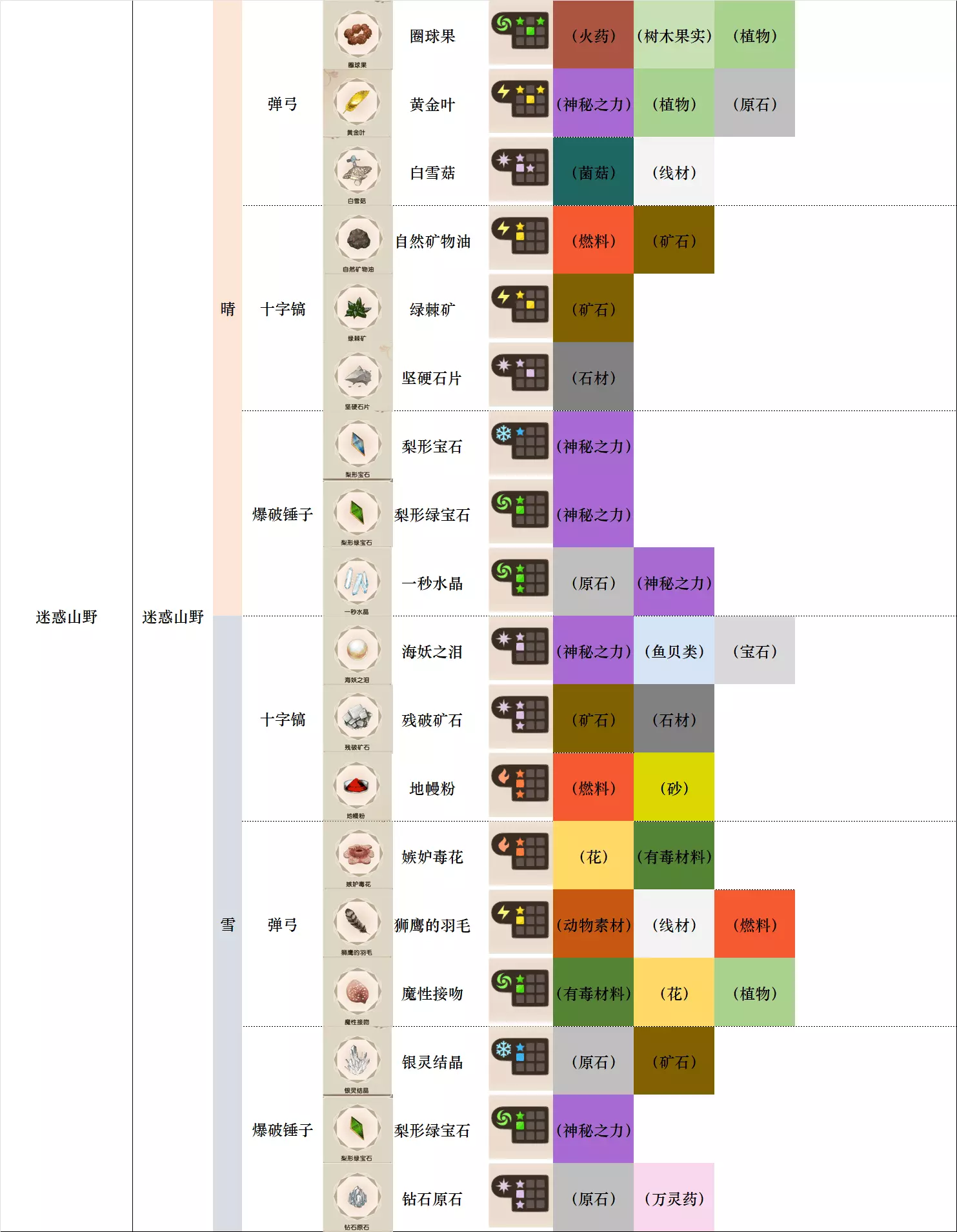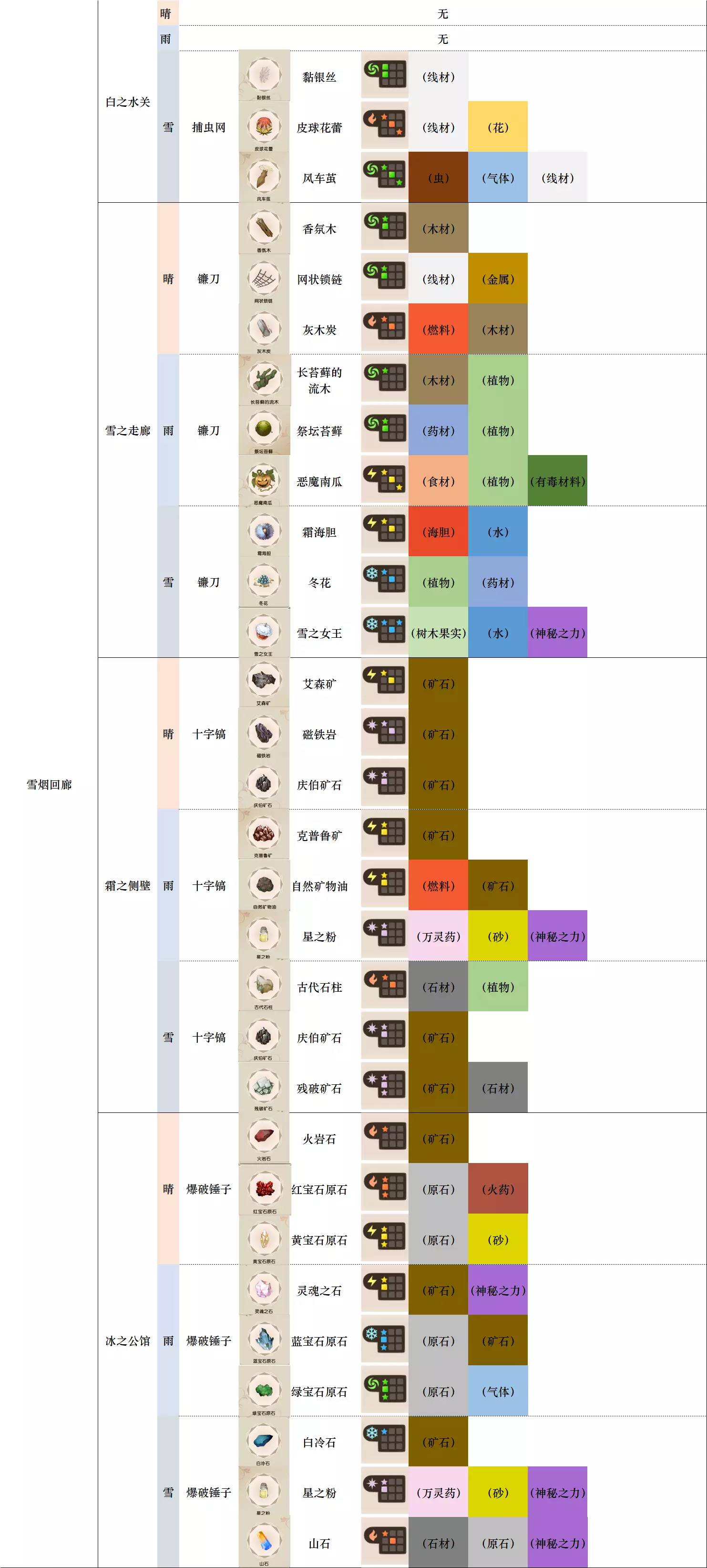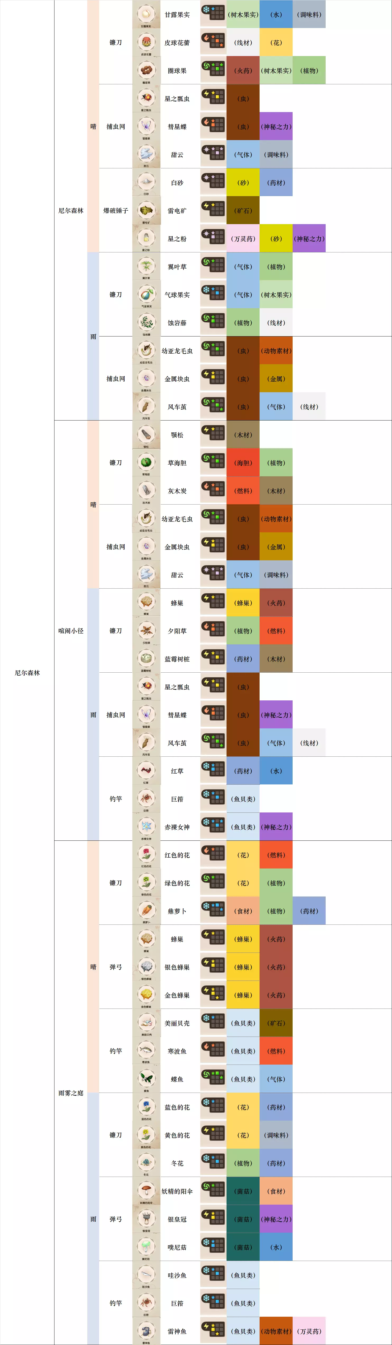 第一列 大地图 第二列 小地图 第三列 天气 第四列 工具 第五列、第六列 素材图标及名称 第七列 素材初始成分(图鉴中第一位为默认成分,非大采集时后三条成分随机) 第八列-第十二列 素材类别 懒得搞得太花花绿绿了,就这样吧。 风抚平原