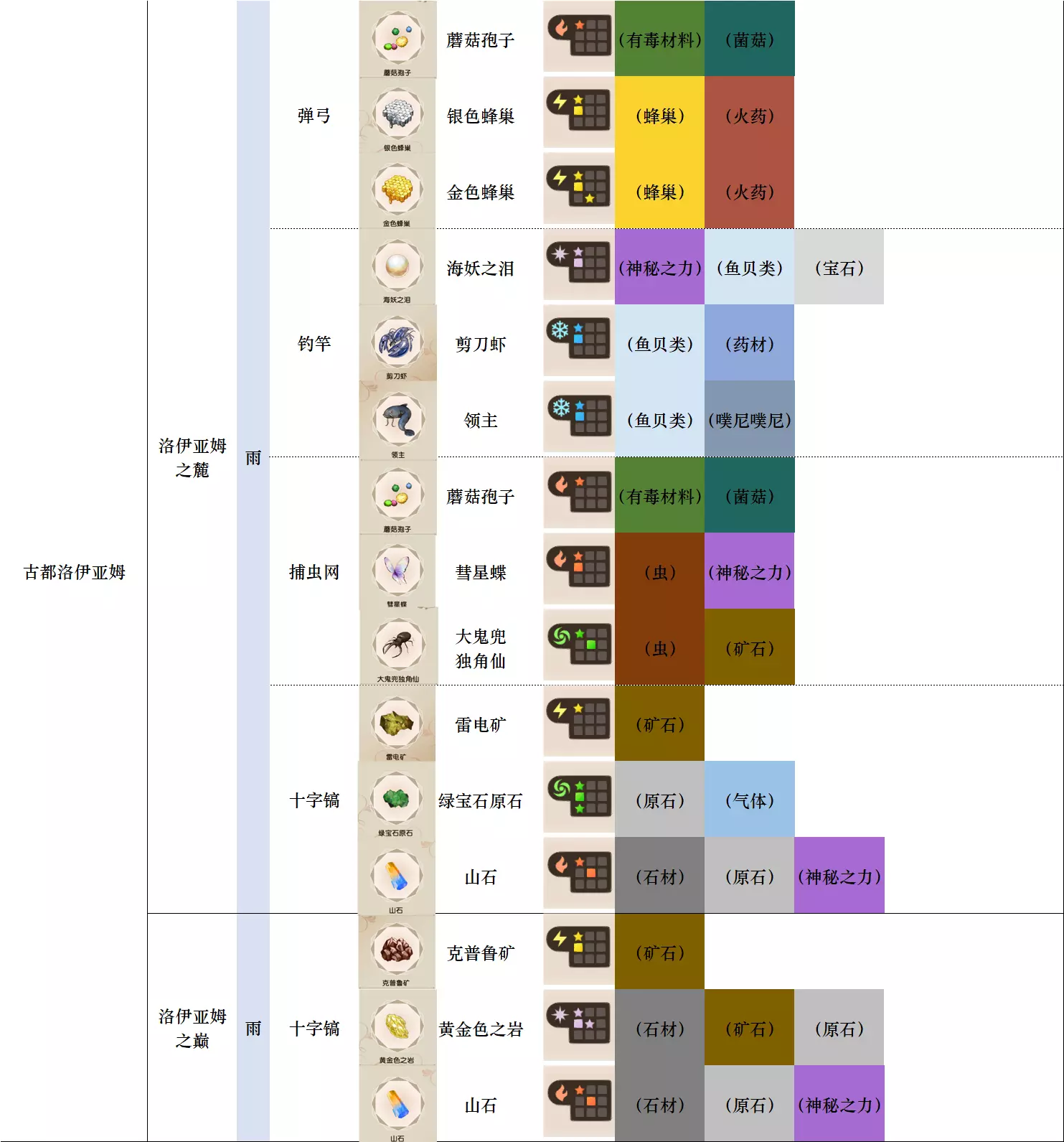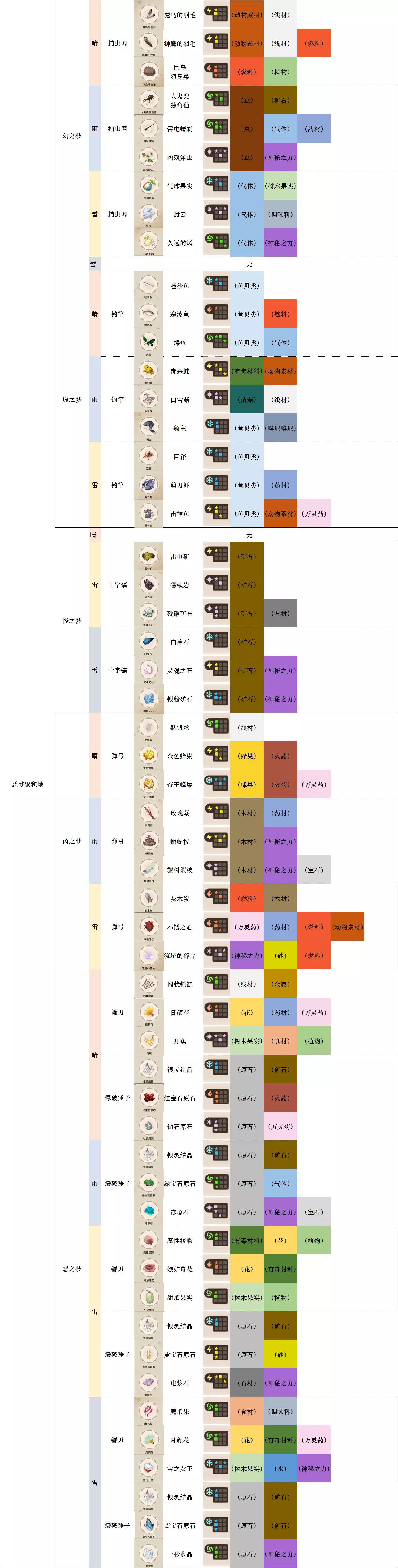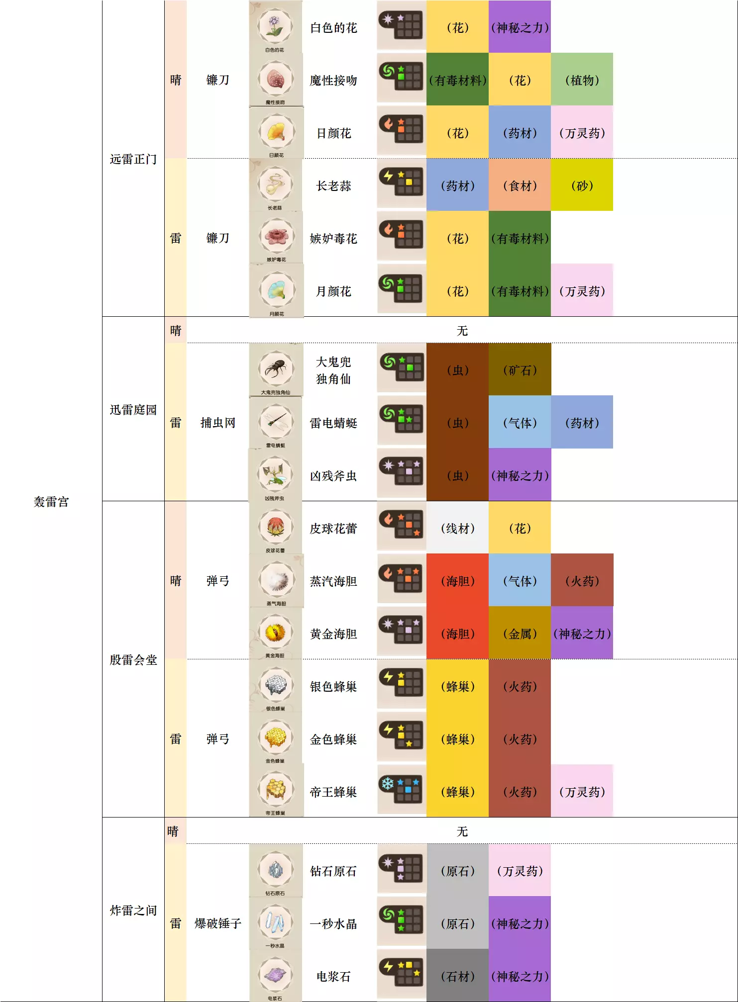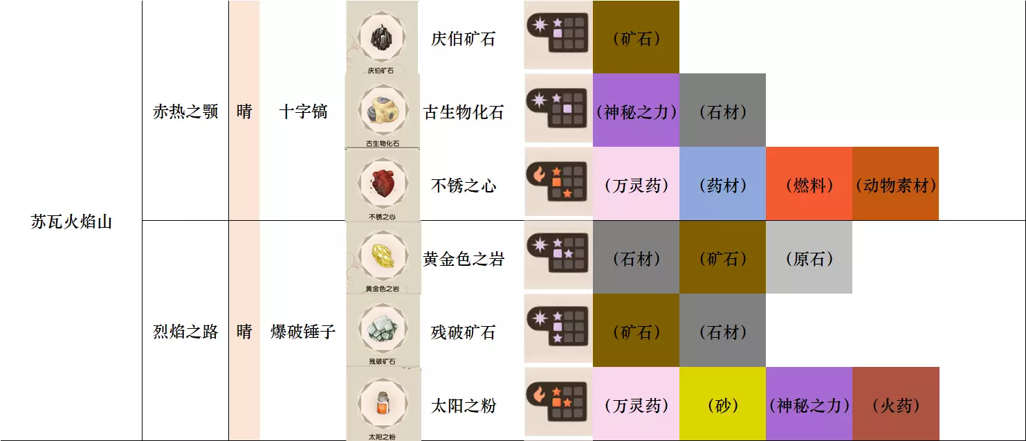 第一列 大地图 第二列 小地图 第三列 天气 第四列 工具 第五列、第六列 素材图标及名称 第七列 素材初始成分(图鉴中第一位为默认成分,非大采集时后三条成分随机) 第八列-第十二列 素材类别 懒得搞得太花花绿绿了,就这样吧。 风抚平原
