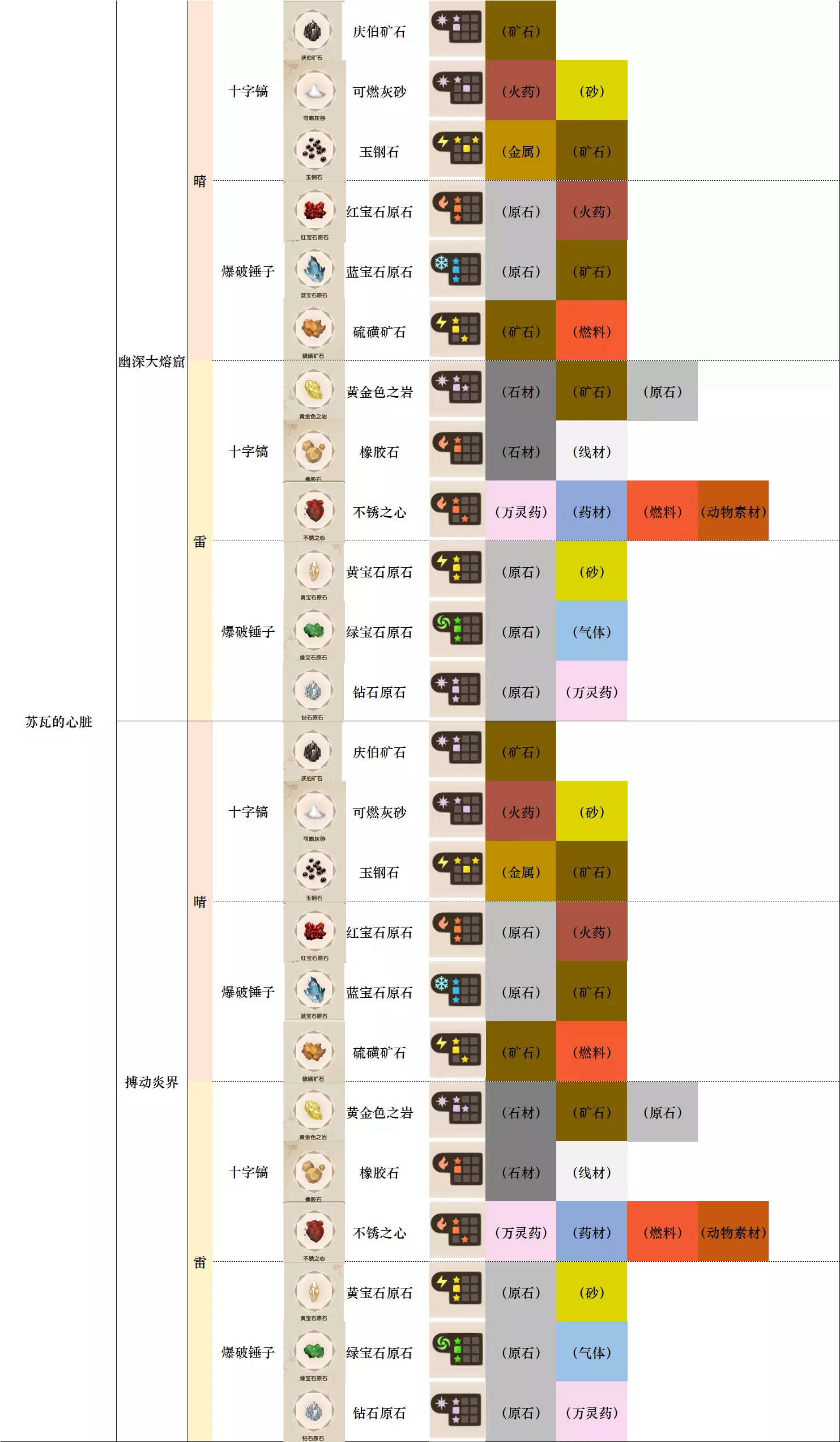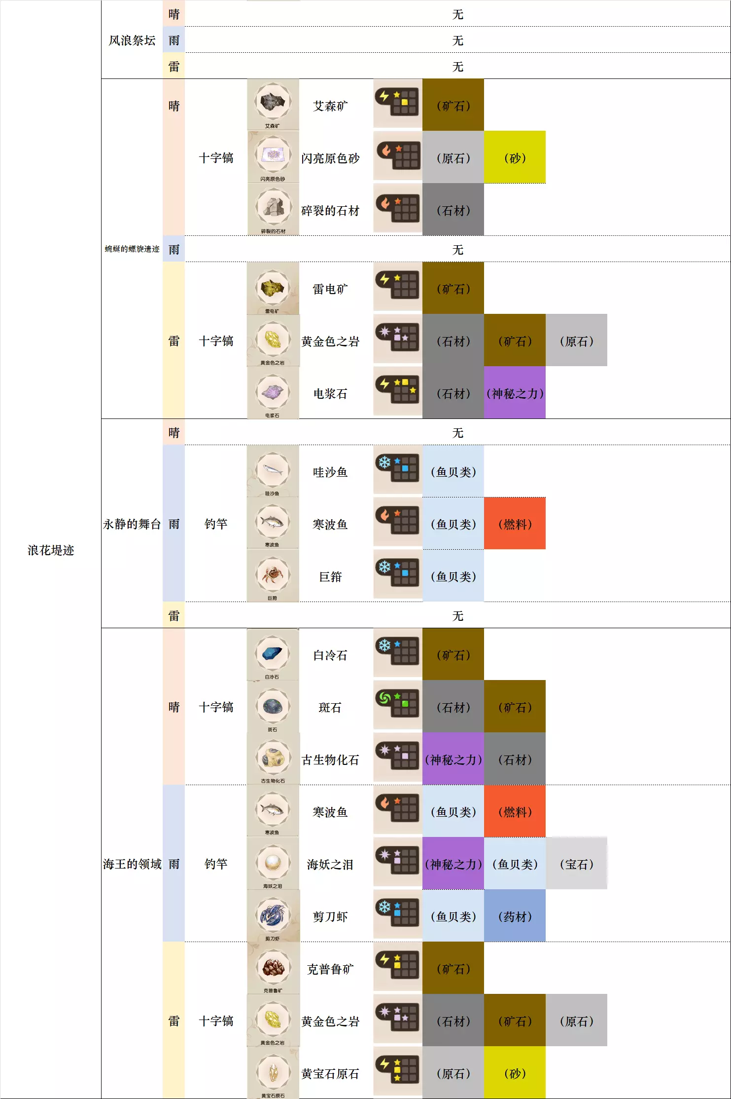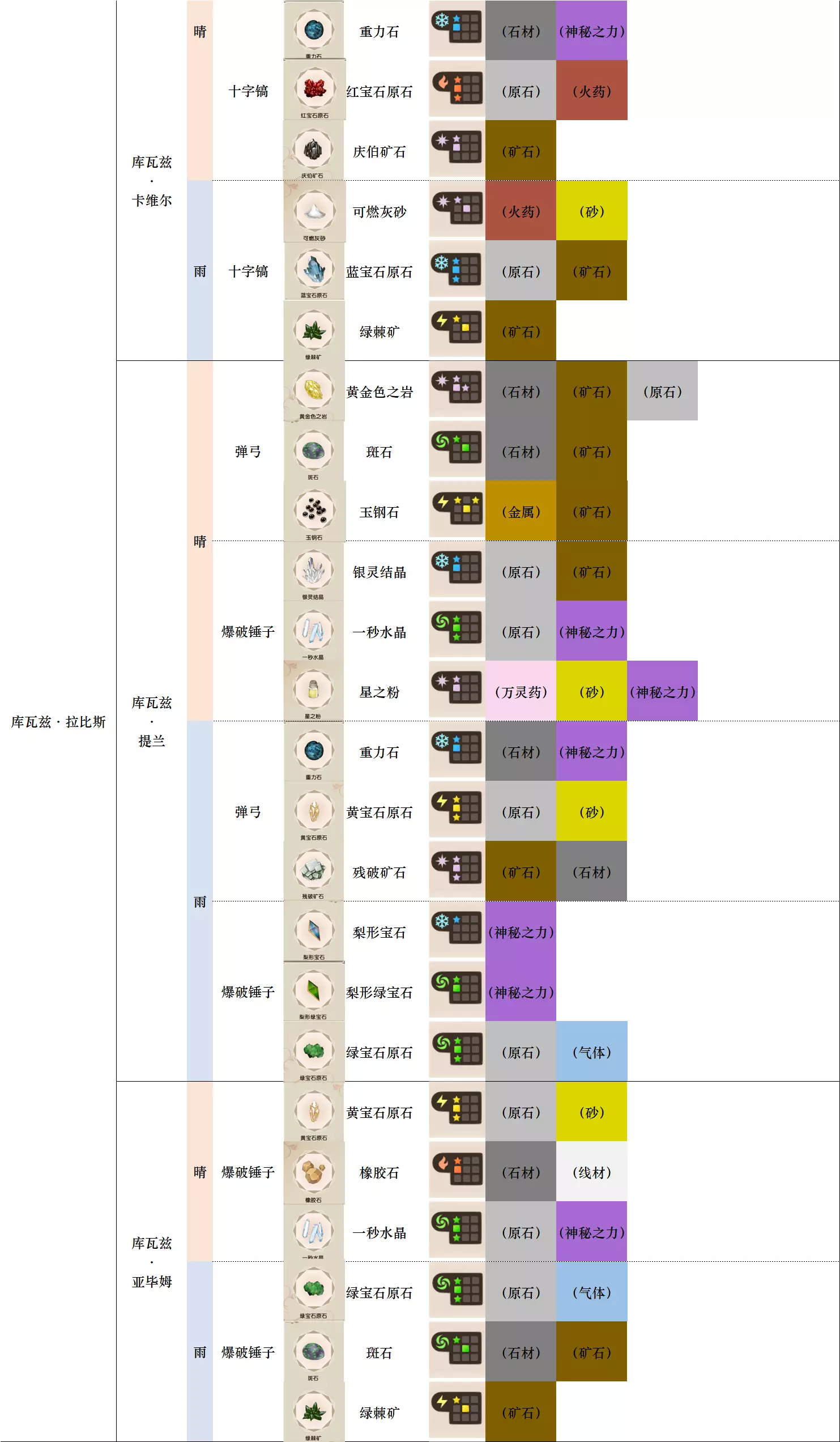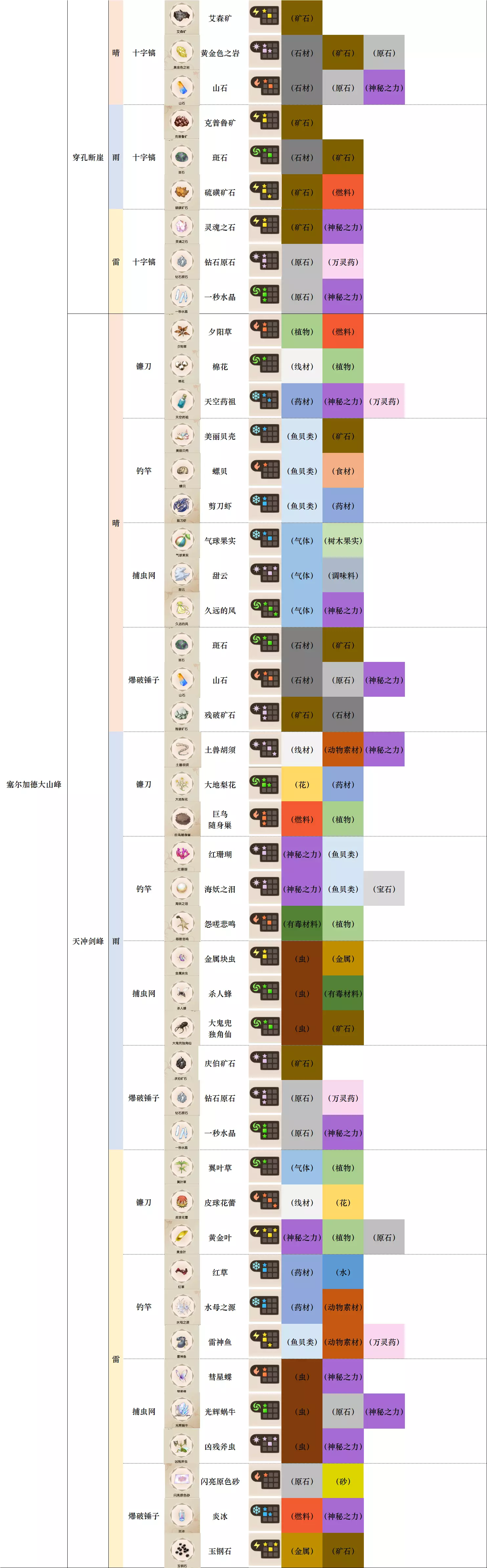 第一列 大地图 第二列 小地图 第三列 天气 第四列 工具 第五列、第六列 素材图标及名称 第七列 素材初始成分(图鉴中第一位为默认成分,非大采集时后三条成分随机) 第八列-第十二列 素材类别 懒得搞得太花花绿绿了,就这样吧。 风抚平原