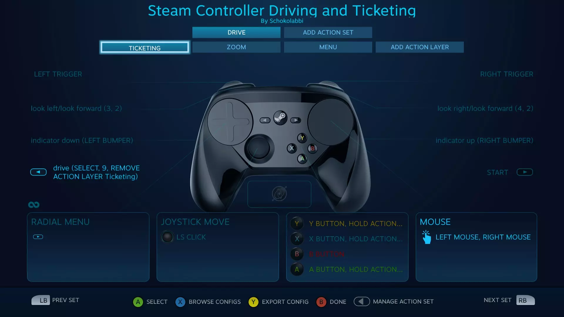 一个旨在扩展默认控制器配置的控制器设置,可访问驾驶和票务功能。 简介 本指南旨在说明如何使用Steam控制器驾驶与票务社区配置,同时也可能为创建您自己的配置提供一些灵感。 要应用此配置,请在控制器配置的社区选项卡中查找,或按Windows键+R,在弹出的运行窗口中粘贴相关内容并执行。 驾驶