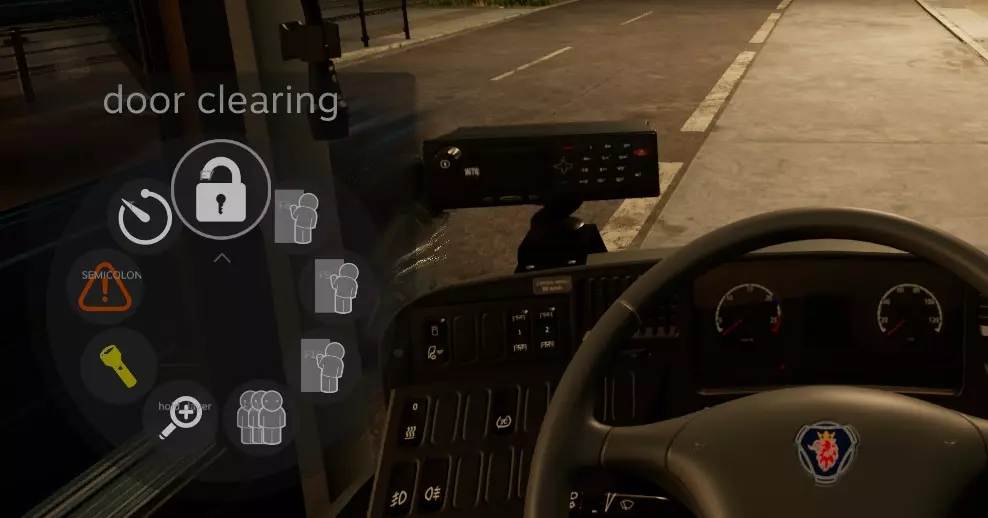 快速访问常用功能,例如: - 车门解锁/后门释放(为下车乘客打开后门) - 单独开关1-3号车门 - 开关所有车门 - 缩放(按住并在触摸板上画圈) 此外,一旦多人模式实装,以下径向菜单功能将有助于与其他司机交流: - 远光灯 - 警示灯(在游戏控制设置中将此按钮重新分配到分号或ö键以使其生效) 遗憾的是,目前似乎还没有配备巡航控制(Tempomat)的巴士,但也许会有开发者看到这条建议并加以考虑。