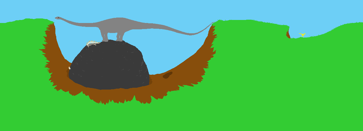 第3关有很多骨头,而且所有动物都是幽灵。要避开黑色三角龙,它们是实体障碍物。其他东西你都可以安全无视。翼龙仍然会掉落蛋;尽量去获取它们,因为它们在你的得分中相当于10个普通蛋。 第4关基本上就是狂暴模式,但有更多血迹;你拥有超强力量,可以撞开遇到的任何动物。关于这一关没什么太多可说的,不过你在完成它时应该拥有3次时间转移。 偶尔你会遇到看起来像这样的障碍物: