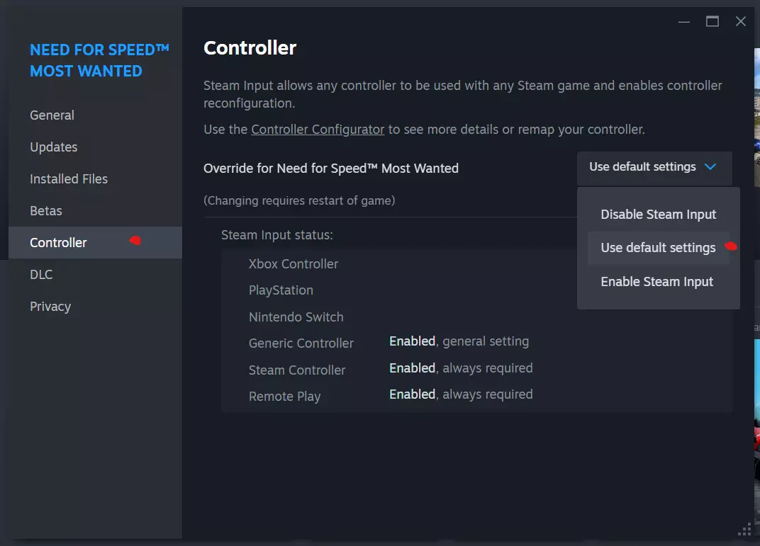 然后进入“控制器”>将《极品飞车:最高通缉》的覆盖设置更改为使用默认设置