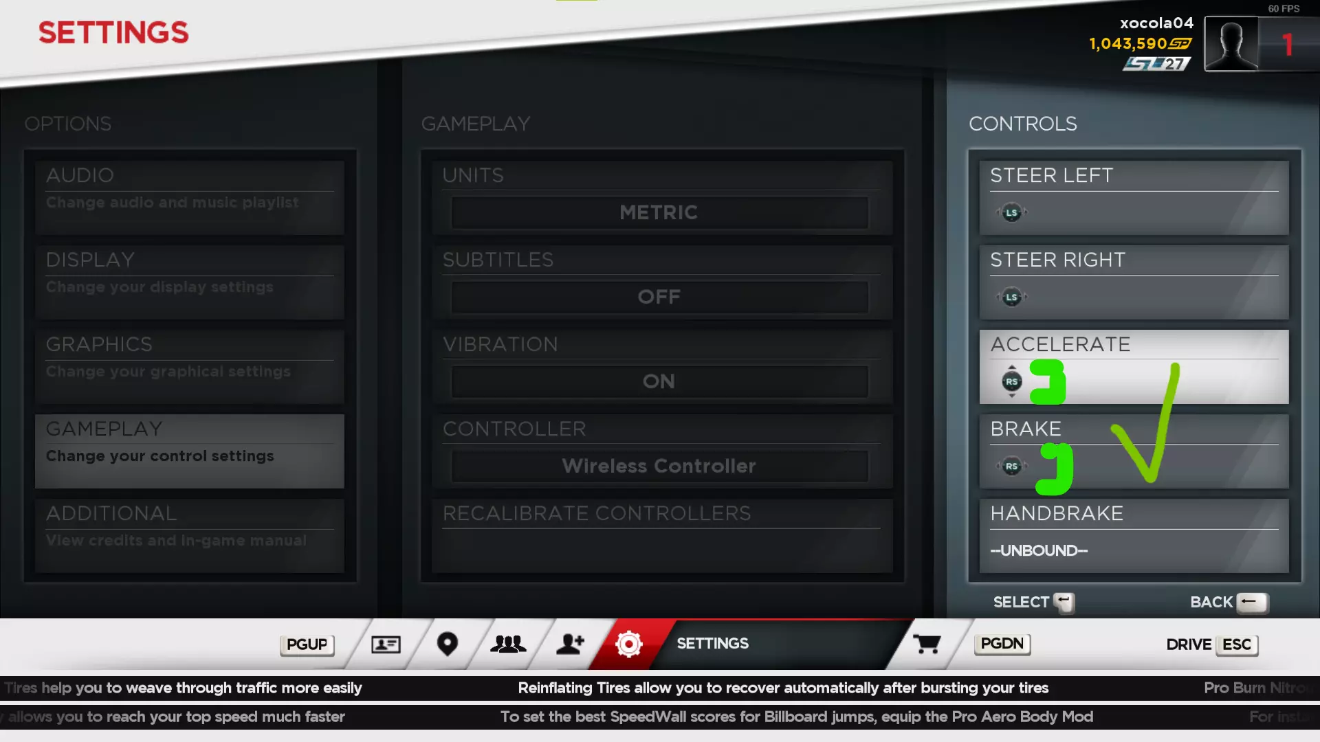 按键绑定 注意:如果你将加速(或刹车)设置为右(或左)扳机键,但按下时显示“按键8(或7)”,请尝试将扳机键完全按到底。此时你应该会看到【RS】标志。