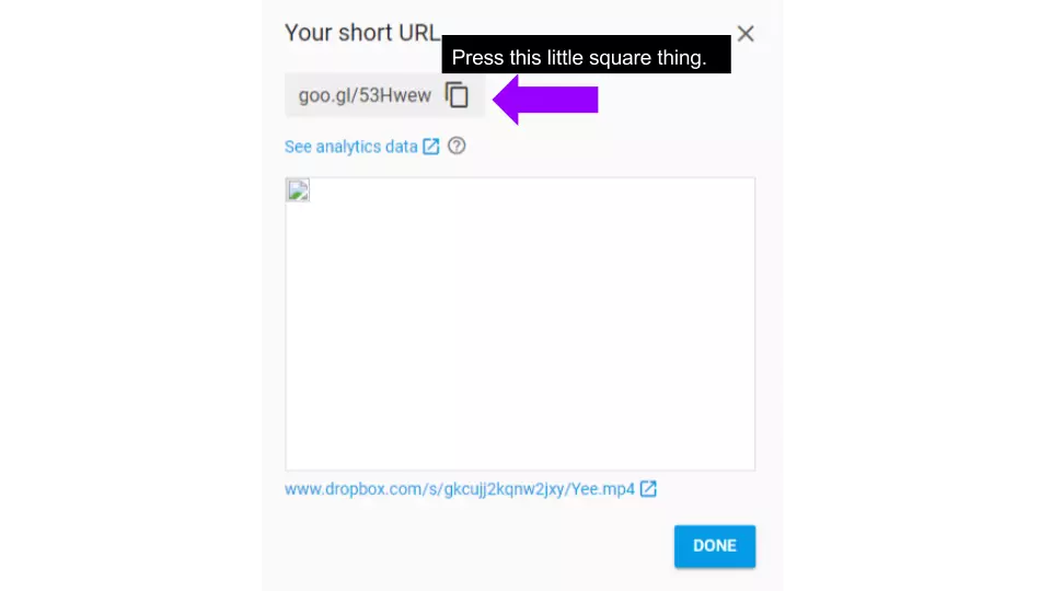非常重要:在URL末尾有“dl=0”的字样,将其更改为“dl=1”。不这样做将导致无法在游戏内流式播放电影。 接下来,点击缩短URL,等待弹出窗口。 复制顶部提供的链接。