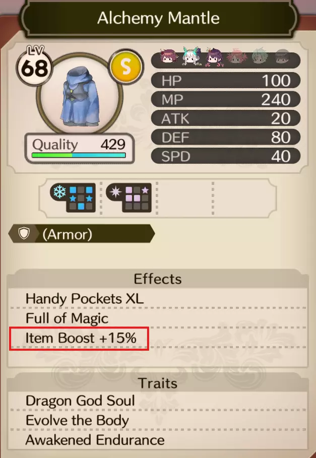 接下来是【炼金术披风】套装,该套装初始增加40点MP,并且有增加物品威力的特性。 重点强化【物品靴】特性至满级。 特性: 【龙神之魂】(增加100点MP) 【身体进化】(增加30%基础状态) 【觉醒耐力】(增加80点HP和MP)