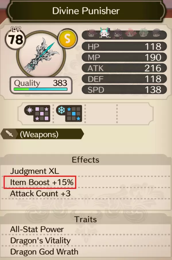 从武器【Divine Punisher】开始 这是普拉芙妲(Plachta)唯一拥有【物品威力提升】效果的武器 重点是将【物品强化】效果点满,除此之外可以忽略 特性 全属性强化(提升所有属性40点) 龙之活力(提升MP50点) 龙神之怒(提升所有属性30点)仅特性合计可获得120点MP