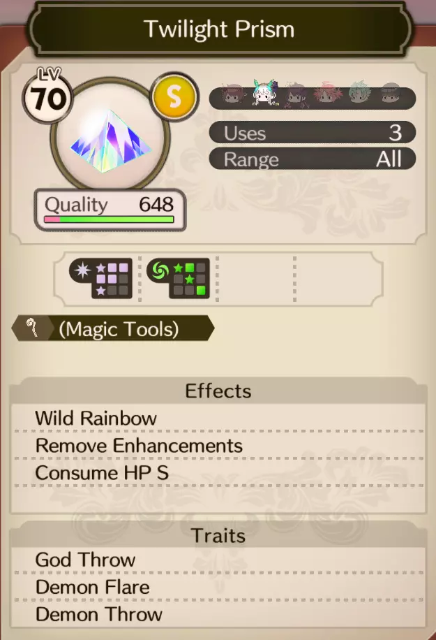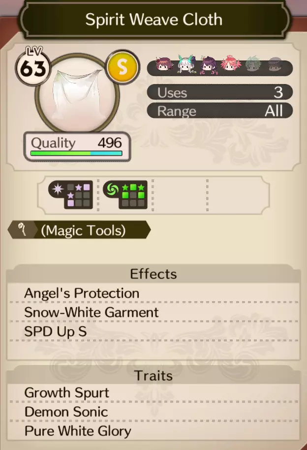 这是一件具有增加速度和防御的效果的道具,而且重要的是,它是阿蕾特也能使用的群体 buff 道具。除了三位炼金术士之外,由于阿蕾特拥有固有技能,当阿蕾特通过任何方式进行 buff 时,获得 buff 的角色有几率减少下一次训练的等待时间,这样就能让我们进行更多训练了。