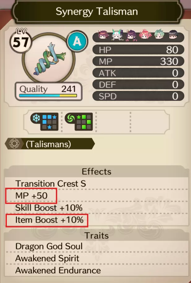 最后是【共鸣护符】,它是唯一同时拥有【MP提升】和【道具强化】属性的护符。建议优先将【MP提升】和【道具强化】属性点满。 特性(类似饰品效果): - 龙神之魂(MP+100) - 觉醒之魂(MP+100) - 觉醒耐力(HP和MP各+80)
