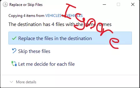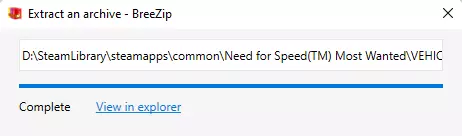 (示例:本地磁盘 (C:) > Program Files (x86) > Steam > steamapps > common > 极品飞车:最高通缉 > Vehicles) 替换文件时,可能会出现提示“此目标包含(2)个同名文件”,你可以进行替换,这不会造成任何问题。