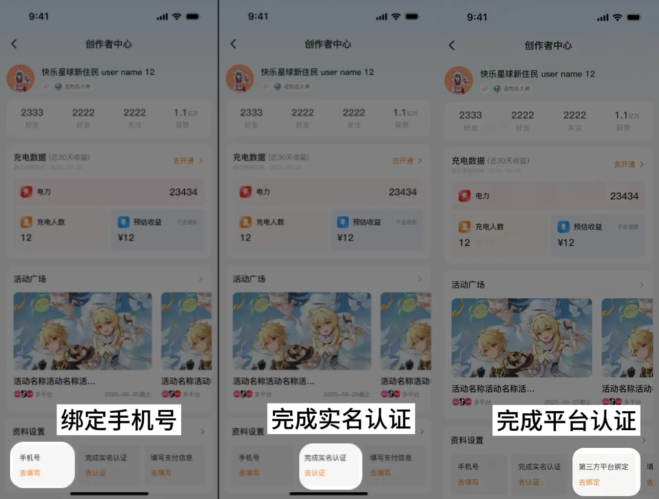 参与活动前,需先完成【绑定手机号】【实名认证】【平台认证】,未完成则无法进入报名环节