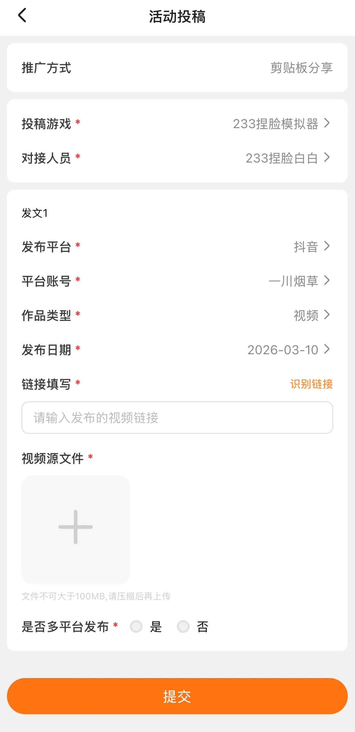 -正确填写信息后,若单个视频推广多个平台,需在表单中选择【是(多平台发布)】,点击【添加发文】按钮,新增投稿链接并补充对应平台发布信息