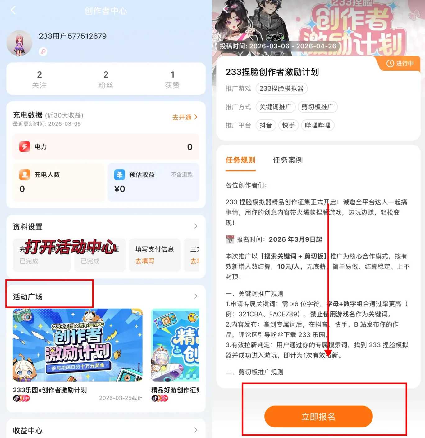 在活动广场页面,即可找到【233 捏脸创作者激励计划】,点击即可报名参与!