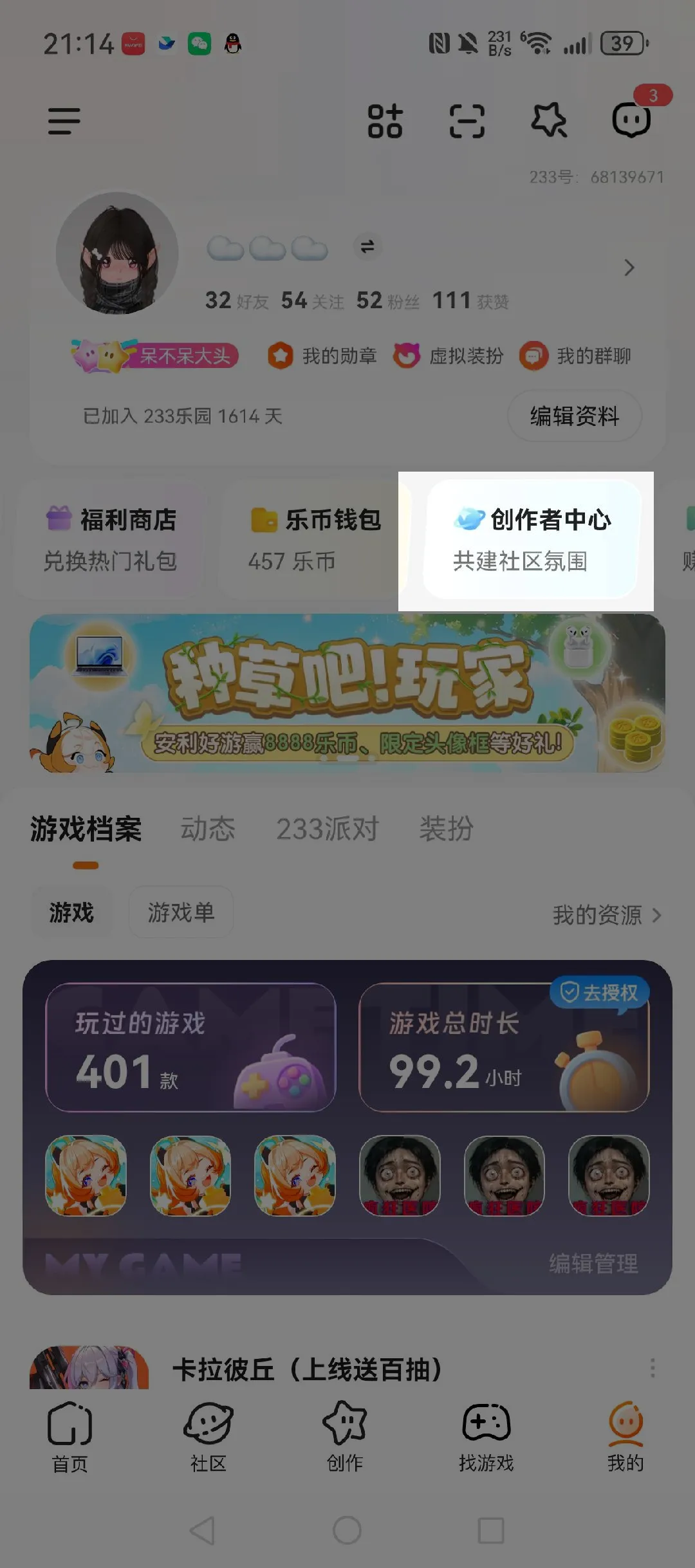打开 233 乐园 APP,点击底部导航栏【我的】,进入后选择【创作者中心】