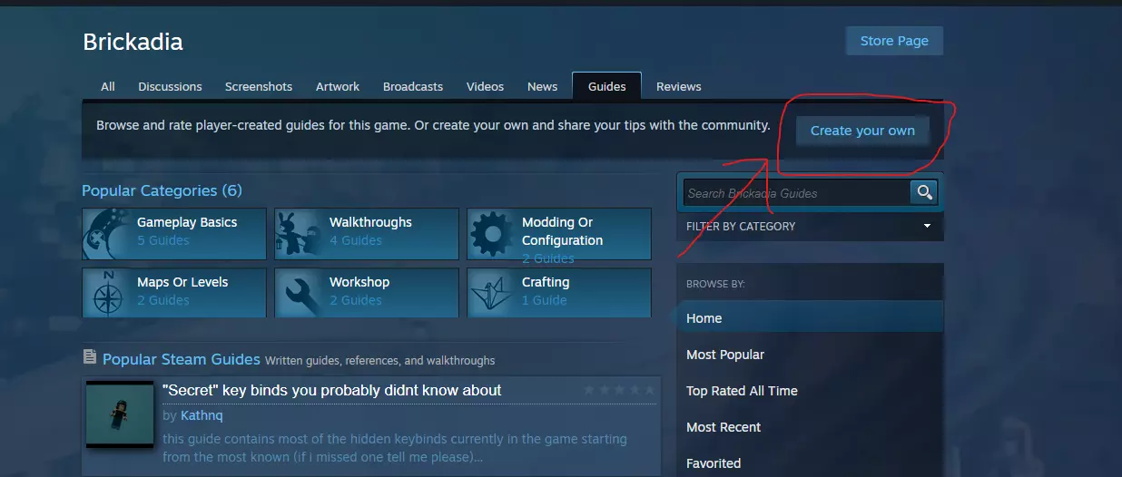 一份教你如何创建自己的《Brickadia》指南的教程! 序章 大家好!我发现这款游戏严重缺乏指南,希望能解决这个问题。 希望这能帮助大家增加对游戏各个方面的了解! 【指南正文】 第一步是进入游戏页面,找到这里的“指南”按钮,点击它。