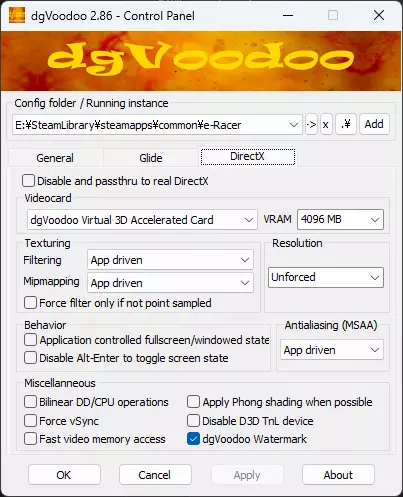 DirectX 选项卡: 若你想移除游戏内水印,取消勾选【dgvoodoo 水印】即可。