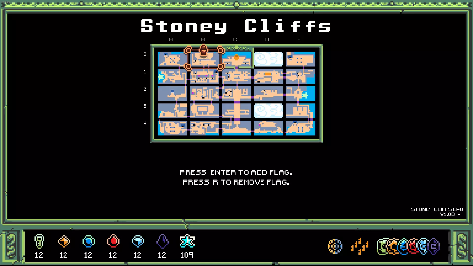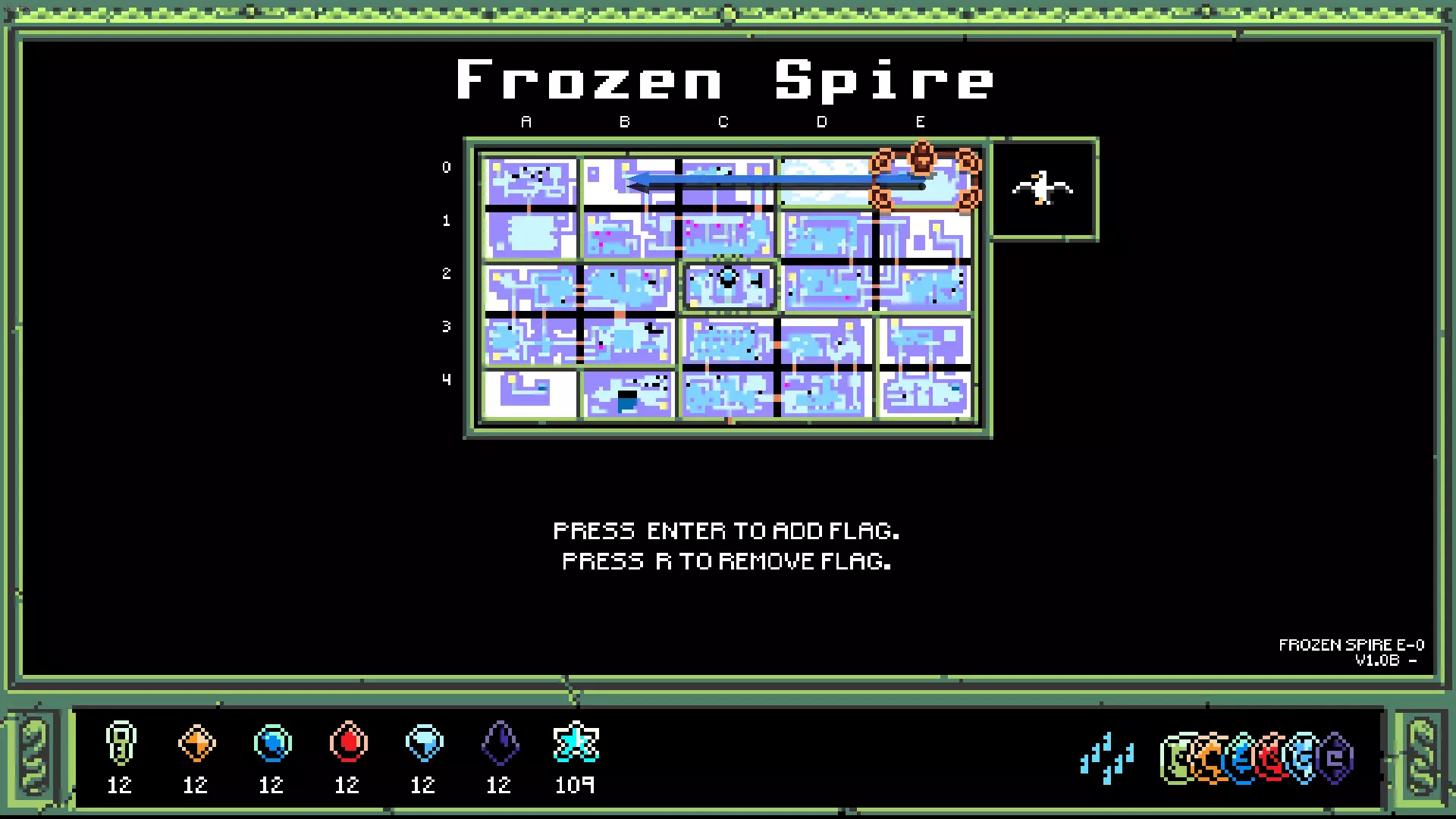 冰冻尖塔之翼 可以让你径直滑过1格宽的孔洞 该翅膀位于A0房间,此房间仅鸟类可进入,且不同存档文件中鸟类的连接是随机的。获取它必须先拿到蓝色钥匙。 提示:检查其他三个角落,那里有三座【小房子】。门上的图案是岛屿地图。在每个标记的房间里,有一块地砖的图案与众不同,去查看它。