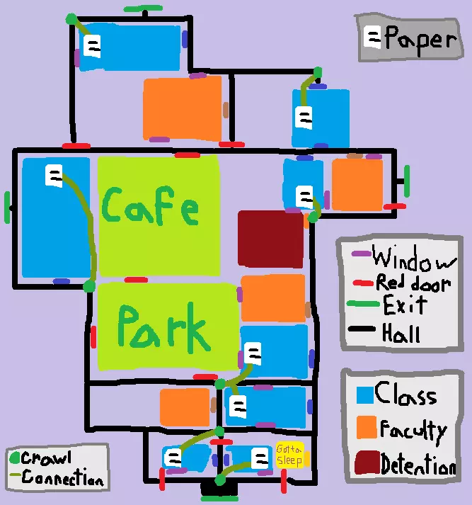 这是一张实用且仅有部分不准确的地图,适用于任何模式,并且可以保存和修改以添加你需要的任何信息。 剧透警告!——剧透内容会放在指南末尾。我只推荐在你玩细胞模式遇到困难时查看本指南,因为不亲自尝试就直接阅读攻略可能会让所有乐趣荡然无存。 剧透确实没什么意思,但卡关且得不到足够帮助更没意思。如果你只阅读剧透部分之前的内容,就能获得最佳体验。剧透部分会在细胞阶段2开始前不久出现,因为从那里开始,细胞模式的所有内容都很容易独自通关,而且包含大部分剧透。我会刻意在之前的部分省略任何剧情剧透,所以那些内容可以放心阅读。“剧情剧透”指的是对话、事件以及故事各部分的关联方式,这些内容会推迟到细胞阶段2之前及之后才会出现,并会伴有相应的警告,以防你忘记或没有意识到。 进入细胞模式 要进入细胞模式,你需要获得前四个成就: Trophy of Failure(在答错所有问题后赢得普通模式) Trophy of Raw Skill(赢得困难模式) Trophy of Resilience(在启用所有修改器的情况下赢得修改器模式) Trophy of Unknown(赢得作弊者模式) 原始指南中包含获取这些成就的信息和提示,因此请参考该指南来获取它们。 细胞模式初始敌人 细胞模式开始时是正常的(戴夫甚至会这么告诉你!),但一旦你不可避免地答错一个问题,戴夫就会消失,灯光也会变暗。牢房模式拥有独特的敌人,每个敌人在禁闭室都有自己的海报(即使从牢房模式进入作弊模式,这些海报也不会消失)。 敌人只会在你拿起试卷时做出反应,而不会在你答题时有所动作。即使答错题目也不会有任何变化,并且答错第一道题也不会让敌人提前出现。 每个敌人都会发出特定颜色的光芒,光芒范围较短(向各个方向延伸1格),且光线会透过附近的墙壁。它们各自都会播放独特的声音。 在牢房模式之前有三种敌人类型,它们也是牢房模式中仅有的其他敌人。 每个敌人会在你拿起一定数量的试卷后开始生成,并且在你之后每拿起一张试卷时都会再次生成。 地窖幽灵:可以有多个,并且可以消失。从第2/8张试卷开始出现。 爬行怪:只有一只,每张试卷会刷新一只,且不会消失。从第3/8张试卷开始出现。 蠕动怪:可以有多个,并且会消失。从第4/8张试卷开始出现。 这些敌人无法透过门或窗户看到你,即使门是开着的或窗户是破的,并且每个敌人都有自己简单的机制和一些特殊之处。它们都无法打破窗户。爬行怪不会消失,但地穴怪和蠕动怪会消失,即使你就在附近。它们会在一定时间后消失,但前提是它们没有在追逐你,并且刚到达它们想要转弯的角落。每个敌人都可以追逐你,但没有任何指示器显示它们何时开始追逐你。他们都会忘记你,而且如果过一会儿看不到你,大多数就会停止追逐,但爬行者会一直保持警惕,直到你拿到新的试卷,它会等着看到你后再次开始追逐。 锤子对他们都没用。相信我。 地窖