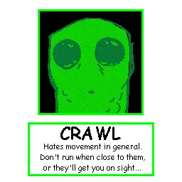 在你拿起第二张试卷后,每拿起一张试卷,爬行怪就会在固定位置生成,每张试卷都有几个可能的生成位置。与其他敌人不同,爬行怪只有一个,且不会消失。从v1.1.0版本开始,它们会每隔一段时间传送到离你最近的位置。如果你在离它们非常近的地方奔跑,它们就会被惊动。如果你在它们视线范围外的区域奔跑,它们会等到看到你时才开始追逐。它们不会进入房间,而是会在门外或窗外等待。除非它们在房间外看到你,否则不会再次追逐你。它们的视野极远,移动速度比你奔跑的速度稍快。即使你只是走进它们,它们也能抓住你,所以有时它们可能会挡路,迫使你绕行。如果你惊动了他们,当你拿起另一张试卷时,他们就会忘记你。 技巧与窍门:追逐过程中,如果你离开他们的视线范围,他们会前往最后看到你的地方,并等待你再次进入他们的视线后继续追逐你。 你处于隐身状态时,他们无法抓住你。不过,即使爬行怪看不到你(例如你在墙后或处于隐身状态),在爬行怪附近奔跑仍会激怒它们,尽管在看到你之前它们不会移动。 如果它们在你的门外等待,且没有其他出口,你可以用锤子打破窗户并悄悄离开而不被它们发现。如果它们在窗外,你或许可以直接从门离开。只有当它们挡路时才会真正成为问题,如果没有【橙色苏打水】或者你无法将它们推到别处,就必须改道。它们对奔跑的容忍范围非常短,大约相当于它们的光照范围,如果你在离它们这么近的地方还需要奔跑,那你很可能已经无路可逃了。 【地穴爬行者】和【爬行怪】很少会在【爬行】状态下卡住(在v1.1.0版本前这很常见)。当这种情况发生时,卡住的敌人不会消失,只有当它们看到你在身后时才会追逐你。获取新的纸张会传送【爬行】区域并解除任何敌人的卡住状态。