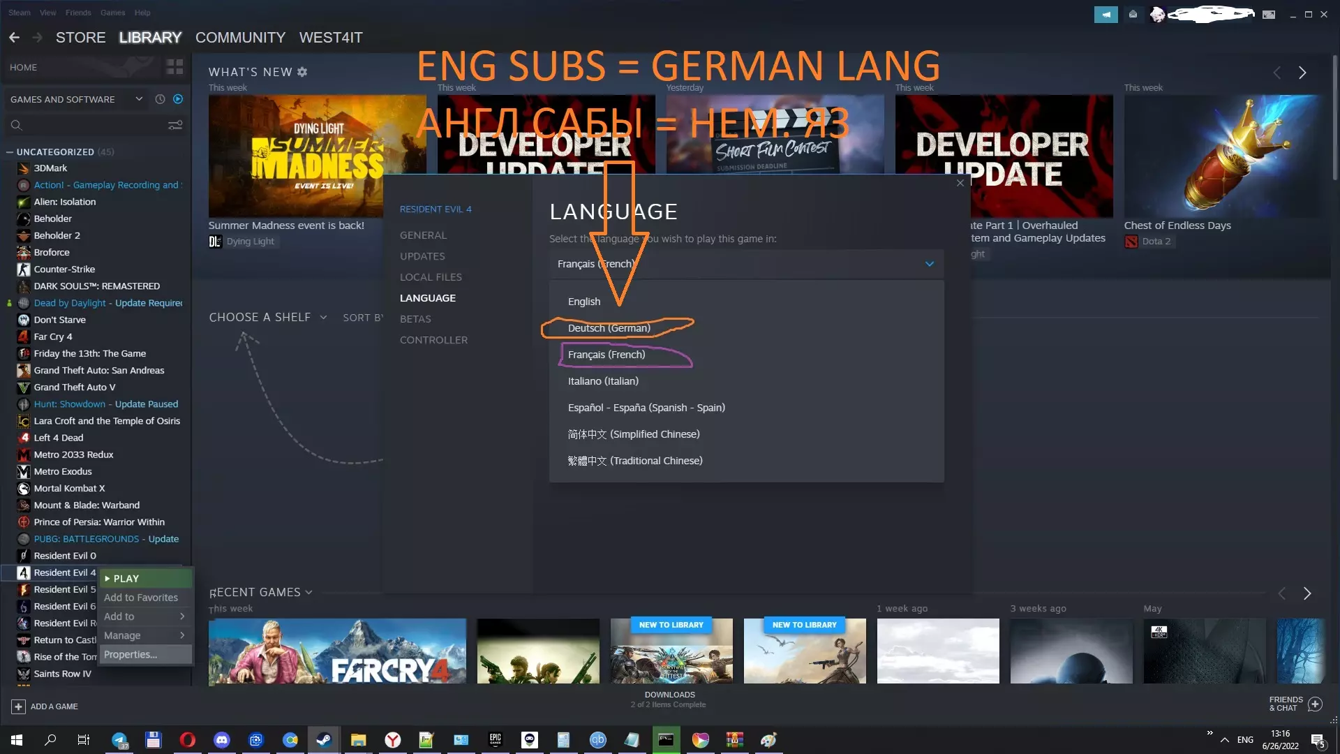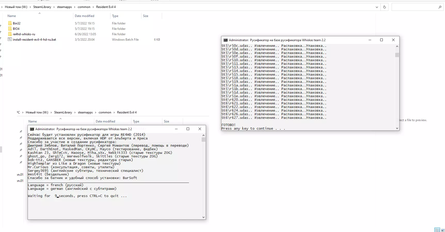 右键点击install-resident-evil-4-hd-ru.bat文件,选择以管理员身份运行。等待安装完成,期间不要关闭窗口。安装时间通常不超过三分钟,具体取决于电脑配置。进入库中并将游戏语言更改为所需语言 库 - 属性 - 语言 - 选择所需语言进行游戏 为避免安装过程中可能出现的错误,建议(非必须)取消勾选“tools re4hd-whisks-ru-en tools”文件夹的“只读”属性,最好对整个游戏文件夹和整个汉化补丁都执行此操作!