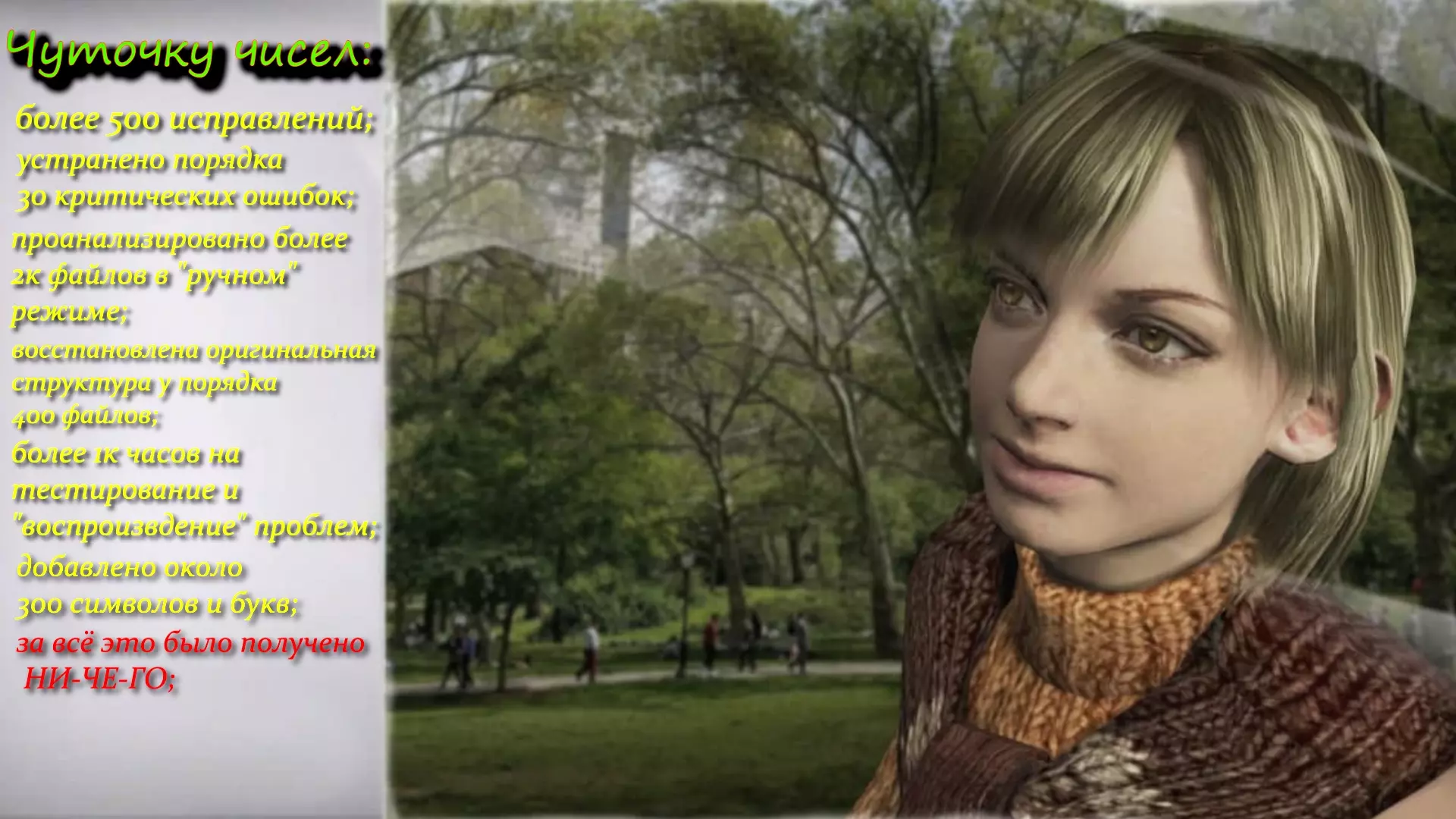 已修改FRENCH_WIN32.dct文件。 修正了“显示器的愤怒”等拼写错误。 调整了文件结构,现在右Shift键及其他文字均可正常显示。 基于英文文本重制了文字内容,修复了换行、断行问题,优化了翻译及文件结构(例如之前无法显示的含“氮”和“湖”的文字)。 重制了商人的物品及商品,新增了火箭筒、鸡蛋的描述。修复了文本错误和换行问题。 基于英文版本重新制作了字幕,删除了无意义内容(例如“牛仔,你该去别的游戏!xD”)。 重新处理了报告内容,艾达新增了原本存在但未翻译的文本。字幕以正常速度显示。 修复了对讲机对话,删除了无意义内容,修正了“汉尼根”的翻译。 统一了同一文本不同翻译版本的文件。 修正了商人的台词。《生化危机4》更新内容 1. 【陌生人】现在随处可见。 2. 修复了俄语菜单中文字显示问题(此前显示异常)。 3. 修复了手柄控制相关的纹理。 4. 修复了带文字的纹理(角色虚构相关内容),现已添加透明通道。 5. 修复了键盘QTE按键(如回车键等)的显示问题。 6. 重绘了【雇佣兵】的标志。 7. 修复了从村庄(通往城堡的大门处)离开时的崩溃问题。 8. 背包中使用了其他字体。 9. 调整了游戏文件(文档)。修复了换行和断行问题,添加了字母“ё”。 添加了主要路径的俄语纹理。 添加字母“ё”和“Ё”。 重新绘制了带有“ё”的菜单纹理。 新增设置和手册的纹理。完全根据HD版的原始风格(字体)重新制作了语言界面的图像: 主要游戏:全新的界面语言图像(物品栏、地图、商人、射击场)。《生化危机4》更新内容: 1. 修复了部分纹理的翻译,纹理拉伸问题已解决。 2. 【地图】模式下的按键标识适配俄语键盘,避免了操作混淆。 3. 重绘了主菜单及所有附加模式的选项。 4. 佣兵模式:重新设计了标志(所有字母高度统一),并重绘了角色选择和竞技场界面。 5. 视频画廊:重绘了画面。 6. 排行榜:重绘了画面(测试版)。俄语本地化补丁已部分清理冗余文件。解压后的压缩包体积减少了500MB。